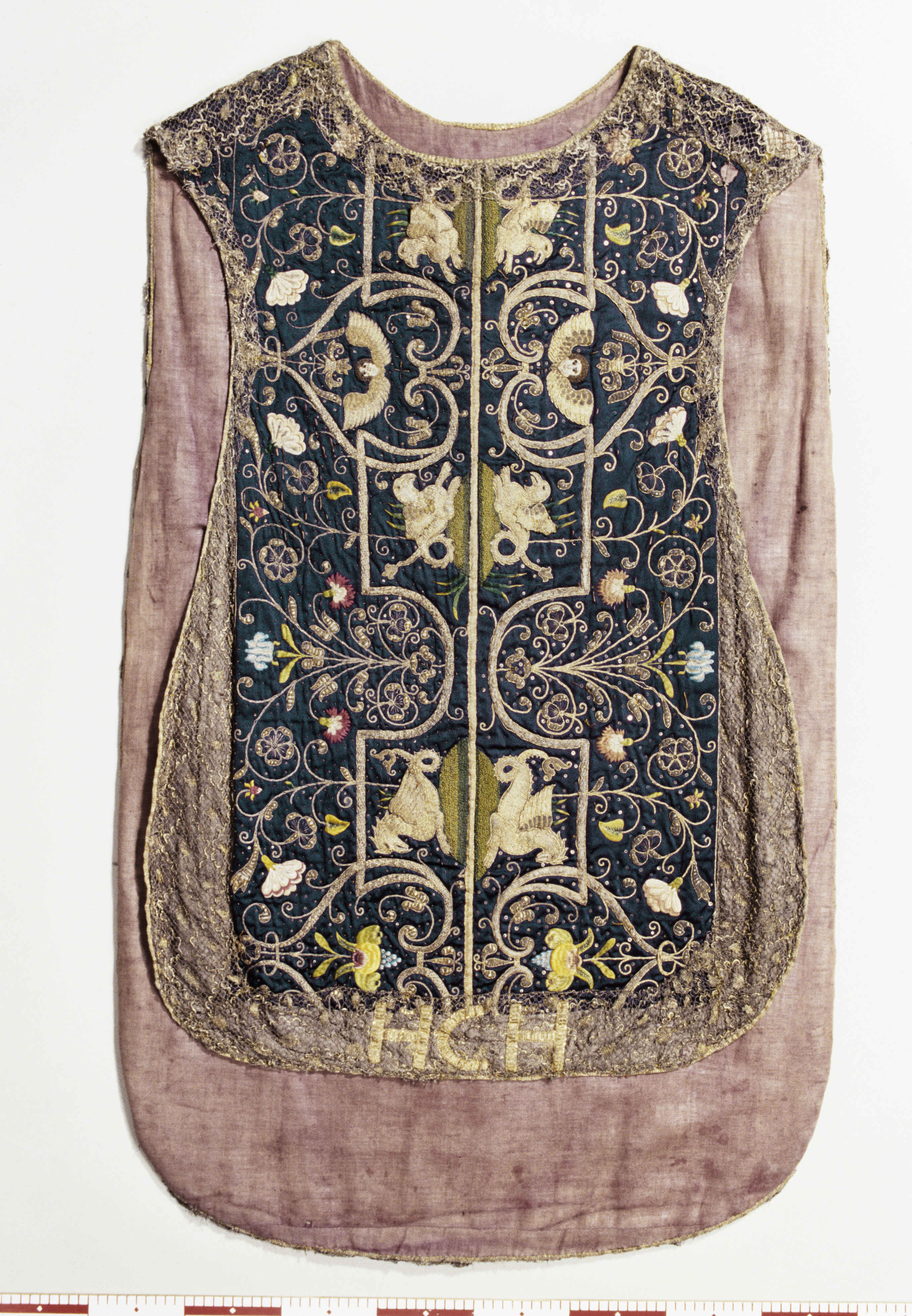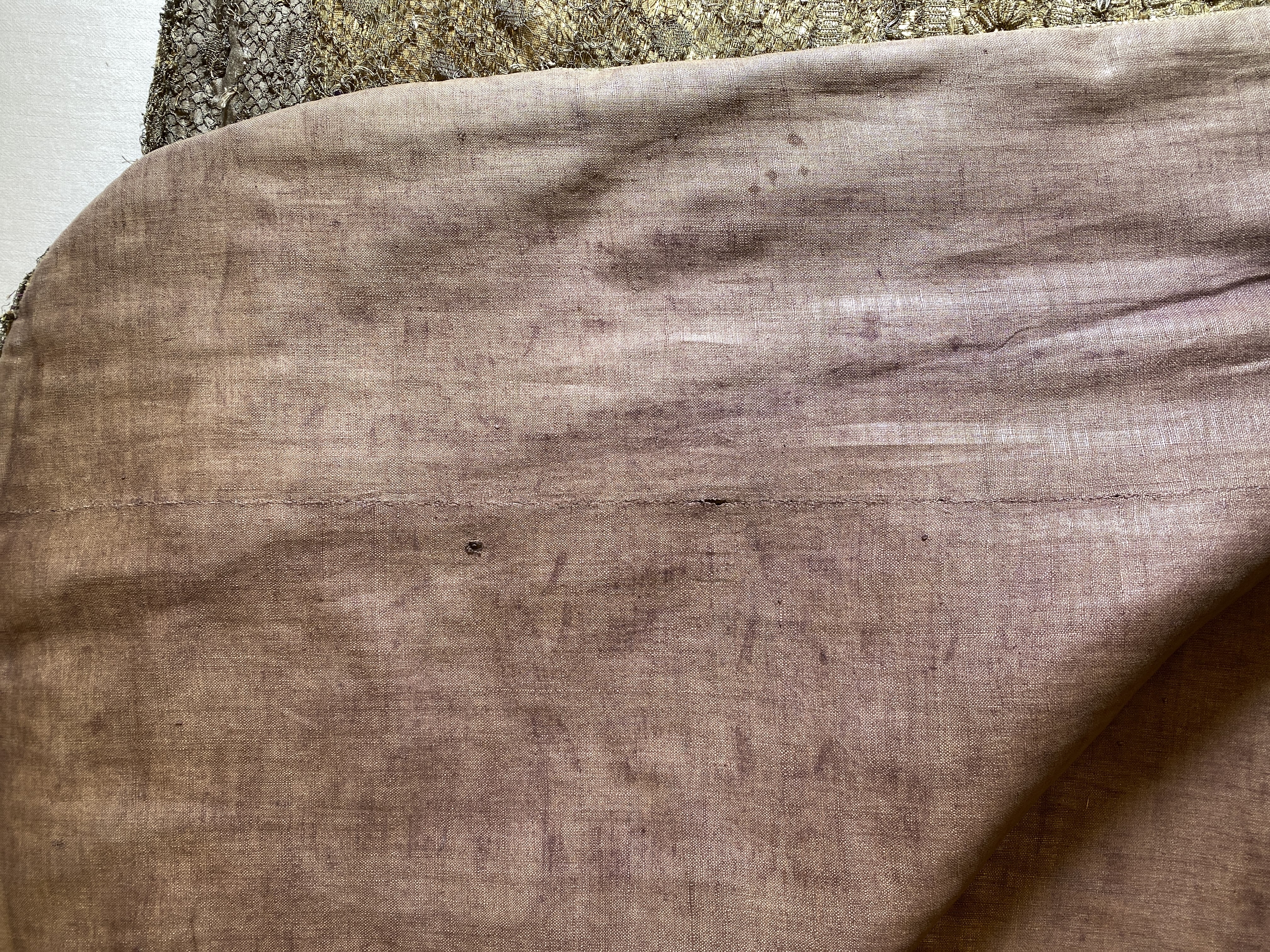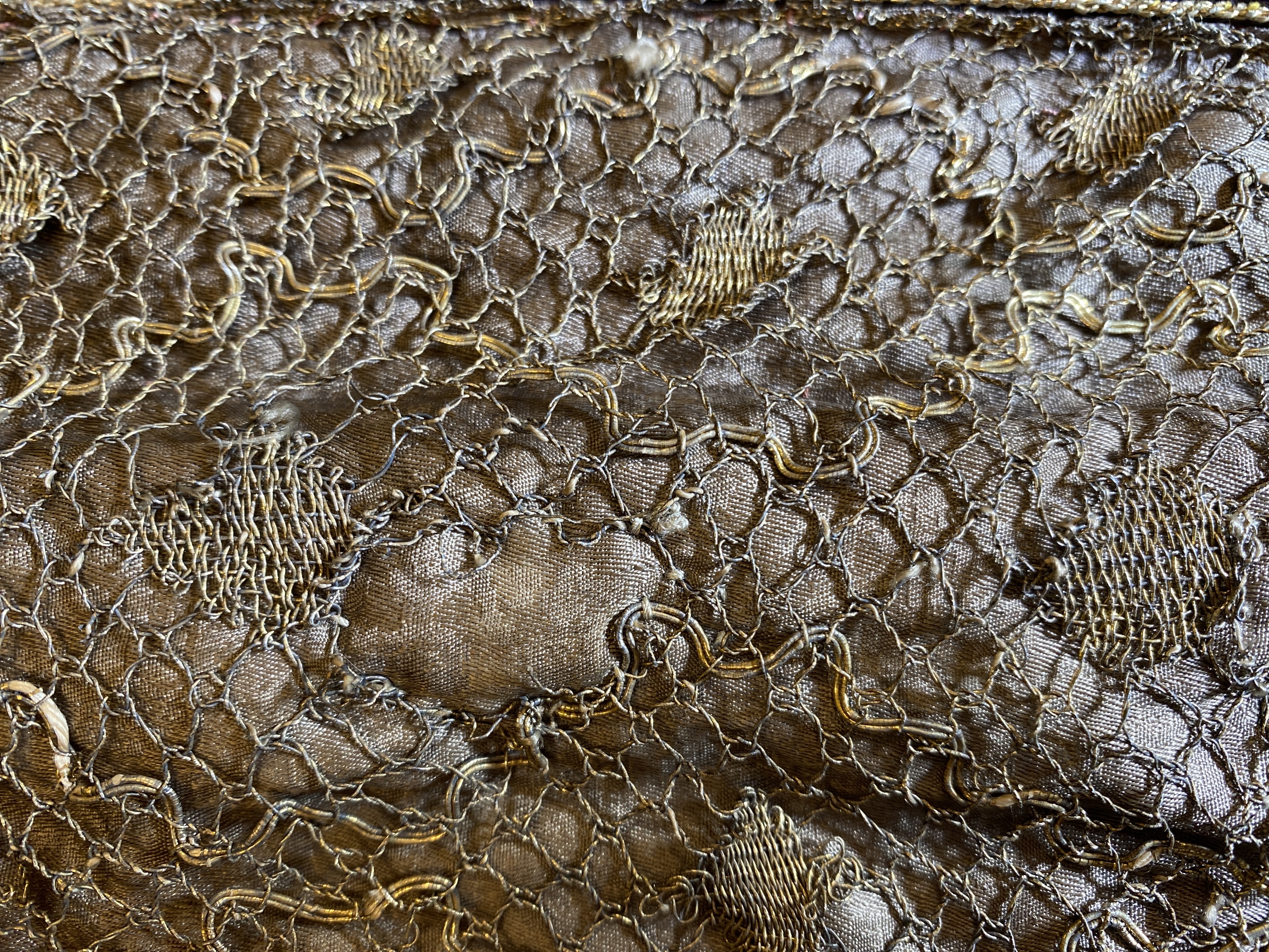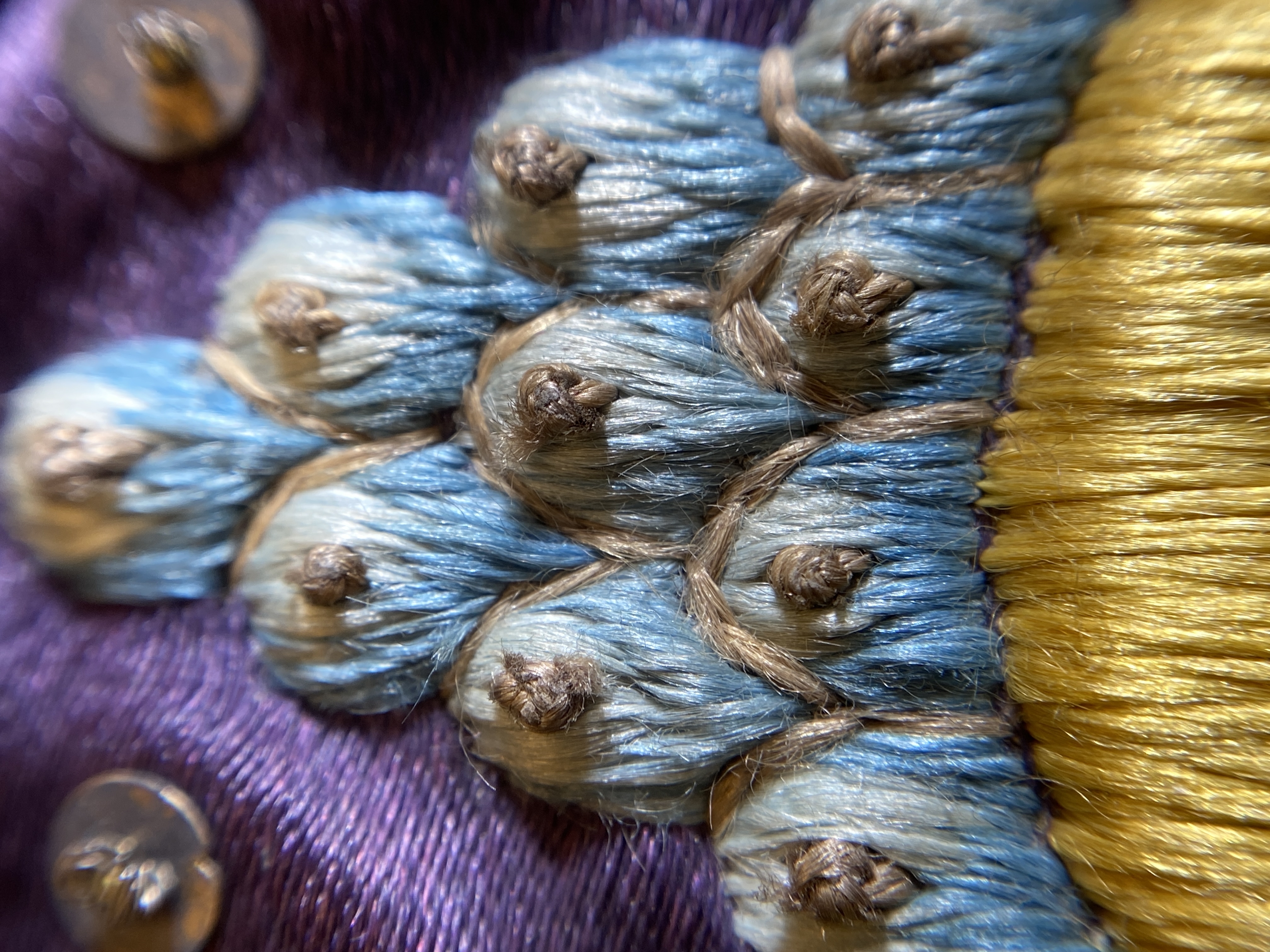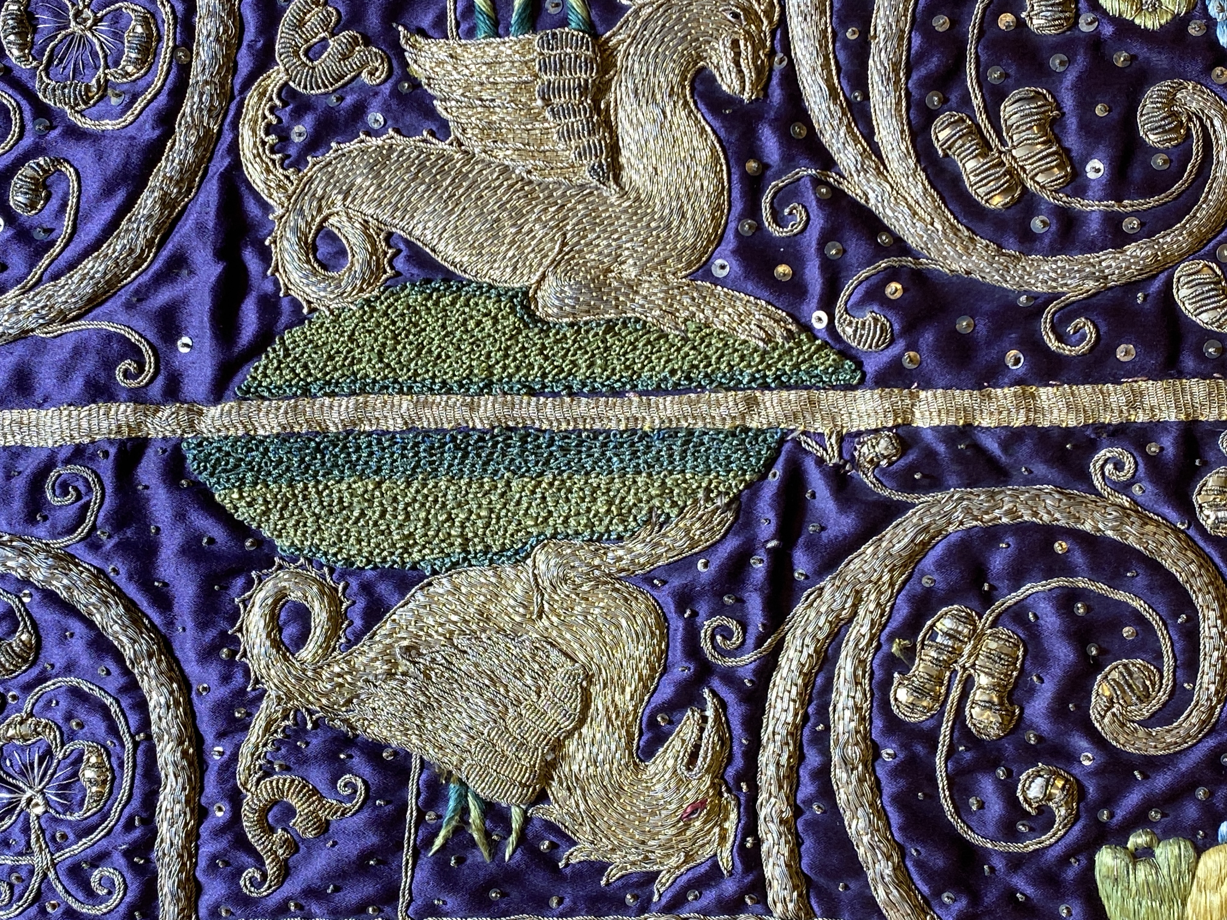 Violett atlas, guld- och silverbroderier, metallspetsar, violett lärftfoder. Gåva 1911.