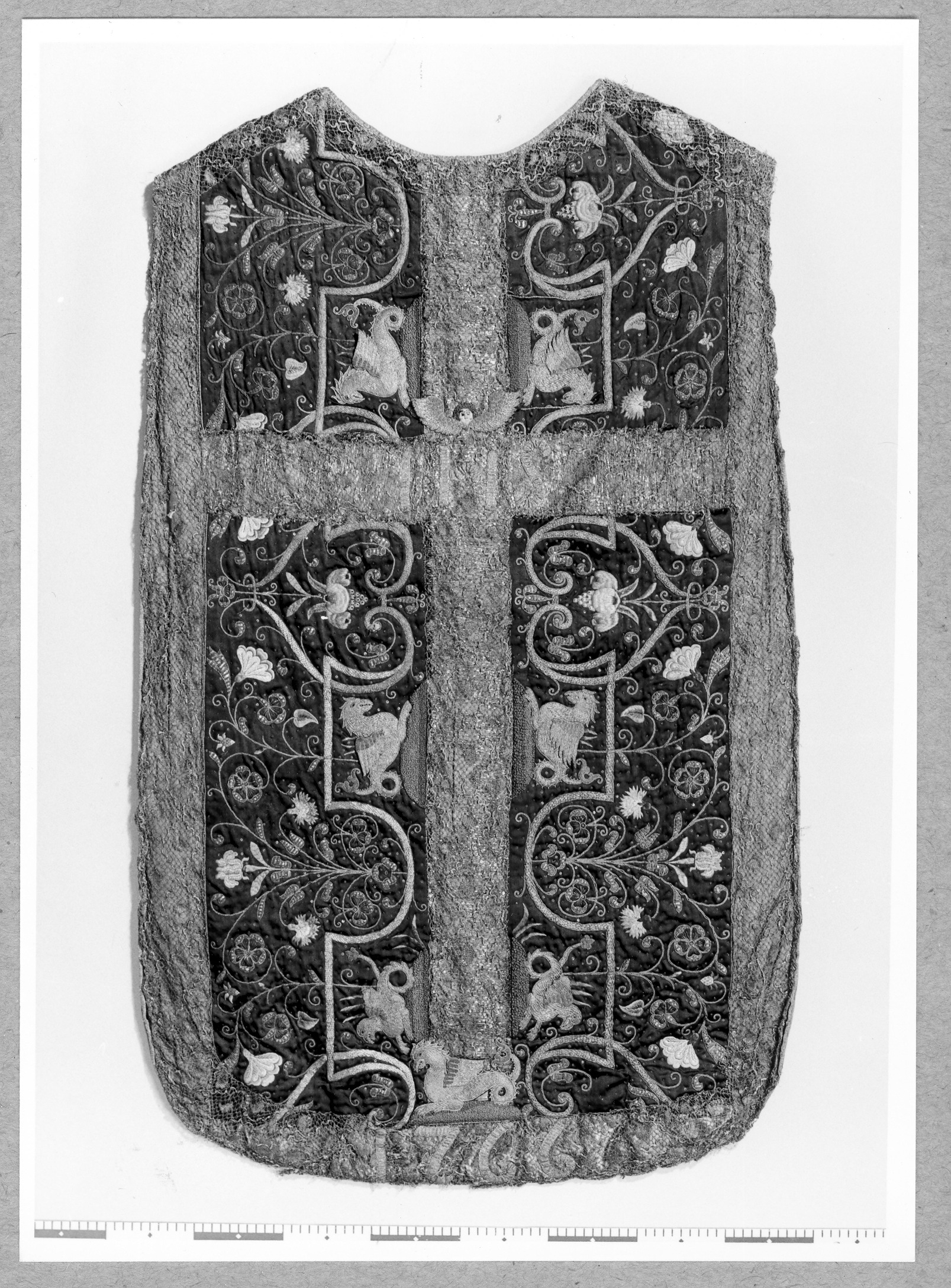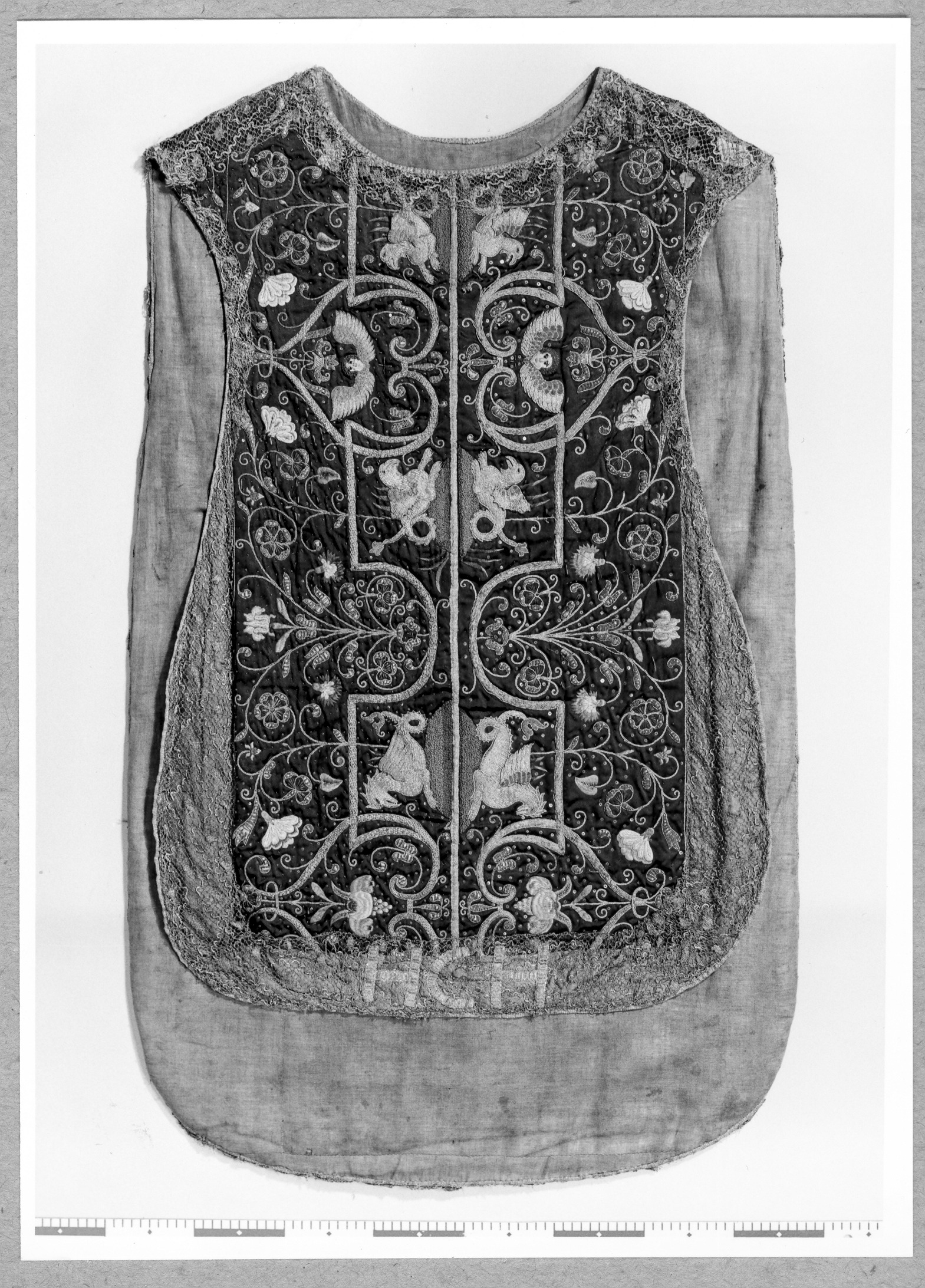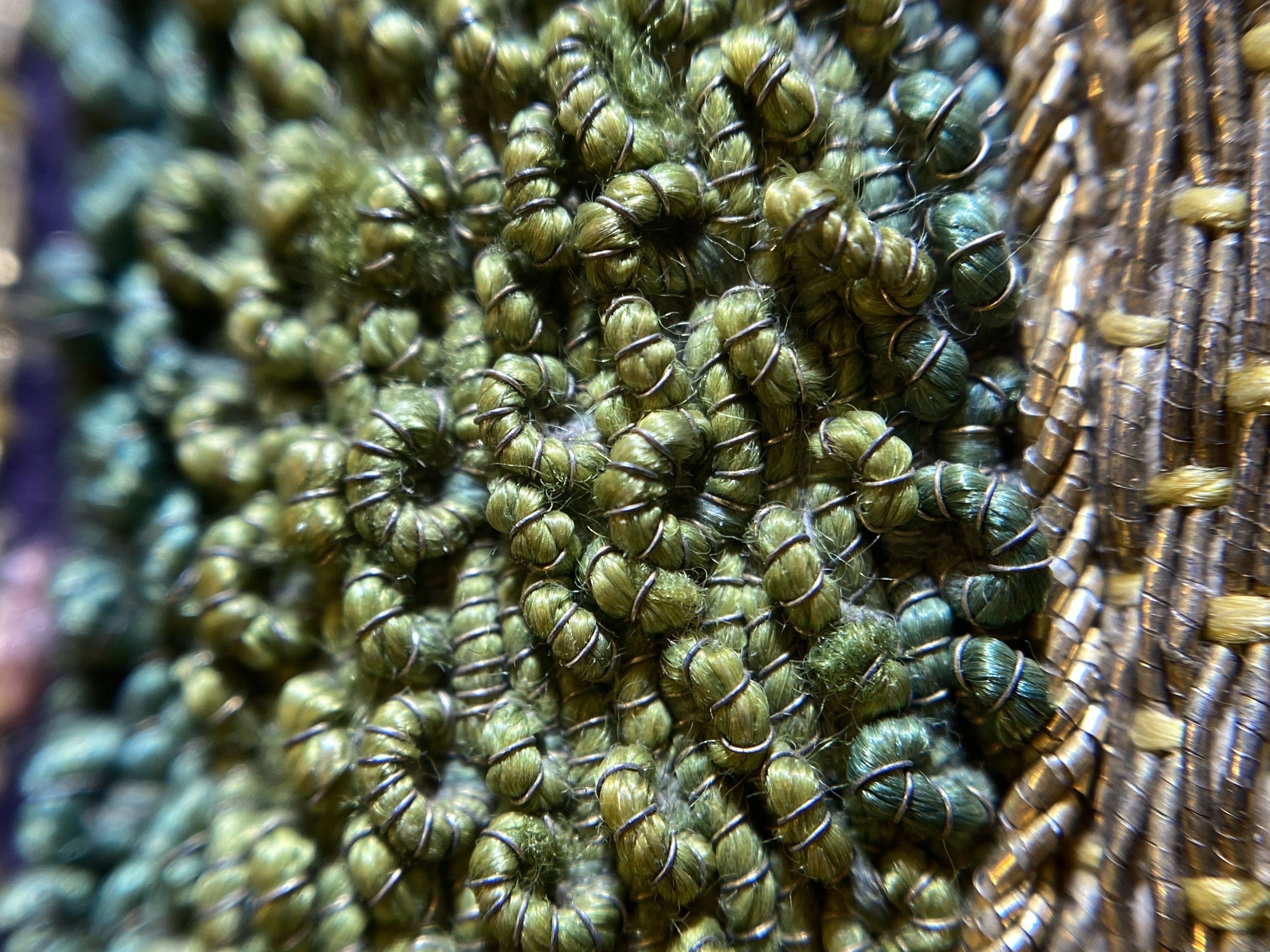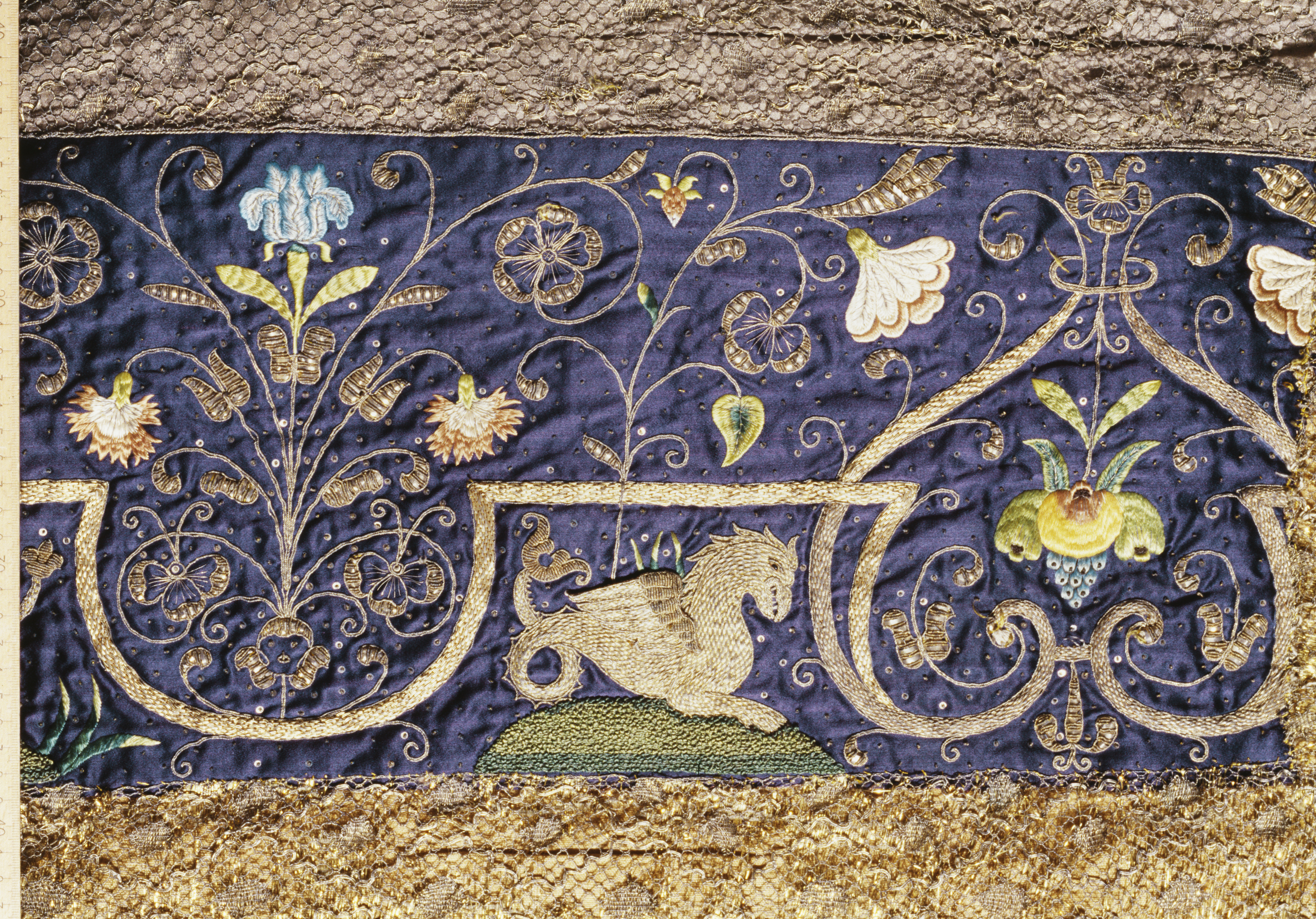 Violett atlas, guld- och silverbroderier, metallspetsar, violett lärftfoder. Gåva 1911.