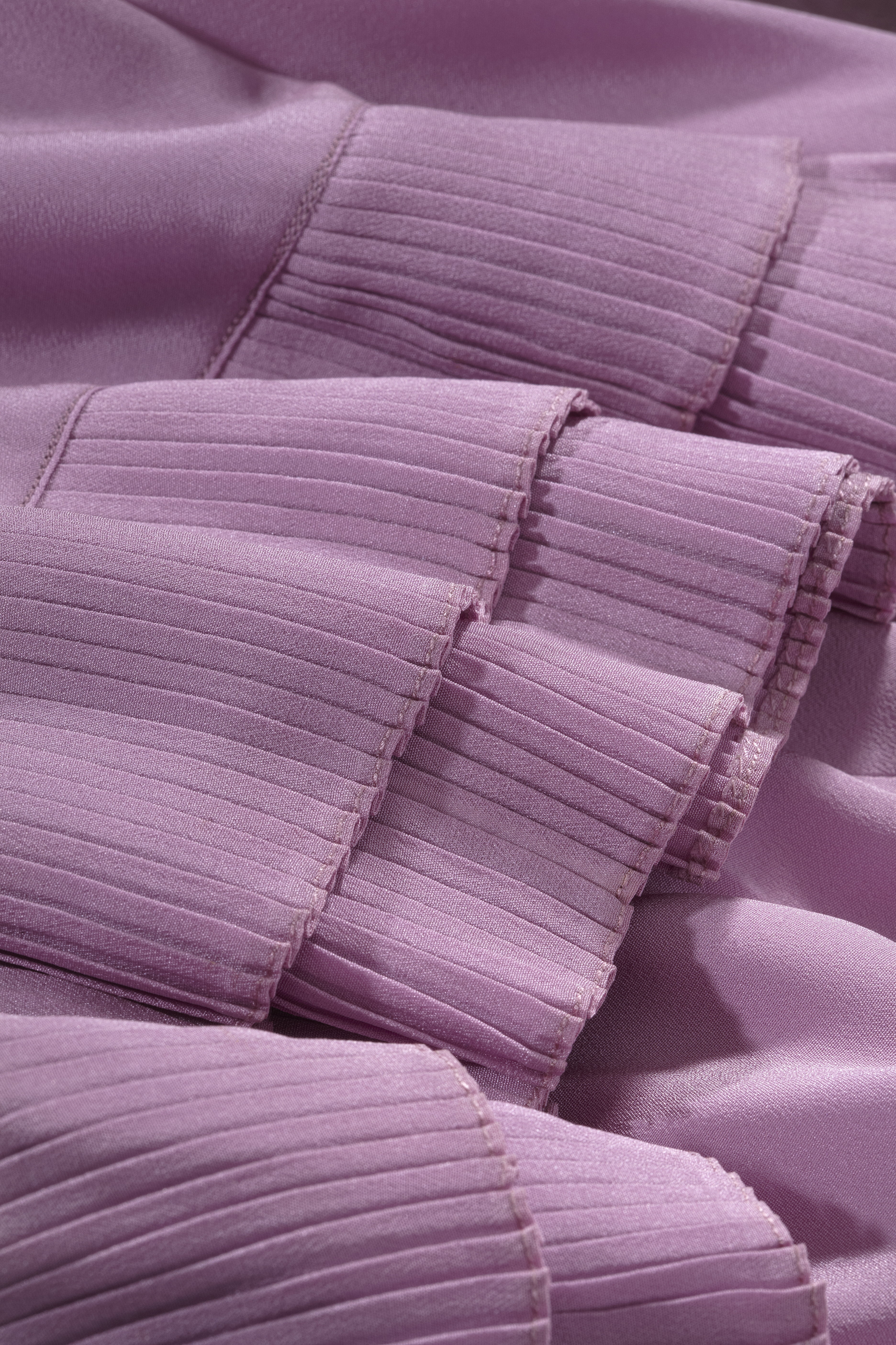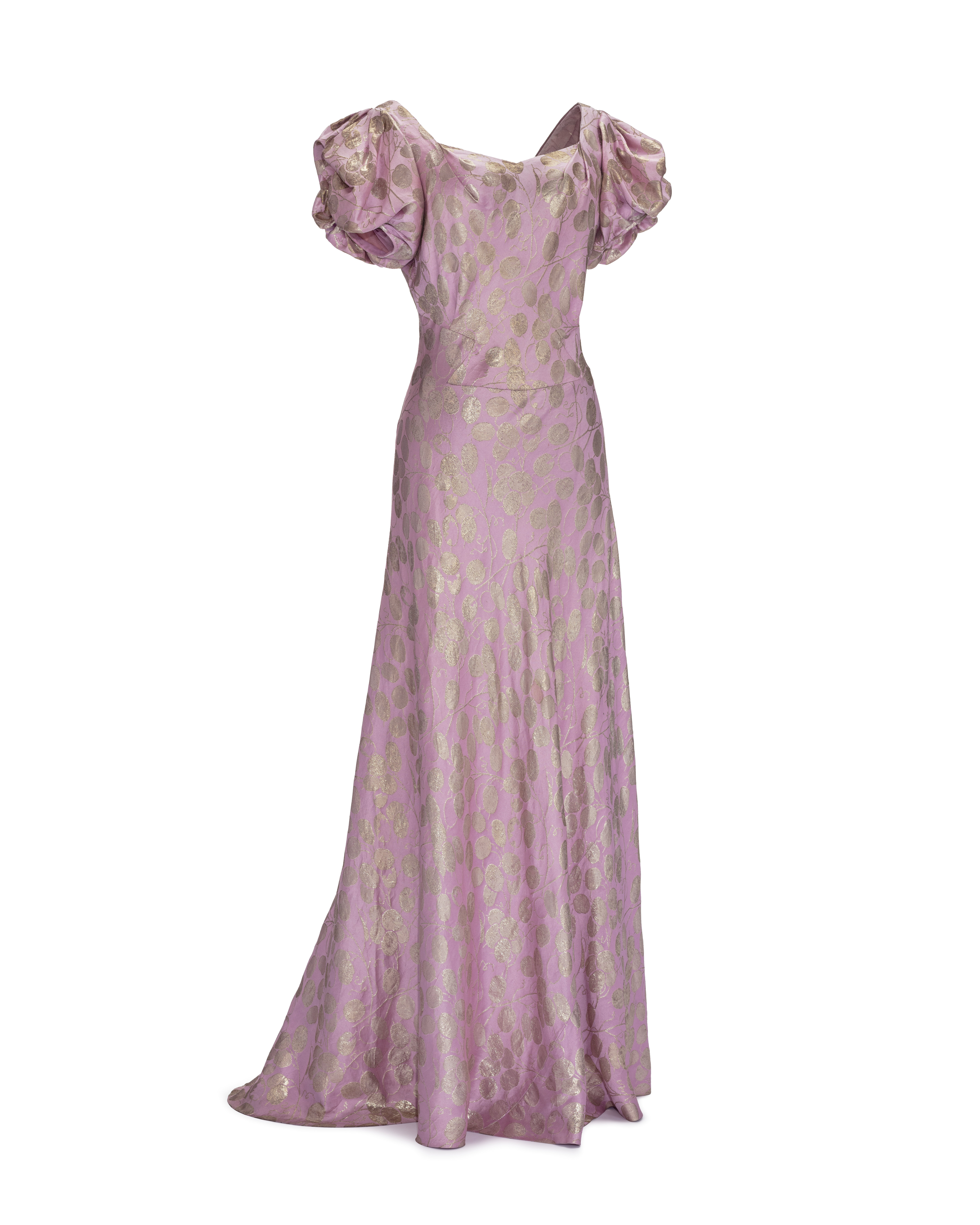 Hellång aftonklänning av ljuslila guldbrokad med mönster av bärklasar. Skuren med djup V-ringning bak, puffärm och något längre kjol bak. Fyrkantig ringning fram, något vinklad på mitten. I hörnen dubbla "nyp"-veck. Livet kort i sidorna och mitt fram. Livet mitt bak är neddraget i en romb. Kort ärm med puff, rynkad vid axeln och med rullslå nedtill. Kjol, klockad med en bred våd fram med infälld snedvåd nedtill samt en smalare bakvåd. Knäppt i vänster sida med nio små tryckknappar samt på mitten en hake och hyska. Klänningen ofodrad. Ärmarna fodrade med ljusrosa organza. Ärmlappar av rosa siden. Vid axelsömmarna hällor av siden med tryckknappar. Vid ringningen fram sydda hällor med rosa-silke och tryckknappar. Fållbredd nedtill 40 mm.