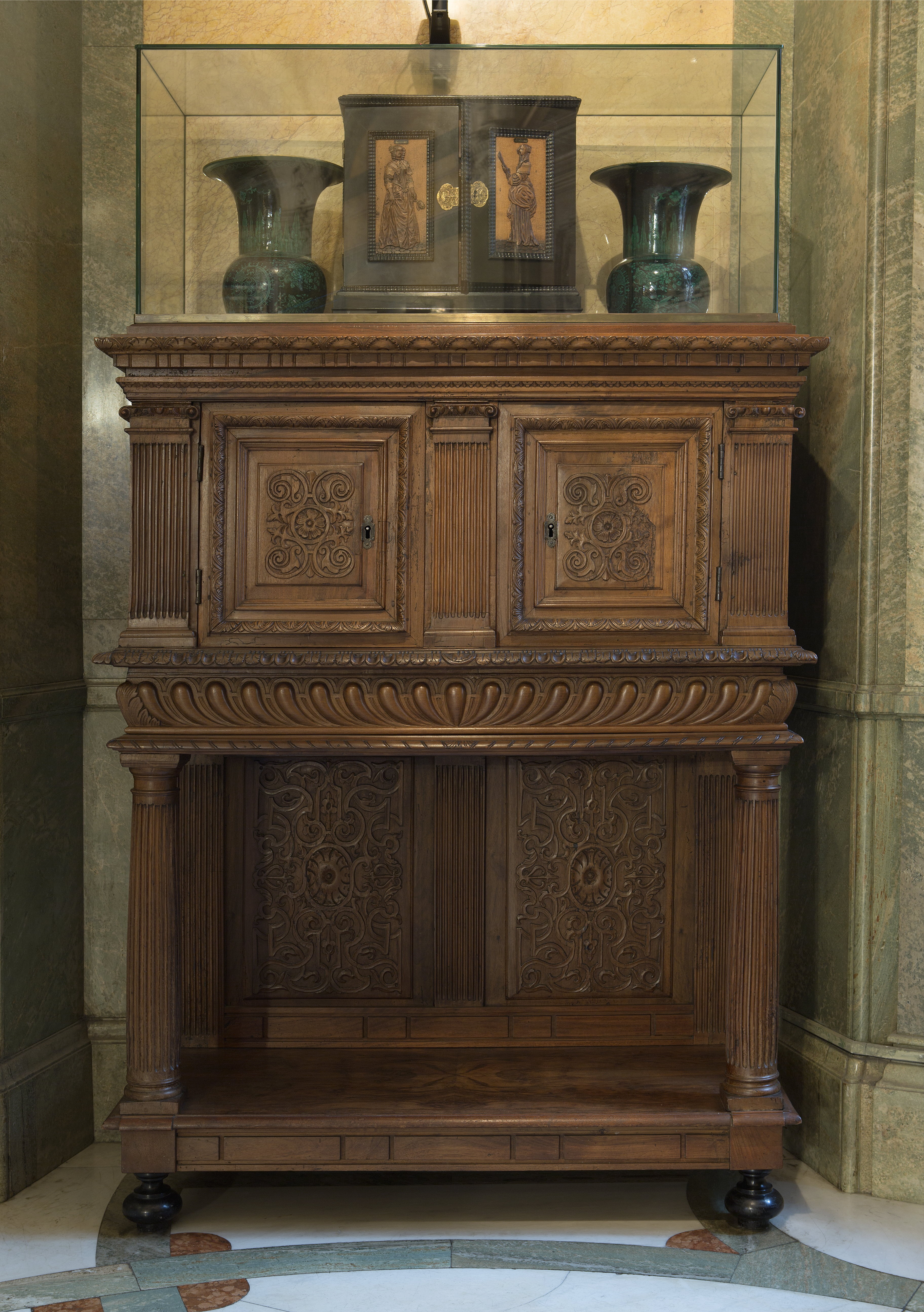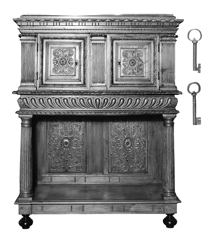 - Af valnötsträ. Aflångt, med raka former samt två dörrar på gångjärn af järn; på fotställ. Snidadi i relief samt bonadt. Hvardera dörren med ram och fyllning, den senare med insänkt slät fris och stående rektangulärt midtfalt. I fältets midt en fembladig blomma inom smal ram, öfver och under denna två frånvända snirkelornament, hvartdera med inre ändan afslutad i ett flikigt blad; kring ytterkanten en smal staf, Kring ramens innerkant en profilerad utstående list, i midten en starkt utstående list med stafformig insida, hvarå fortlöpande utåtvända bladornament i plattsnideri, hvarje omslutet af en smal båge, mellan dessa ett treflikadt bladornament samt i hvarje hörn ett utåtvändt stort flikigt blad; listens utsida i hålkäl. I frisen å hvardera fyllningen en stående aflång nyckelskylt af järn, med ett rundadt utsprång vid hvardera ändan som spikfaste. Mellan dörrarna och vid yttersidorna en pilaster, kannelerad med nio kälar samt med profilerad sockel och joniskt kapitäl. Kortsidor med stående rektangulär fyllning och insänkt slät fris. I midtfältet ett stort symmetriskt ornament af två liggande frånvända bågar med ändarna afslutade i stora snirklar, från hvilka utgående inåt tre flikiga blad; vid hvardera yttersidan ett blad på kort stjälk, utgående från ytterbågen, i svicklarna mellan bågarna två flikiga blad; kring ytterkanten en smal staf. Vid fram- och bakkanterna en pilaster som de å framsidan, den främre med fem kälar, den bakre med en. Nedtill kring skåpet en utstående list med rundad öfversida, hvarå grupper af tre utåtvända flikiga blad, omväxlande med grupper af tre kälformiga tungor; å framsidans midt ett halfrundt bladornament inom slät båge samt i hvartdera hörnet större bladornament; kring inkanten en af pärlor af bruten smal staf; å listens undersida en hålkäl. Under listen en indragen sarg med godronnering af höga bucklor, något böjda samt spetsigt afsmalnande nedåt, hvarje inom slät smal ram; bucklorna å framsidan lutande från midten åt båda sidor, å kortsidorna framåt; i hvartdera af främre hörnen ett uppåtvändt stort bladornament; nedtill en slät staf. Upptill ett utstående listverk, å öfversta profilen fortlöpande bladornerade uppåtvända bågar, mellan dessa treflikade bladornament, å den näst följande profilen grupper af tre tvärgående kälar samt å en af nedre profilerna nedåtvända bladspetsar, omväxlande med mindre uddar. Ofvanpå skåpet en pålagd skifva, kring hvars ytterkant en profilering. Rygg af liggande trä, slät. Dörrarnas insidor släta, å hvardera ett lås med utanpåliggande mekanism, det högra med graverade orneringar och tvådelad kolf, det vänstra med enkel. Fotställ (original): Med två kolonner, rygg samt fotsarg med skifva. Ofvanpå kolonner och rygg en smal ram med profilerad utstående kant, hvarå grupper af två snedt öfver gående reffior, å framsidan snedt ställda från midten åt hvardera sidan, å kortsidorna framåt; å framsidan i midten samt i främre hörnen ett bladornament. Kolonner: en i hvartdera af främre hörnen och stående på sargskifvan; hvardera svagt afsmalnande uppåt, kannelerad samt med fyrsidig fot- och bärskifva. Rygg med ram och två stående rektangulära fyllningar med släta insänkta friser, å hvartdera midtfältet i midten en stående oval bladrosett inom smal slät ram, däromkring båg- och snirkelformiga symmetriska bladornerade bandslingor, gående öfver och under hvarandra; kring ytterkanten en smal staf. De stående ramstyckena kannele-rade, det mellersta med nio, de vid sidorna med tio kälar; öfre ramstycket slätt, det nedre med två längdgående rännor, mellan dessa tvärgående dylika, bildande tre längre och fyra kortare fyrsidiga fält. Fotsarg med sidor som ryggens nedre ramstycke, i hörnen en utstående slät platta. Skifva slät, med utsprång och rundad nedtagen kant. Under sargen i hvarje hörn en tryckt kulfot i svart, med fotplatta och käl-formig hals. Höjd: 1.54 m. Skåp, höjd: 0.565 m.; bredd: 1.21 m.; djup: 0.53 m. Fotställ, höjd: 0.975 m.; bredd: 1.17 m.; djup: 0.5 m. Nycklar (original): Af järn, hvardera med nästan rund ögla; upptill å pipan en åttasidig fläns (s. k. stos), öfver denna en i öglan inskjutande spetsig flik. Längd: 11.5 och 12 cm.; bredd: 3.6 och 3.7 cm. Sydtyskt arbete från 1500-talet. Inköpt af Wilhelmina von Hallwyl, f. Kempe, 7 Juni 1893 hos konsthandlaren H. Bukowski, Arsenalsgatan 3 d, Stockholm, se räkning samma dag. Betaldt 7 Juni 1893. Pris: Kr. 350, se räkning. Repareradt hos snickaren C. H. Benckert J:r, Regeringsgatan 63, Stockholm, se räkning 30 December 1893. Betaldt 3 Februari 1894, se Rescontra (Walther VON Hallwyl) Pris: Kr. 135, se räkning.