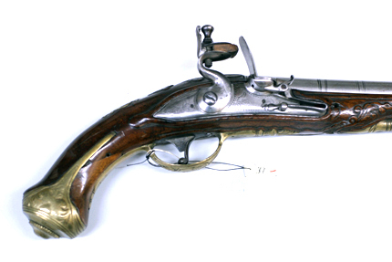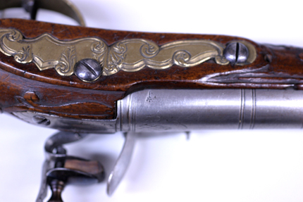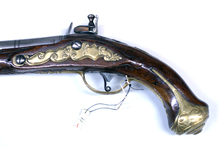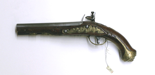 Rund, slätborrad pipa av stål, dekorerad med graverad, korsskrafferad triangel samt bladornament vid pipbas och på svansskruvblad, graverade band vid pipbas och framför kammaren, vid mynningen ristat MM. På kammarens undersida stämplat 2, nedanför fänghålet möjligen en stämpel, på v sida vid pipbasen två otydliga stämplar, liknande vapensköldar krönta med kulkronor (?), ovanför den nedre stämpeln ett fält med x-skraffering (smidesskada?), på undersidan ett liknande fält. Riktmedel: Sikte och korn saknas. Fästning: Urspr. två häften, det bakre saknas. Pipan fäst med blånerad krysskruv ovanifrån samt ett pipstift av stål. Flintlås med välvt låsbleck och hane med markerade kanter. Graverad kantlinje samt växtdekor på båda sidor om hanen. Hane med bladranka samt lös, blånerad överkäke och dito käkskruv med kägleformigt huvud. Rundad fängpanna med fals och vattenpanna, låg, rak krutskärm. Välvt batteri, c-formig stötklack, urneformigt fjäderlöv. Spår av blånering på invändiga låsdelar. Fästning: Två blånerade låsskruvar med välvda huvuden. Avtryckare med upprullad ände. Blånerat avtryckarbleck, en skruv saknas. Helstock av valnöt med snidad dekor runt svansskruvblad och spetsrörka. På v sida vid bakre varbygelstompeln en stämpel i form av en öppen krona. Beslag av mässing. Kolvkappa med graverad dekor, centrumplatta med tandad kantdekor. Sköldformig, krönt tumplåt. Plant sidbleck med konturerade kanter och graverad bladdekor. Runda, profilerade rörkor. Skålformig varbygel med gjuten dekor, främre armen avslutad med urna med graverad triangulärt blad, bakre armen avslutad med två kulor samt slätt triangulärt blad. På bakre armen graverad N3, varbygeln fäst med två stift från låsurtaget. I låsurtaget stämpel III och därframför X. Tillbehör: Laddstock, längd 145 mm av mörkt rödbrunt trä utan skoning.
