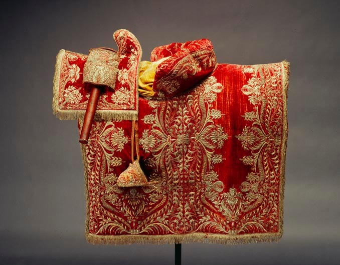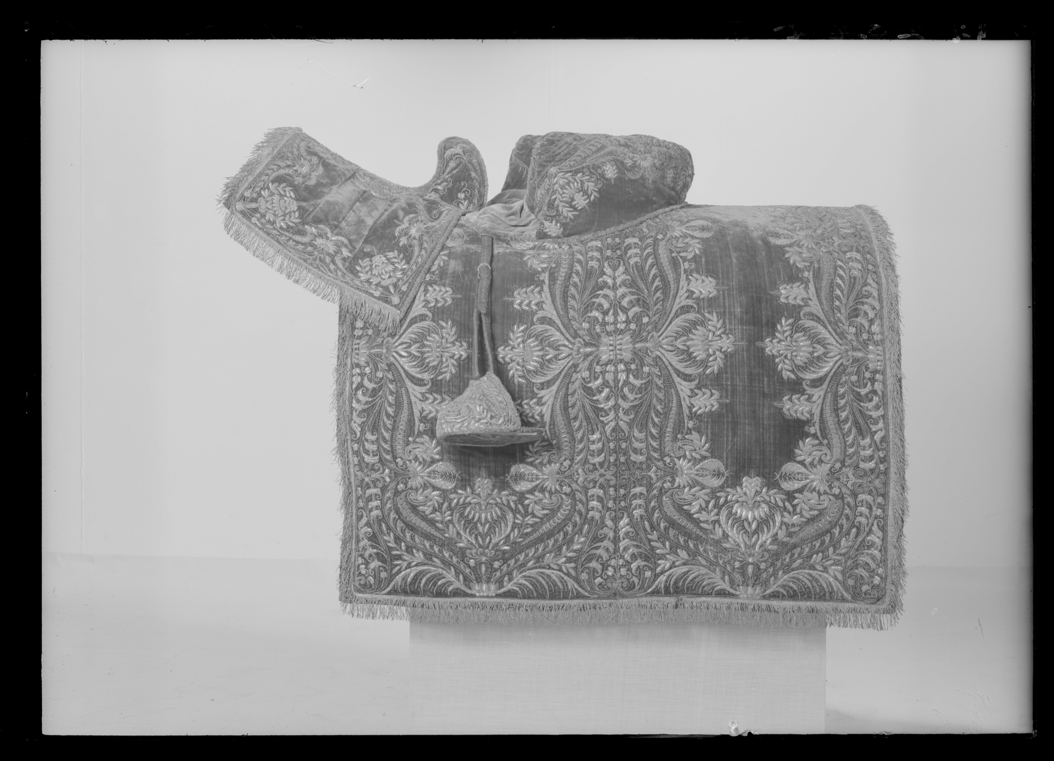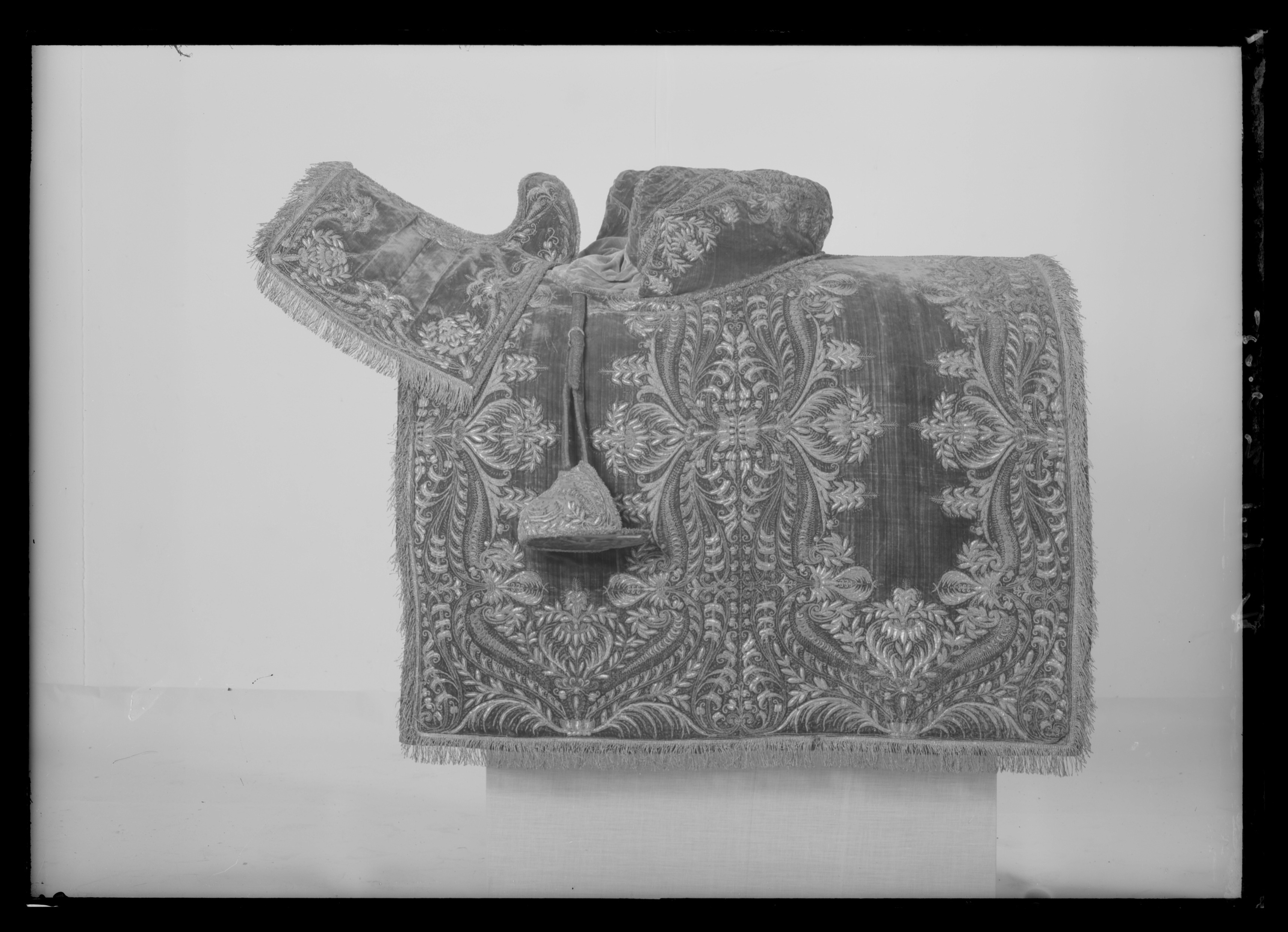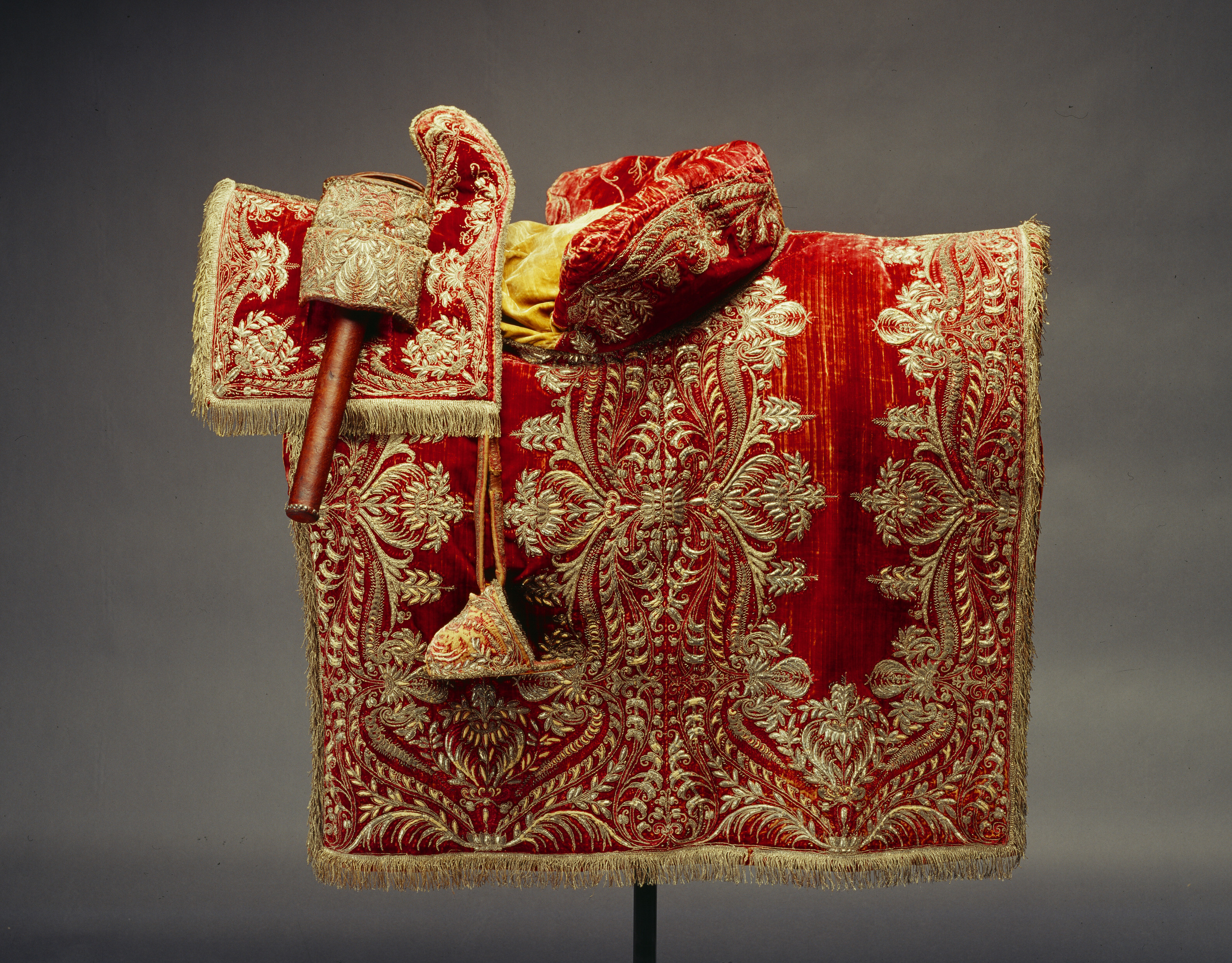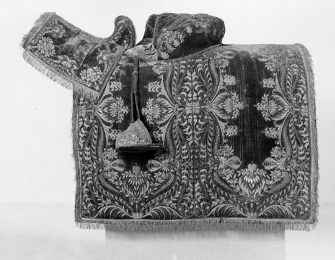 Sadeltäcke av röd sammet med formsydd sits. Broderier utförda i Paris 1650. Monterade av Simon Jüterbock i Stockholm 1650.