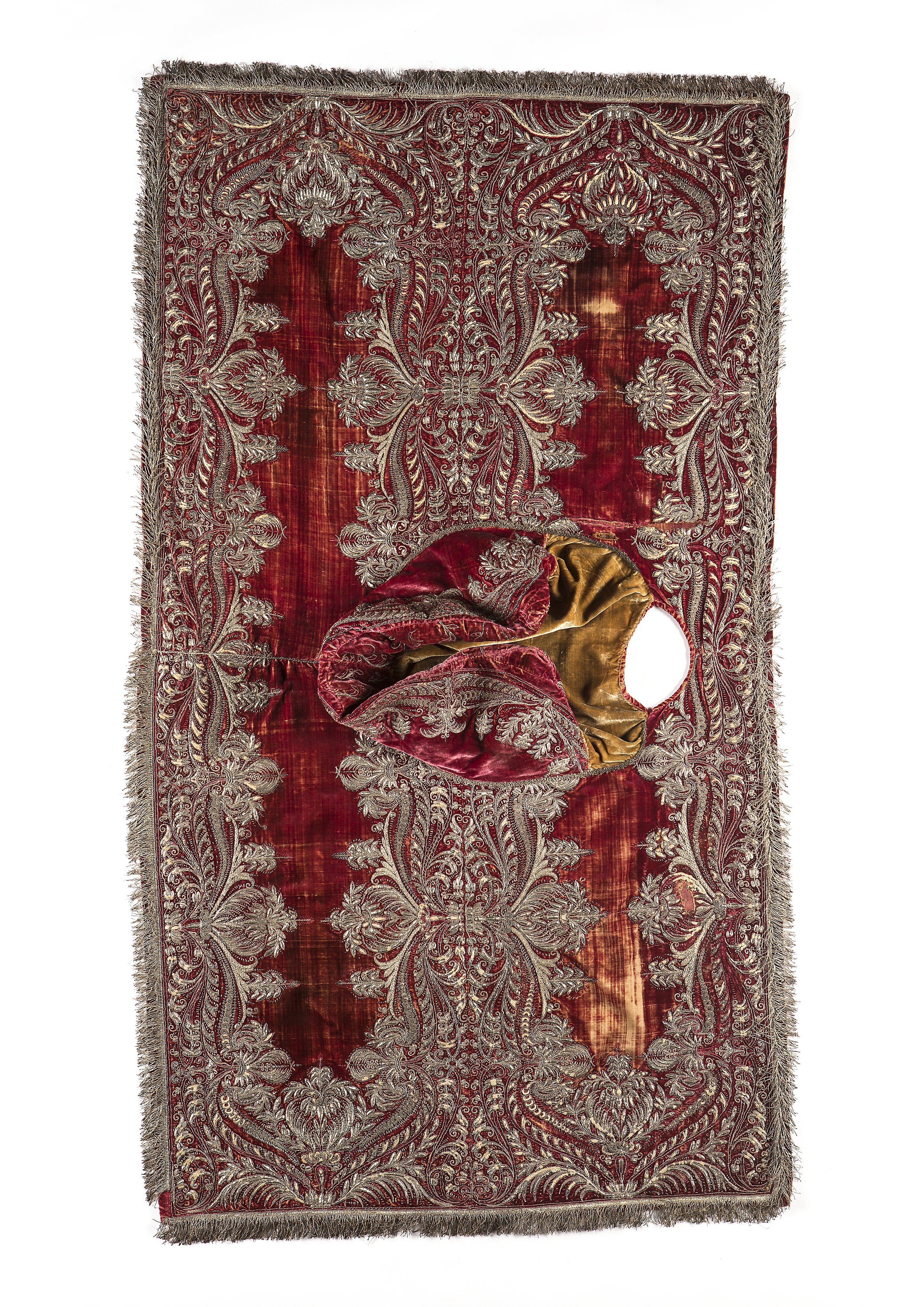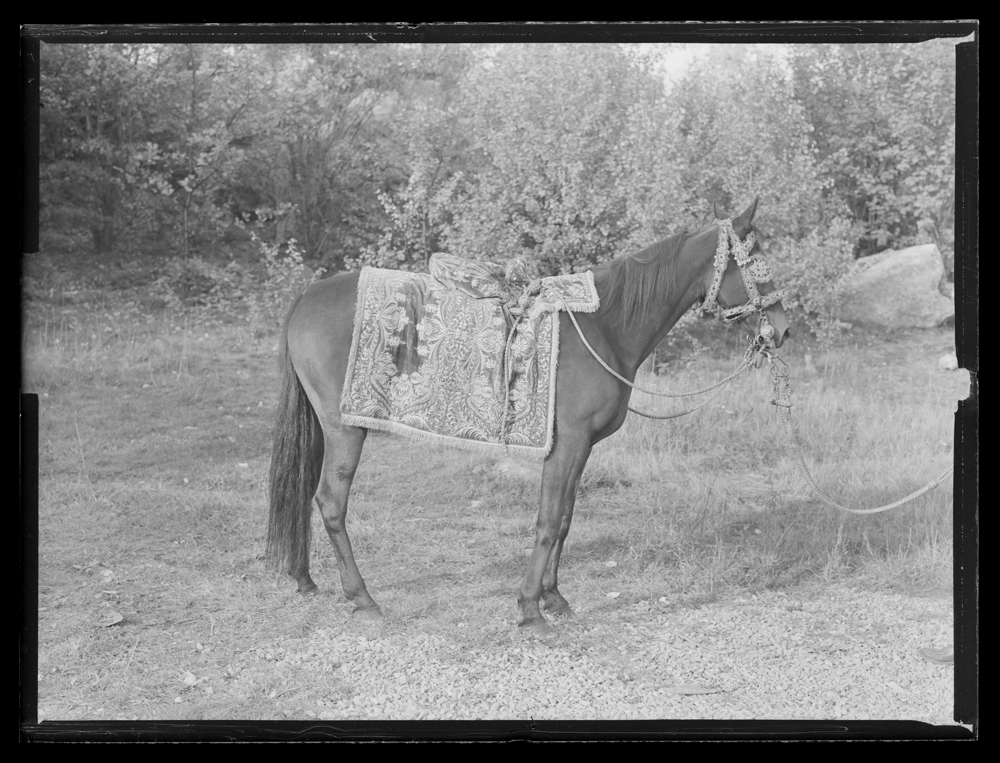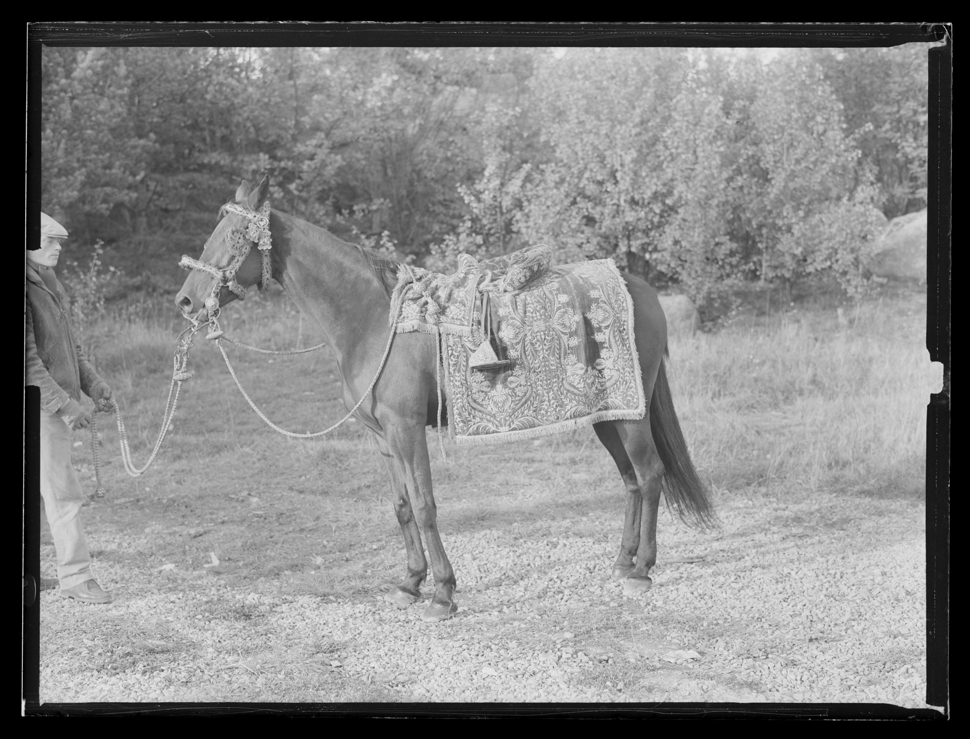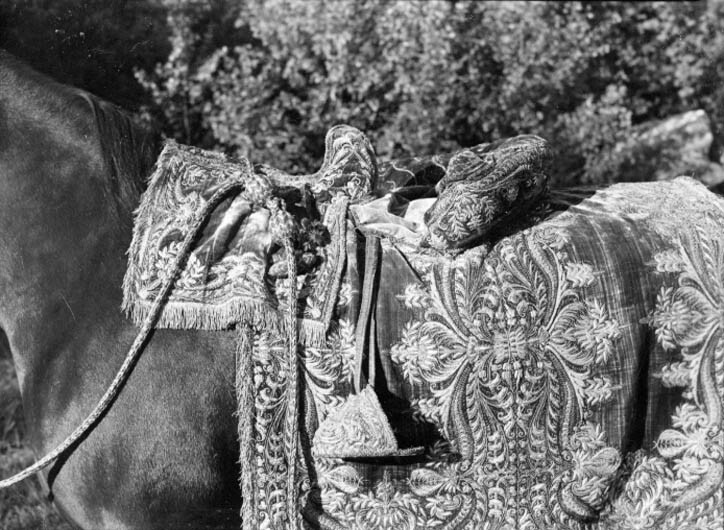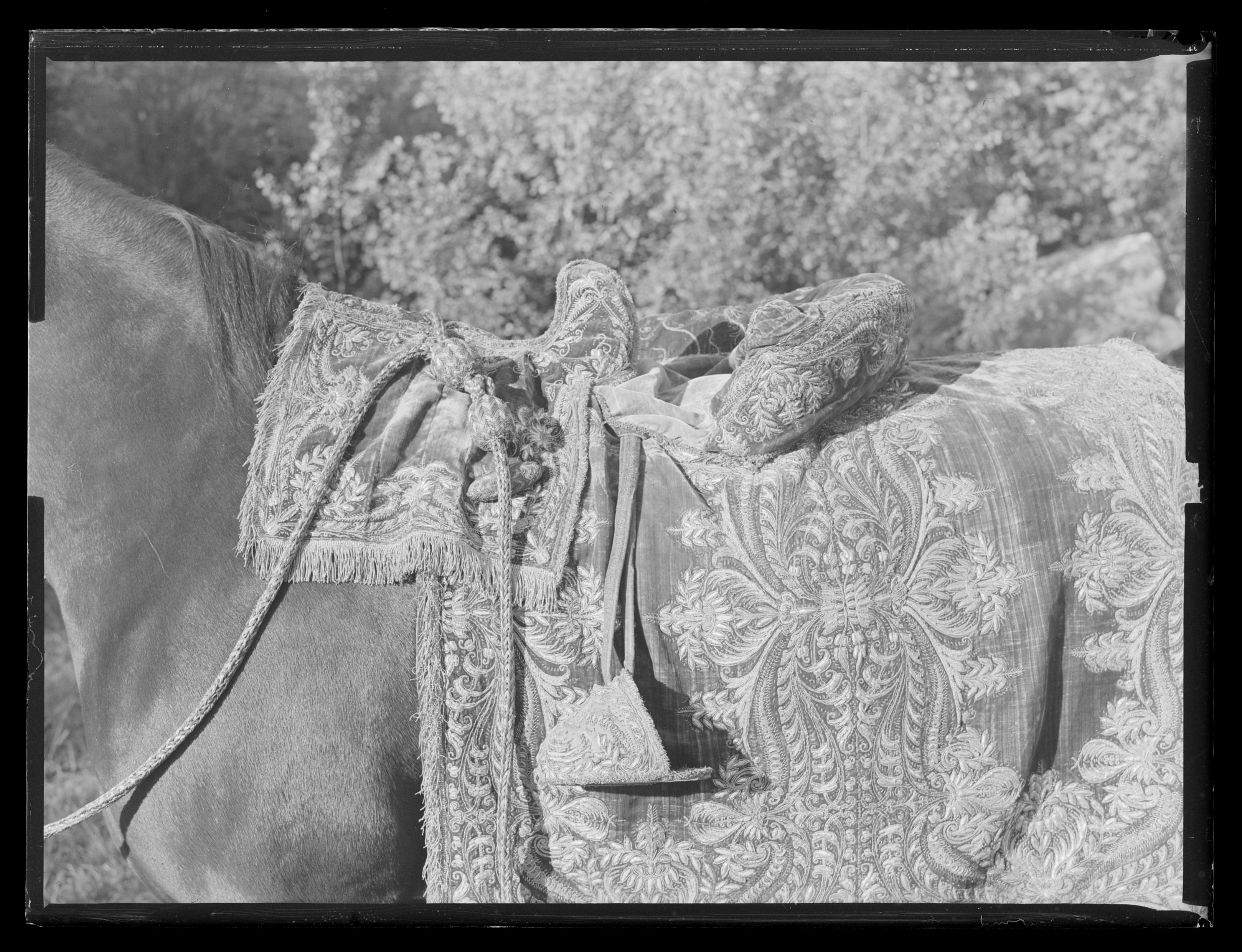 Sadeltäcke av röd sammet med formsydd sits. Broderier utförda i Paris 1650. Monterade av Simon Jüterbock i Stockholm 1650.