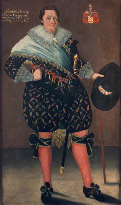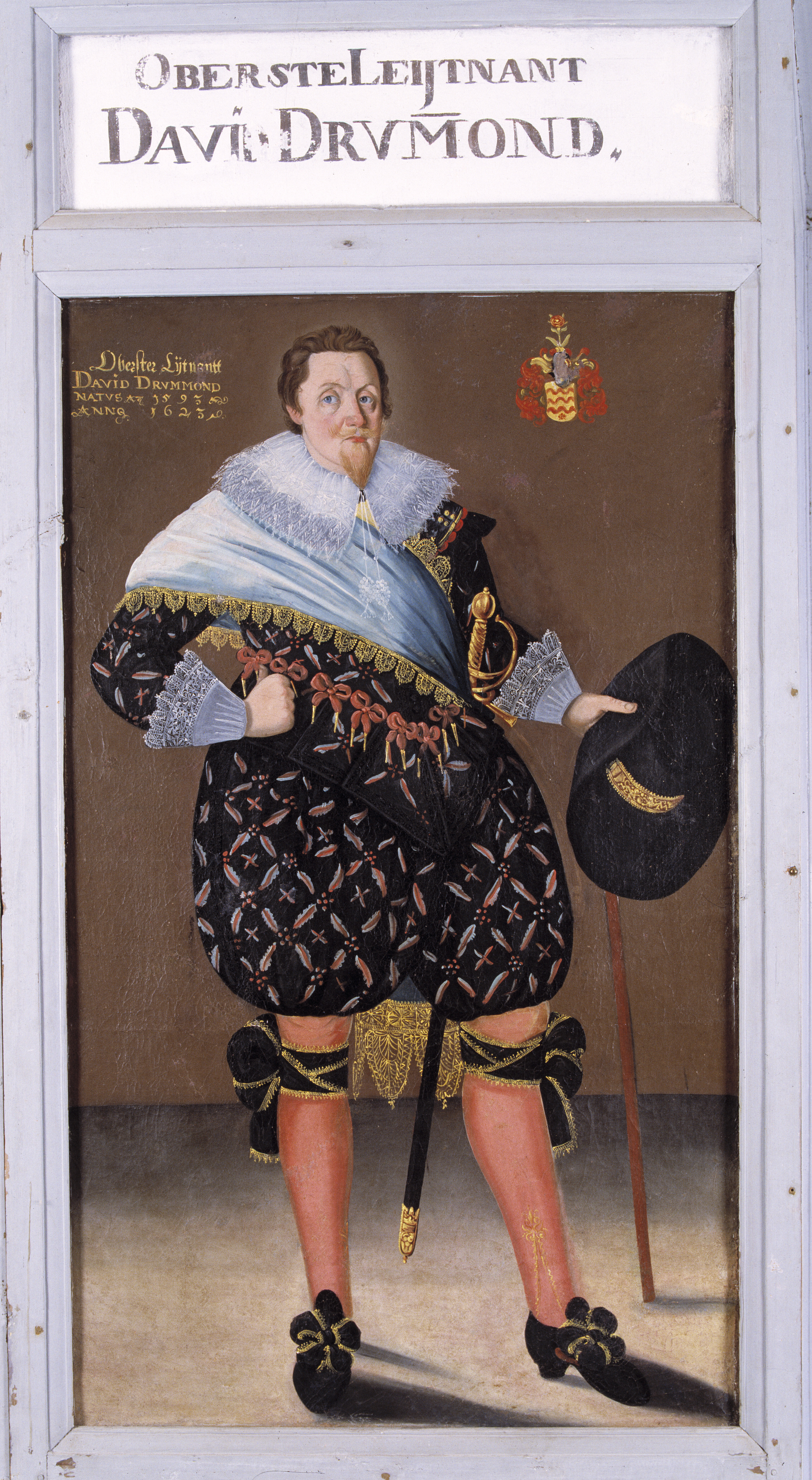 Stående, helfigur, fas höger, höger hand i sidan, i vänster hand käpp och hatt. Svart tröja med skört samt pluderhosen, mönster i rött och grått. Spetskrage, ljusblå axelbindel, värja, röda strumpor, svarta skor. Inskrift överst t.v: "Oberst Lijtnantt DAVID DRVMMOND NATVS Ao 1593 ANNO 1623". I övre högra hörnet vapensköld med tre bjälkvis gående strömmar. Spikad på ram, fastskruvad vid väggen.