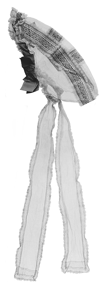 MORGONMÖSSA Av vit (gulnad) tyll med knypplade vita spetsar (gipyr-) och ljusgredelina sidentaftband. Handsydd. Två längdgående mellanspetsar i stjärnmönster, vid vardera kanten en runduddad smal kantspets i mönster av bågar samt omväxlande stora och små ovaler med pikotavslutning. Vid vänstra sidan en rosett av sidentaftband med trubbvinkligt klippta ändar. Hakband av tyll, med orynkade kantspetsar som de förutnämnda. Kast- och förstygnssömmar sydda med vit (gulnad) linnetråd. Mått: Diameter: omkring 34 och 30 cm. Hakband, längd: omkring 53 cm.; bredd: omkring 8 cm. Inköpt av Wilhelmina von Hallwyl April 1871 hos en handlande i Stockholm.