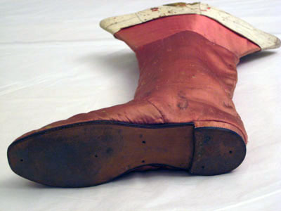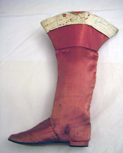 Kragstöveln, sydd i rött siden, har högt skaft med utsvängd krage som är 165 mm hög och 760 mm i omkrets. Stövelns totala längd är 520 mm. Kragen är troligen stärkt med papp och stövelkragen var ursprungligen hermelinsbesatt. Skaftet är formskuren sydd i en del. Klacken är 15 mm hög, 65 mm i bredd samt 65 mm djup och beklädd med rött siden. Stiftlappen är tre mm tjock och är rangsydd. I klacken är fem spik av trä samt tre pinnhålsstämplar och själva sulan har fyra pinnhålsstämplar ( två under svanken och en under fotsulan samt en utanför tån. Rangsydda sula med vit skinnrand av läder. Sulan är av koläder med dold söm. Tån är rak skuren. Stöveln är fodret med vit silkesatlas i kragen och skaftet är fodret med ett tyg vävt i ylle. Invändigt vid kragen är ett dubbelvikt bomullsband, 150 mm långt och 20 mm brett.