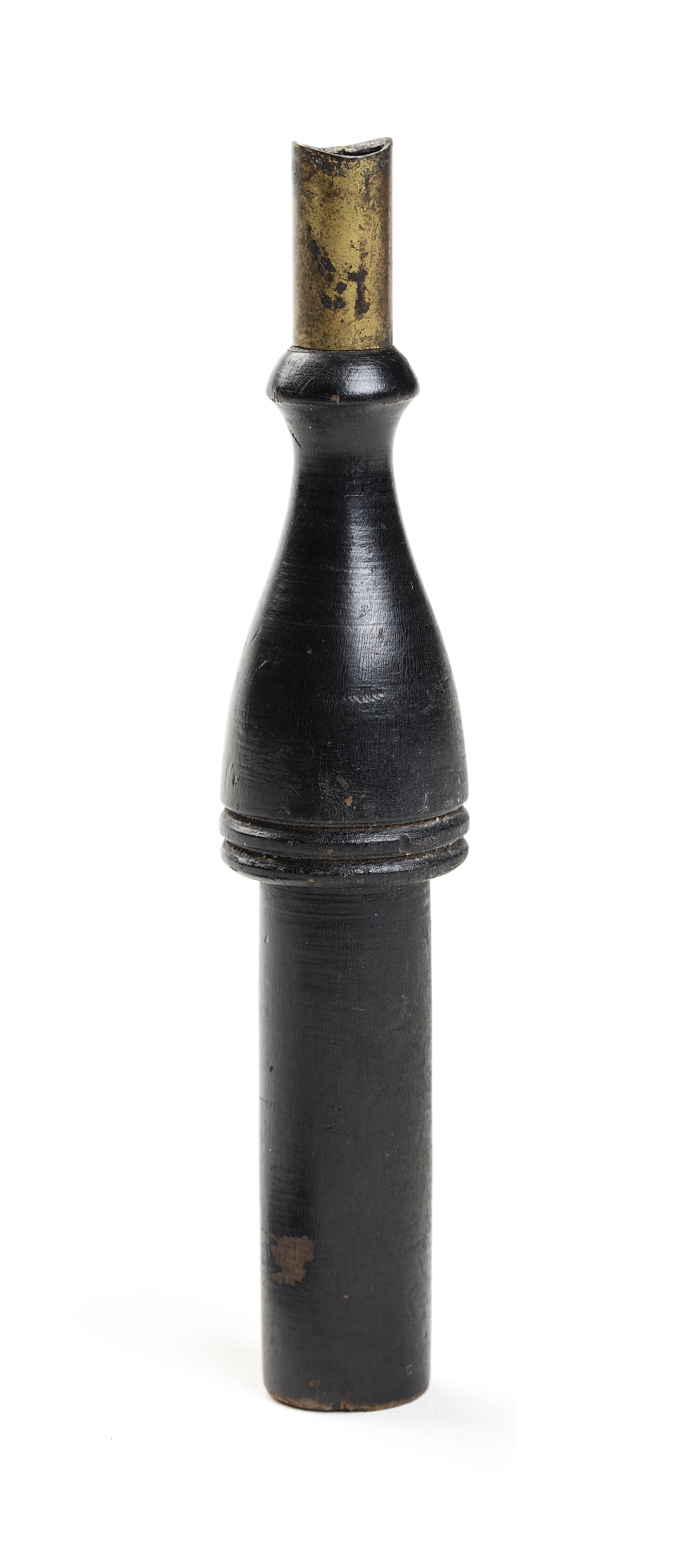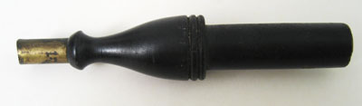 Av svarvat trä med heltäckande svart bemålning. Ena hälften cylindrisk och slät, andra hälften närmast kägelformig med i änden 18 mm lång cylindisk hylsa av gulmetall. Hylsans ände har rundat spår och rester av lödning.