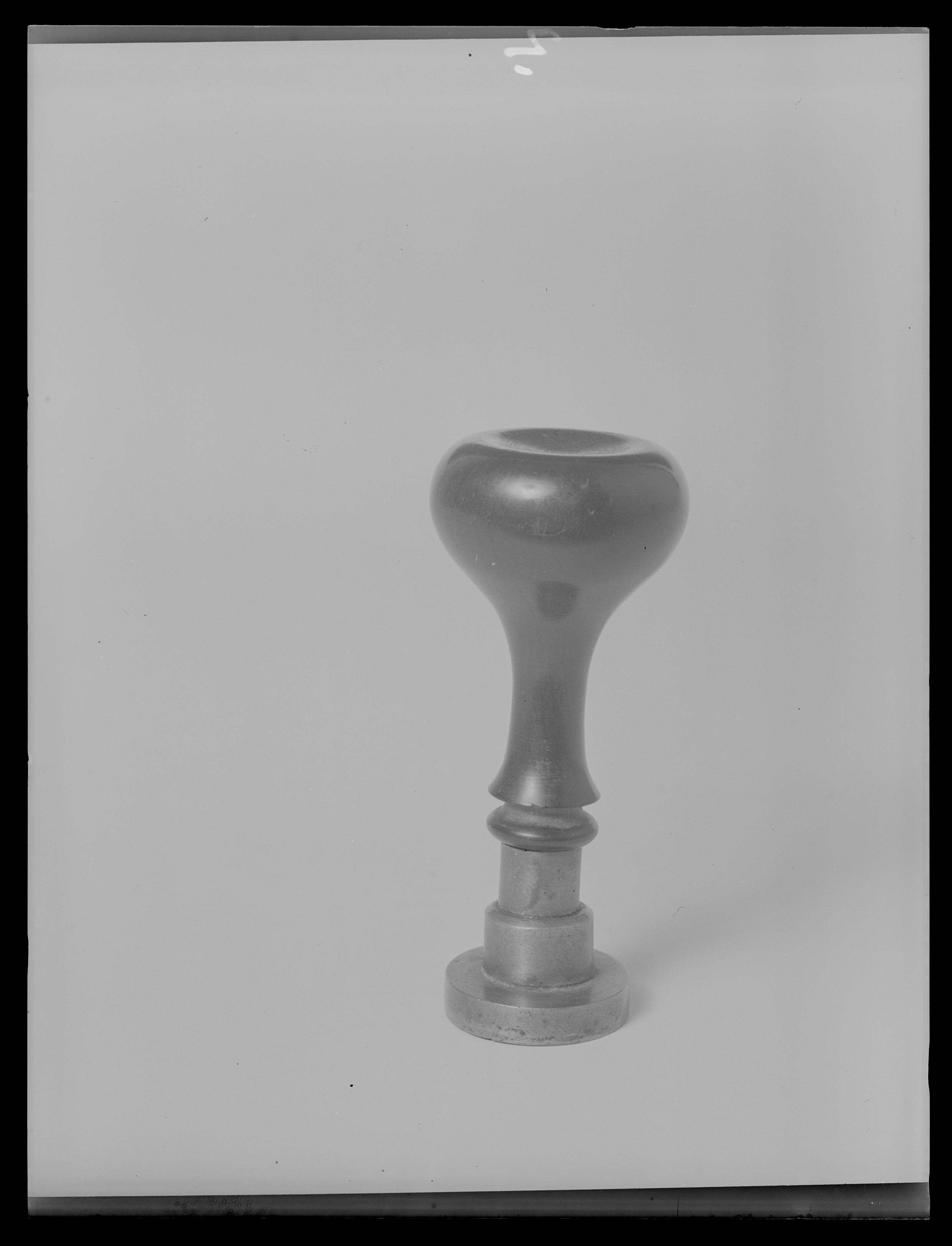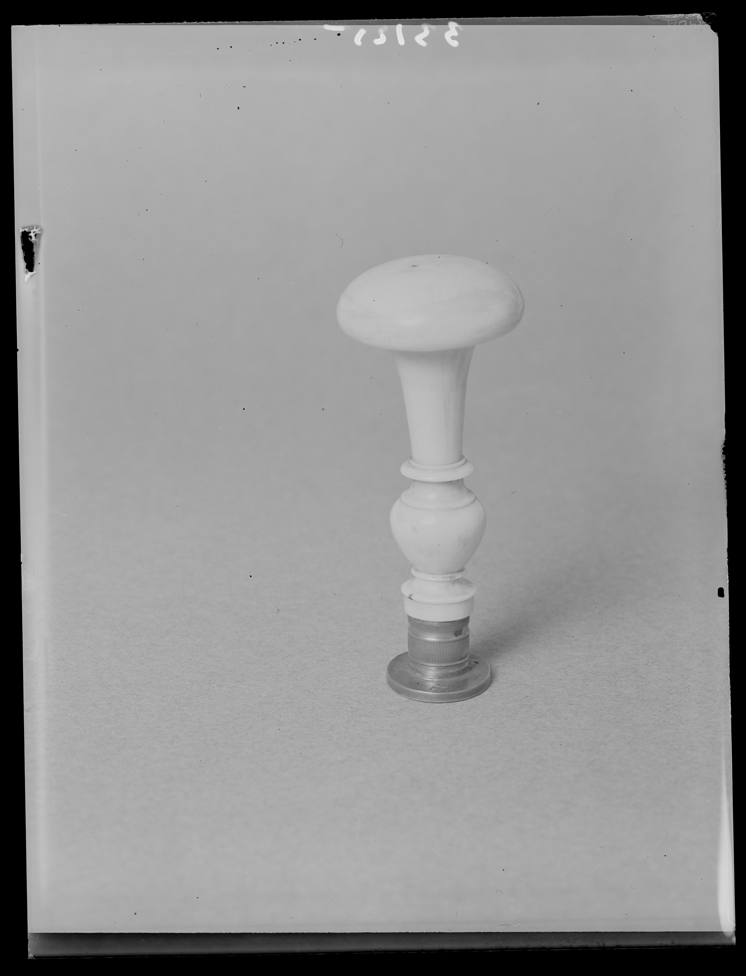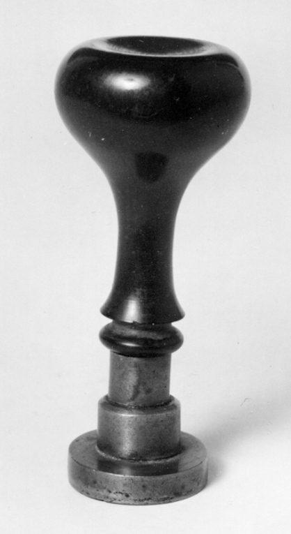 Oval platta av silver, däri graverat vapen, sköld med tre uppåtriktade spetsar, kluven av tre kronor och norska lejonet. Skölden krönt av kunglig krona och omgiven av Serafimerordens kedja. Tredubbel kantbård, två pärlstavar och ytterst slät ring. På plattans ovansida två otydliga stämplar, kaninhuvud (jfr Tard, Poincons d'argent, sid 175, petite garantie, Paris efter 1819), samt rombiska mästarstämpel, däri G P (C F?) och två otydliga figurer. Holk av silver, h: ca 13 mm, dekorerad med två räfflade band. Svarvat skaft av elfenben, urneformig nederdel, uppåt vidgad till rund, på ovansidan välvd platta med rak undersida, d: 36 mm. På skaftplattans undersida märkt med svart färg: 2825:3 (SHM nr). På ursprungligen vidhängande lapp bläcktext: "N:o 69 // Drottning //Desideria // 1818-1860 // inv. nr. 2825:3".