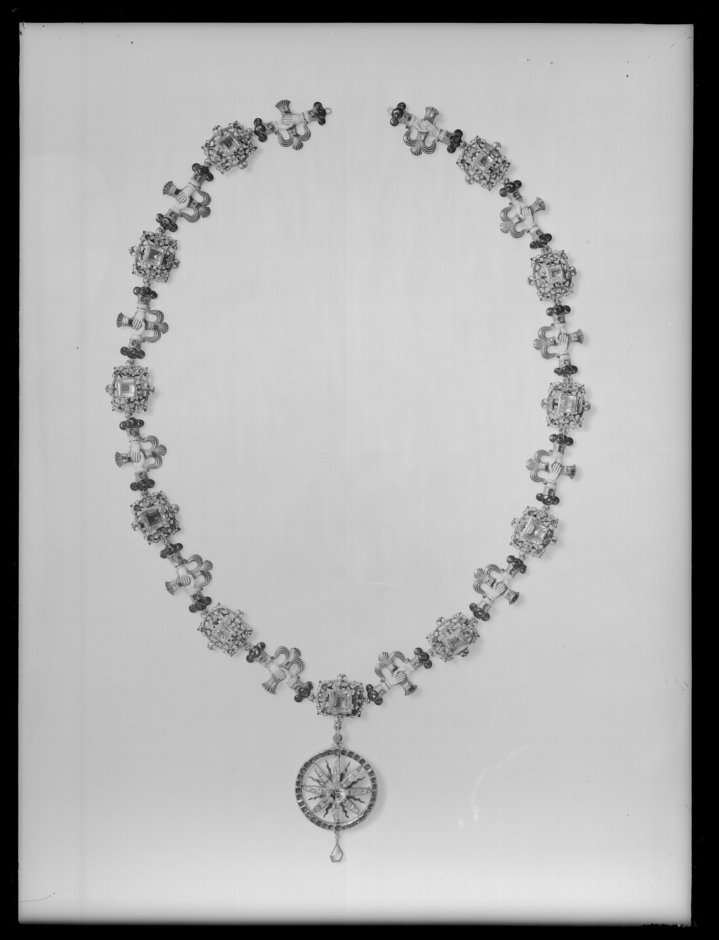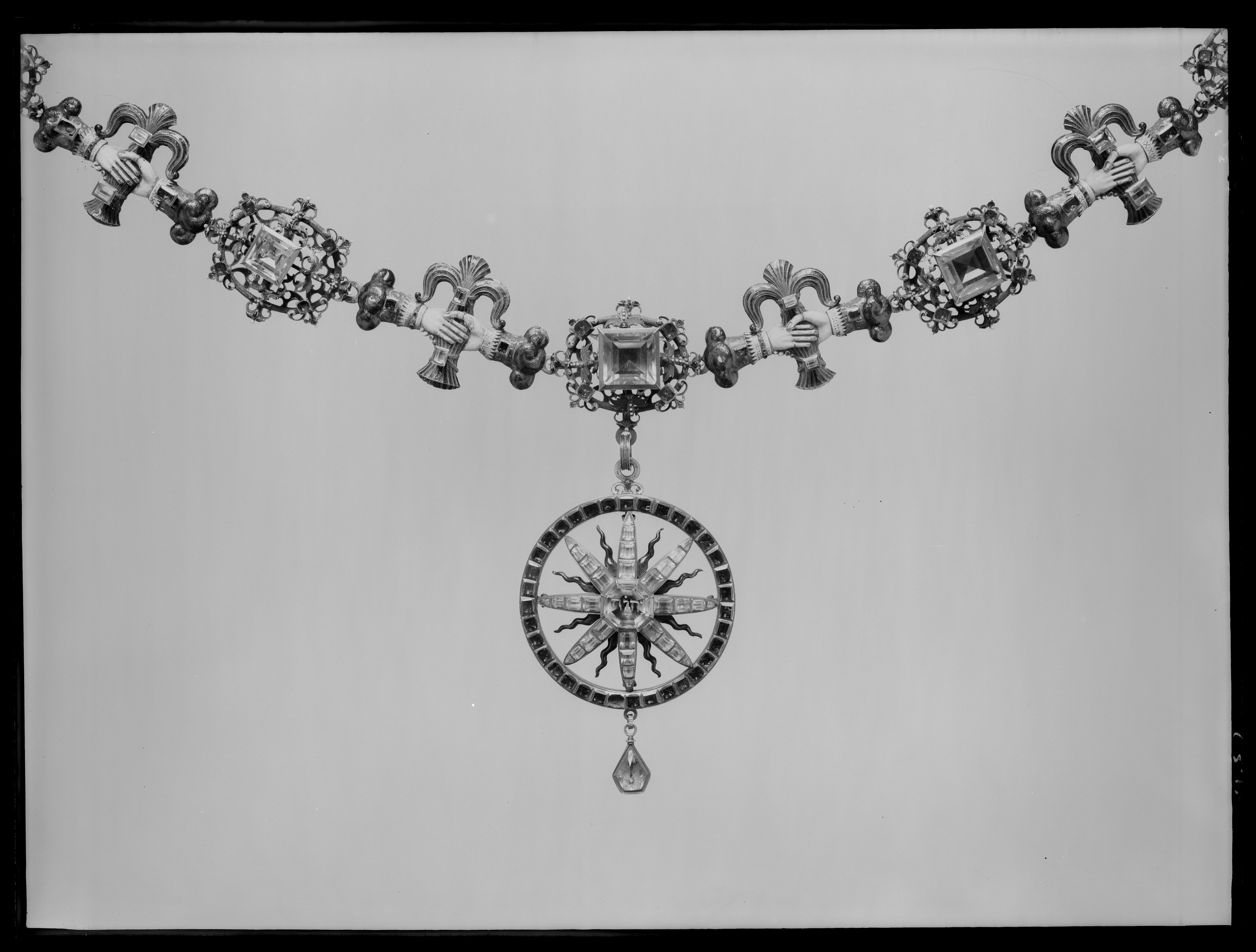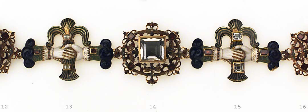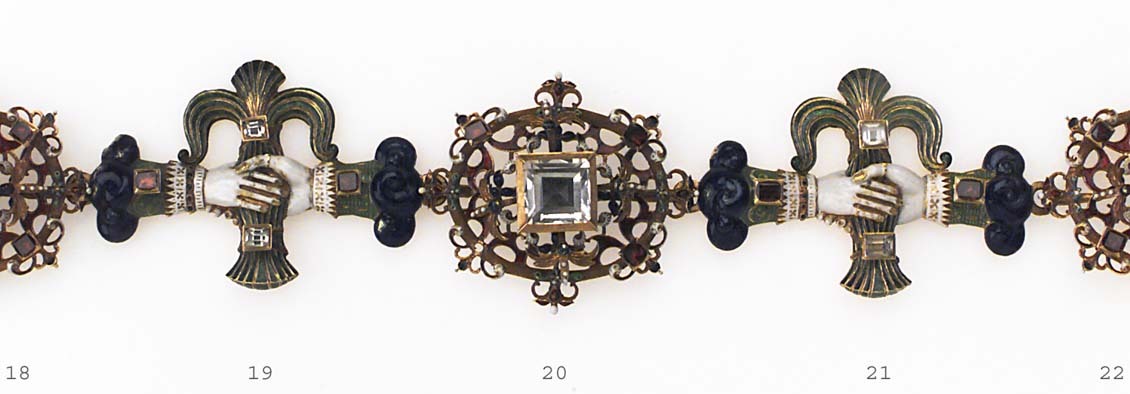 Sammansatt av 23 länkar av guld, emalj och besatt med bergkristall och granater. Elva ovala länkar i rikt genombrutet arbete ned dekor i vit, röd, ljusblå, mörkblå och svart emalj. På varje länk en taffelslipad bergkristall, bredd: 14-19 mm, samt 4 mindre granater (1 granat utfallen ur sin fattning, saknas, 1 granat med fattning saknas). Tolv länkar av drivet guld och emalj, föreställande ett handslag, en vit mans- och en vit kvinnohand fattar om en grönemaljerad vase, armarna grönemaljerade med vita manschetter och kommande ut ur blåemaljerade moln. På varje arm en granat, på varje vase två bergkristaller (2 granater utfallna ur fattningarna och saknas). Stenarnas fattningar fastskruvade på baksidan av länkarna. I ändarna på länkarna med vasen öglor, på de andra hakar. Troligen buren av Karl IX vid kröningen i Uppsala 1607-03-15. Anmärkning: En oval länk med hake saknas möjligen, då kedjan ej går att häkta ihop. Tre granater urfallna ur fattningarna och saknas, en granat med fattning saknas.
