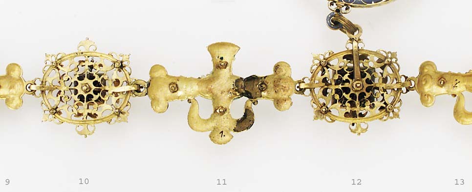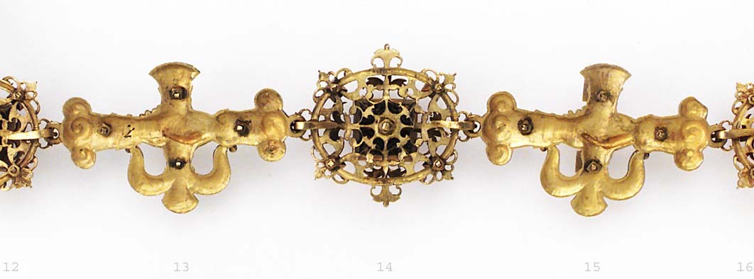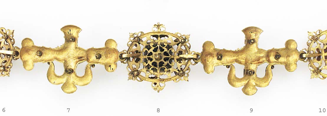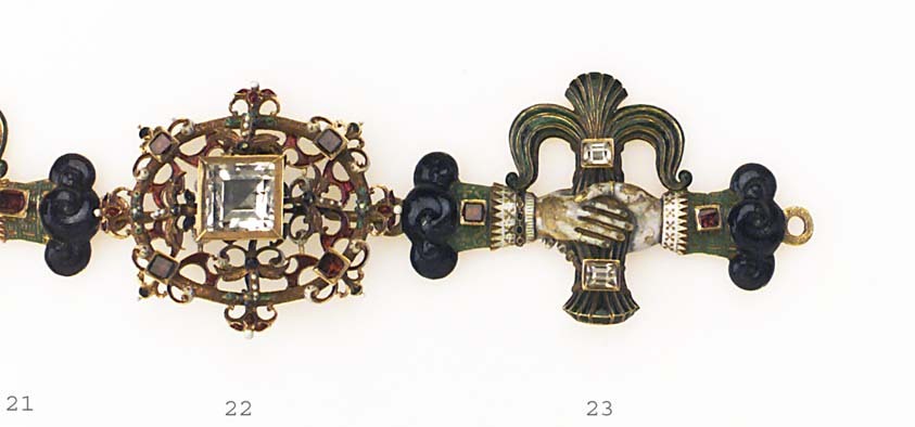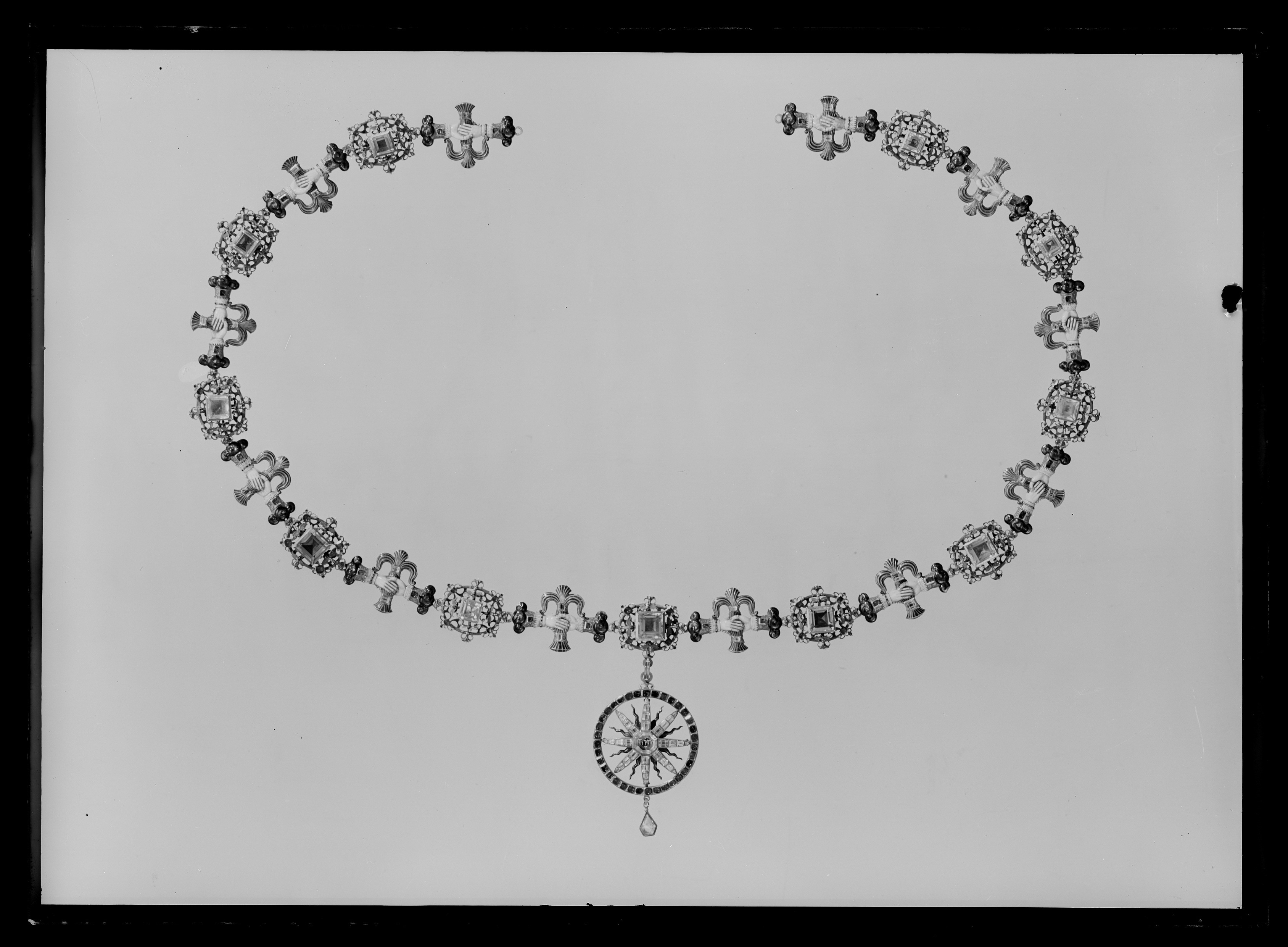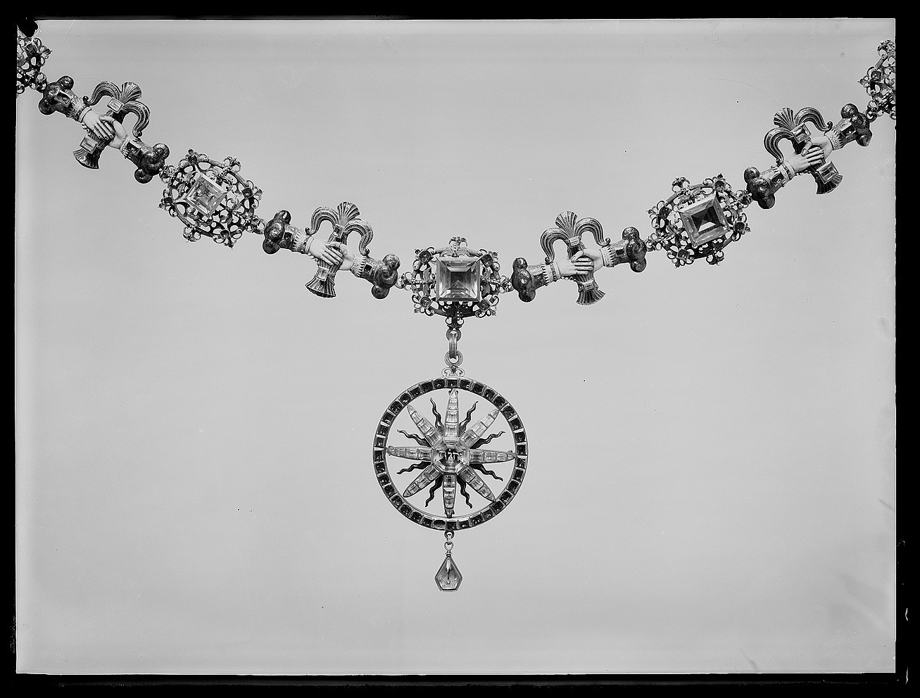 Sammansatt av 23 länkar av guld, emalj och besatt med bergkristall och granater. Elva ovala länkar i rikt genombrutet arbete ned dekor i vit, röd, ljusblå, mörkblå och svart emalj. På varje länk en taffelslipad bergkristall, bredd: 14-19 mm, samt 4 mindre granater (1 granat utfallen ur sin fattning, saknas, 1 granat med fattning saknas). Tolv länkar av drivet guld och emalj, föreställande ett handslag, en vit mans- och en vit kvinnohand fattar om en grönemaljerad vase, armarna grönemaljerade med vita manschetter och kommande ut ur blåemaljerade moln. På varje arm en granat, på varje vase två bergkristaller (2 granater utfallna ur fattningarna och saknas). Stenarnas fattningar fastskruvade på baksidan av länkarna. I ändarna på länkarna med vasen öglor, på de andra hakar. Troligen buren av Karl IX vid kröningen i Uppsala 1607-03-15. Anmärkning: En oval länk med hake saknas möjligen, då kedjan ej går att häkta ihop. Tre granater urfallna ur fattningarna och saknas, en granat med fattning saknas.