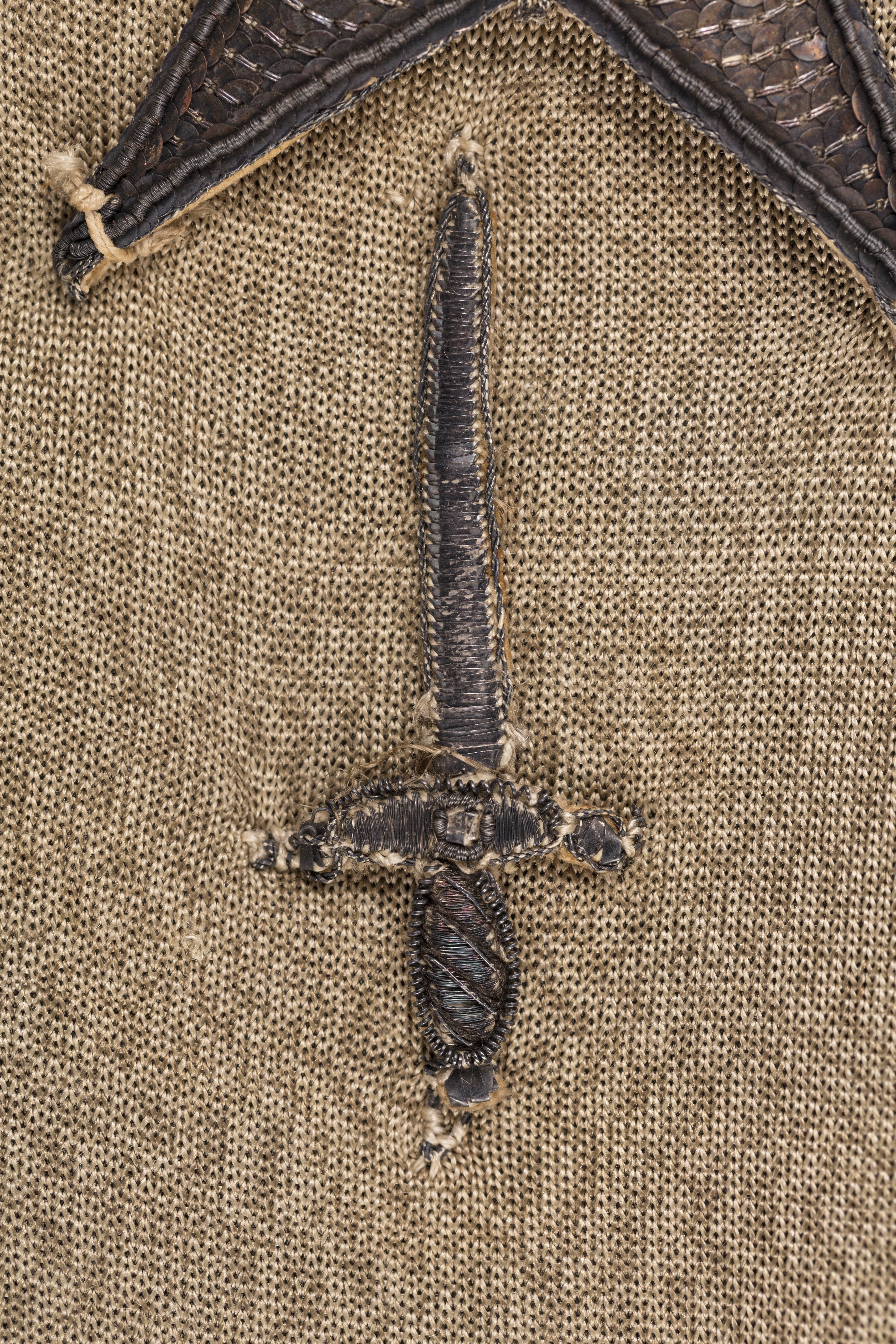 Jacka af grått meleradt silkesstrumptyg, fodrad med grått taft, med puffar öfver axlarna; små runda grå öfverklädda silkesknappar; samt på venstra sidan serafimerordens kraschan i silfverbroderi; baktill och nedtill synes en öppning efter mordskottet;