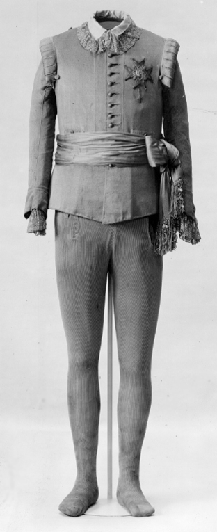 Kon. Gustaf III. Klädningen bars då konungen blef skjuten på maskeraden i operahuset natten emellan den 16 och 17 Mars 1792.