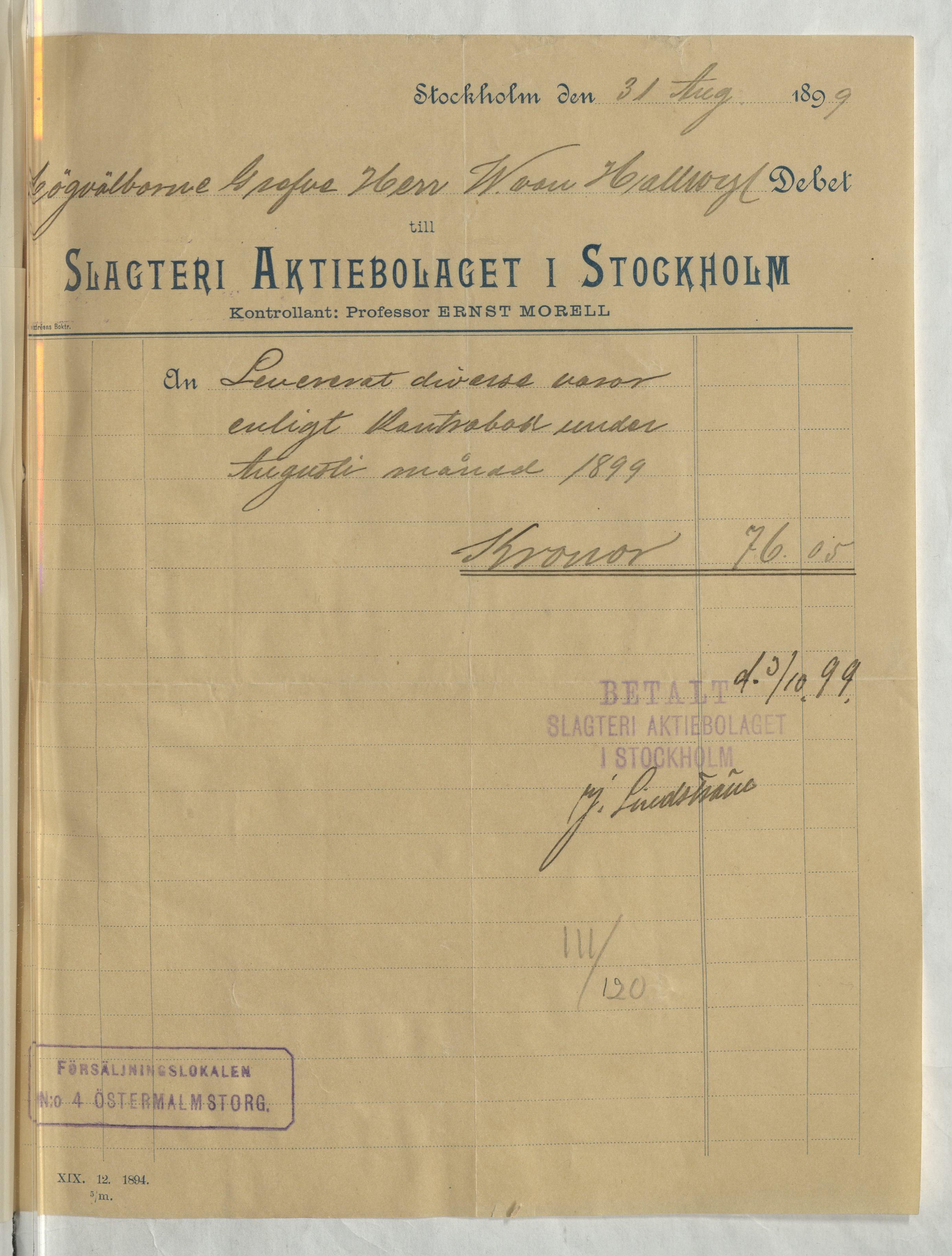 Kvitto från Slagteri Aktiebolaget i Stockholm