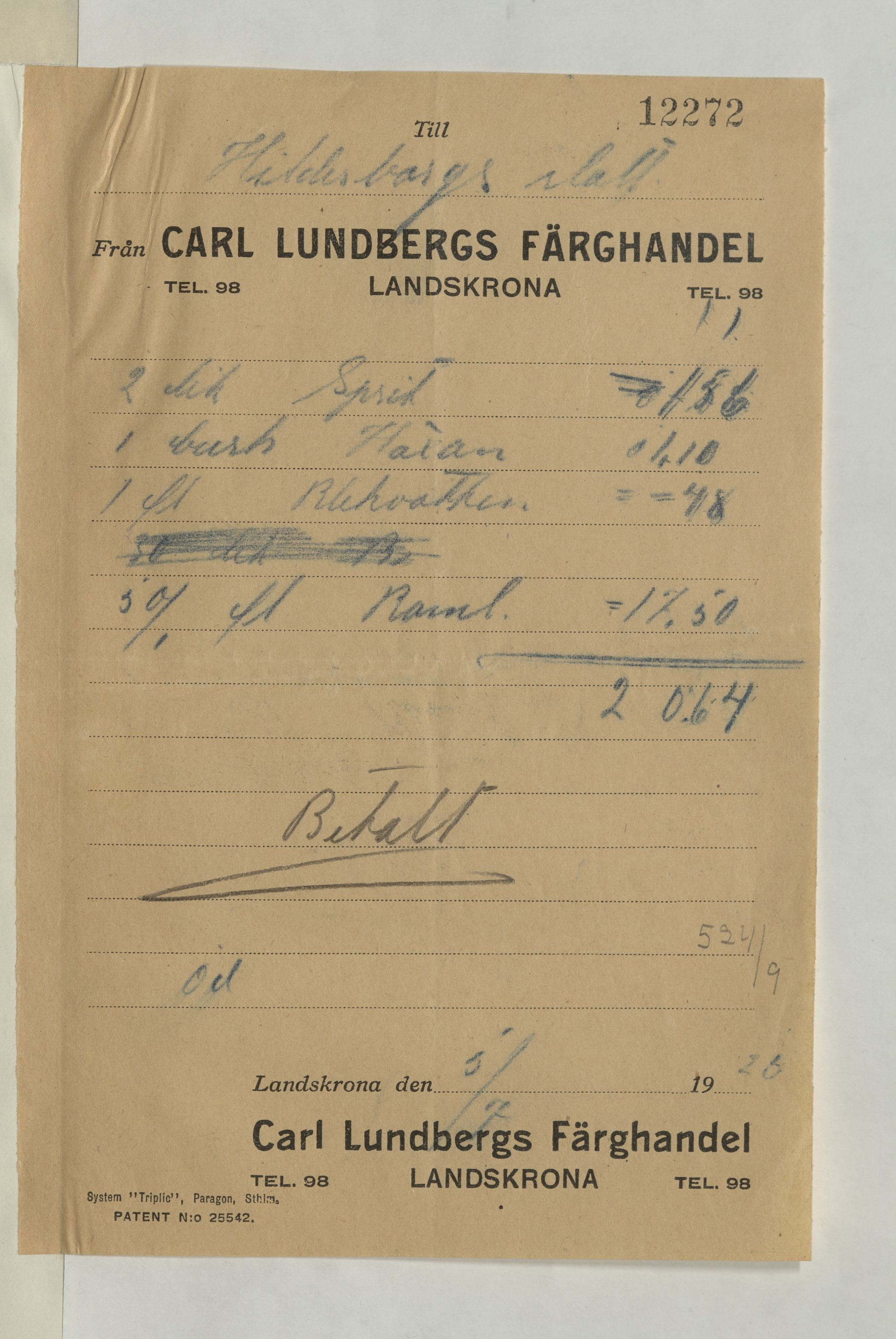 Kvitto från Carl Lundbergs Färghandel, Landskrona, till Hildesborgs slott. Sprit, Häxan, Blekvatten m.m för totalt 20:64Kr. Betalt 5 juli 1926.