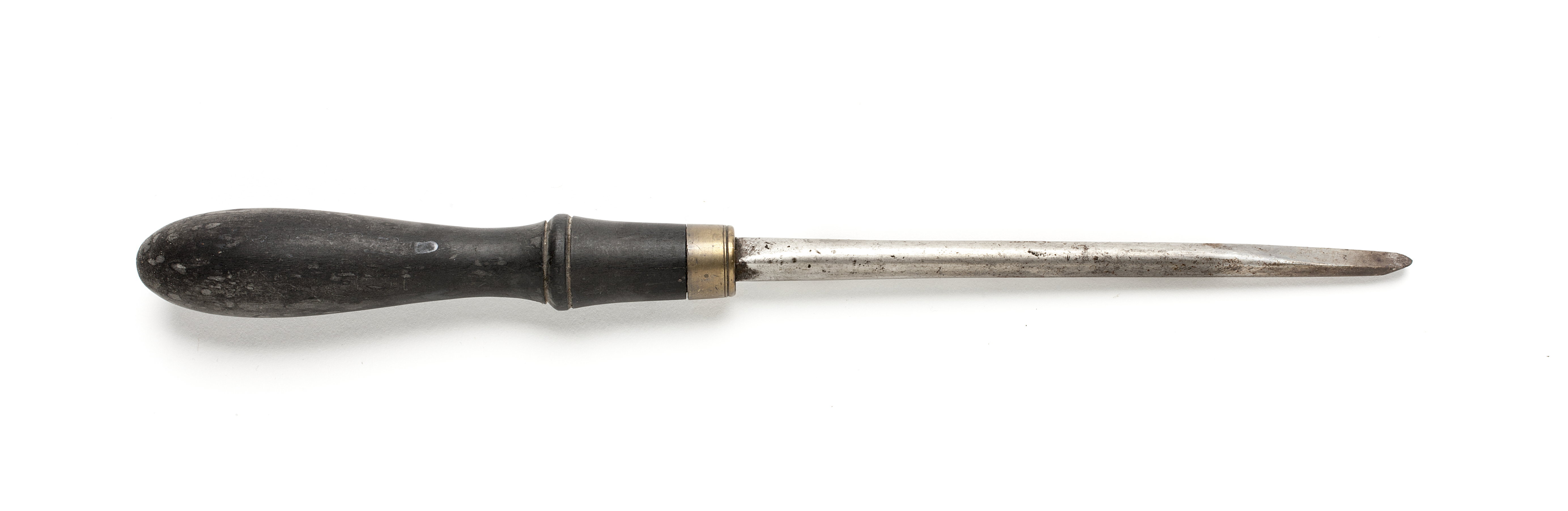 Rund klinga, i änden halvcirkelformig genomskärning. Svarvat skaft av ebenholts med en vulst. Mässingsring.