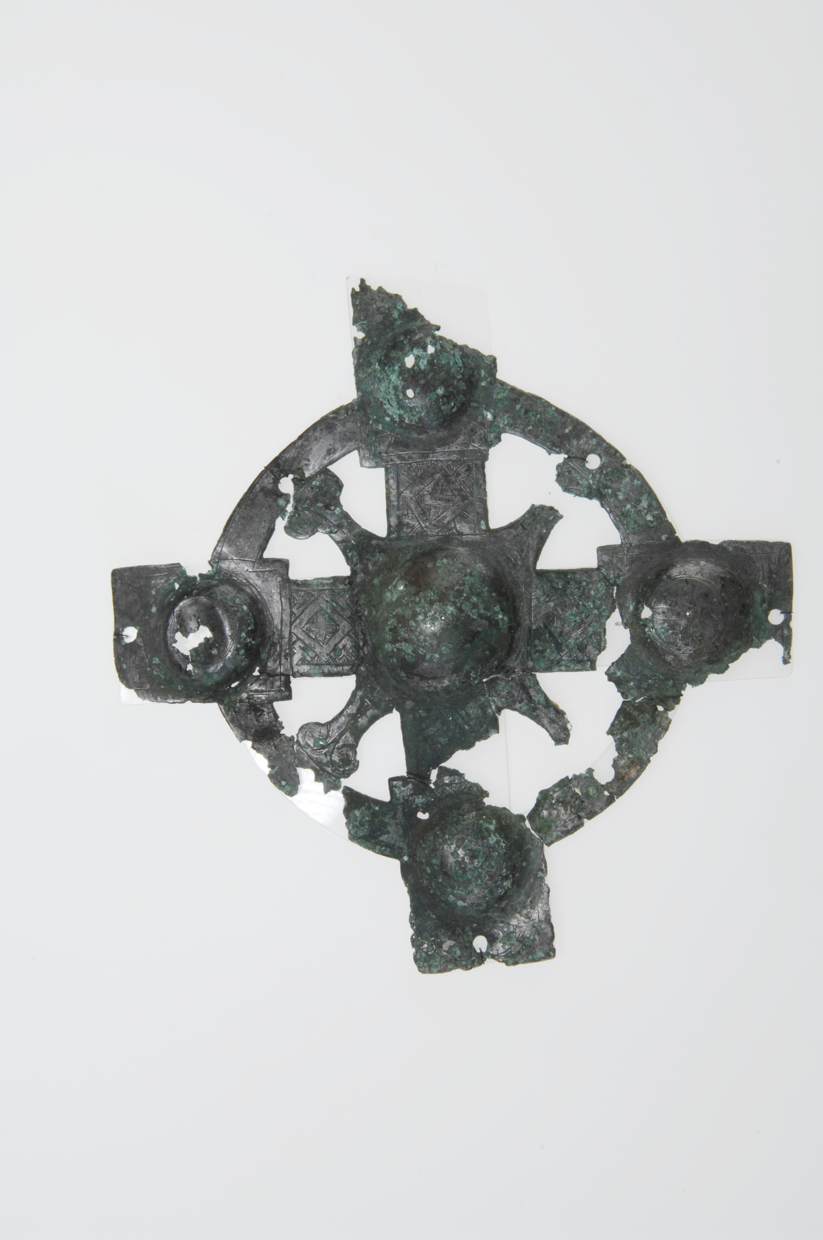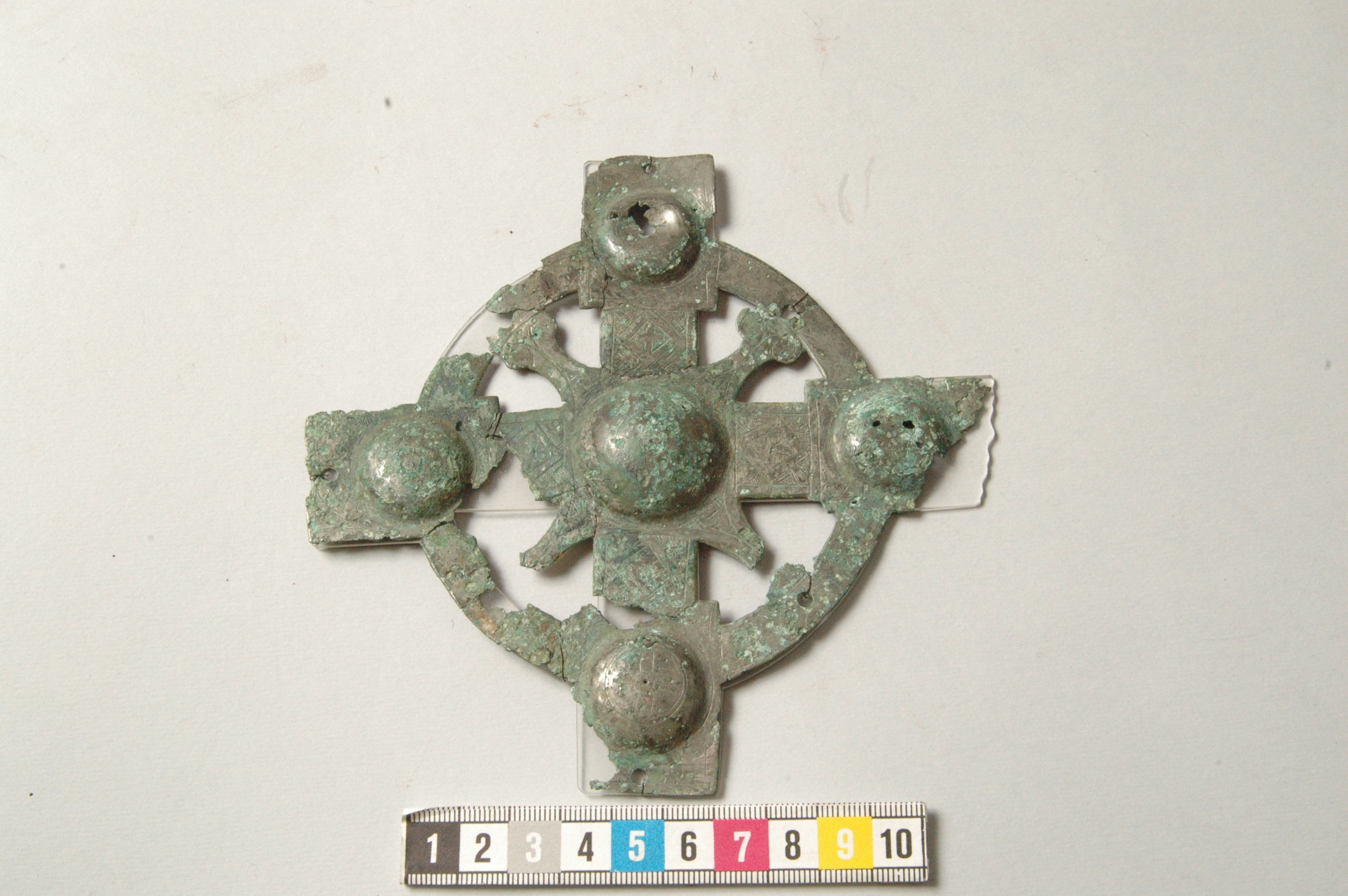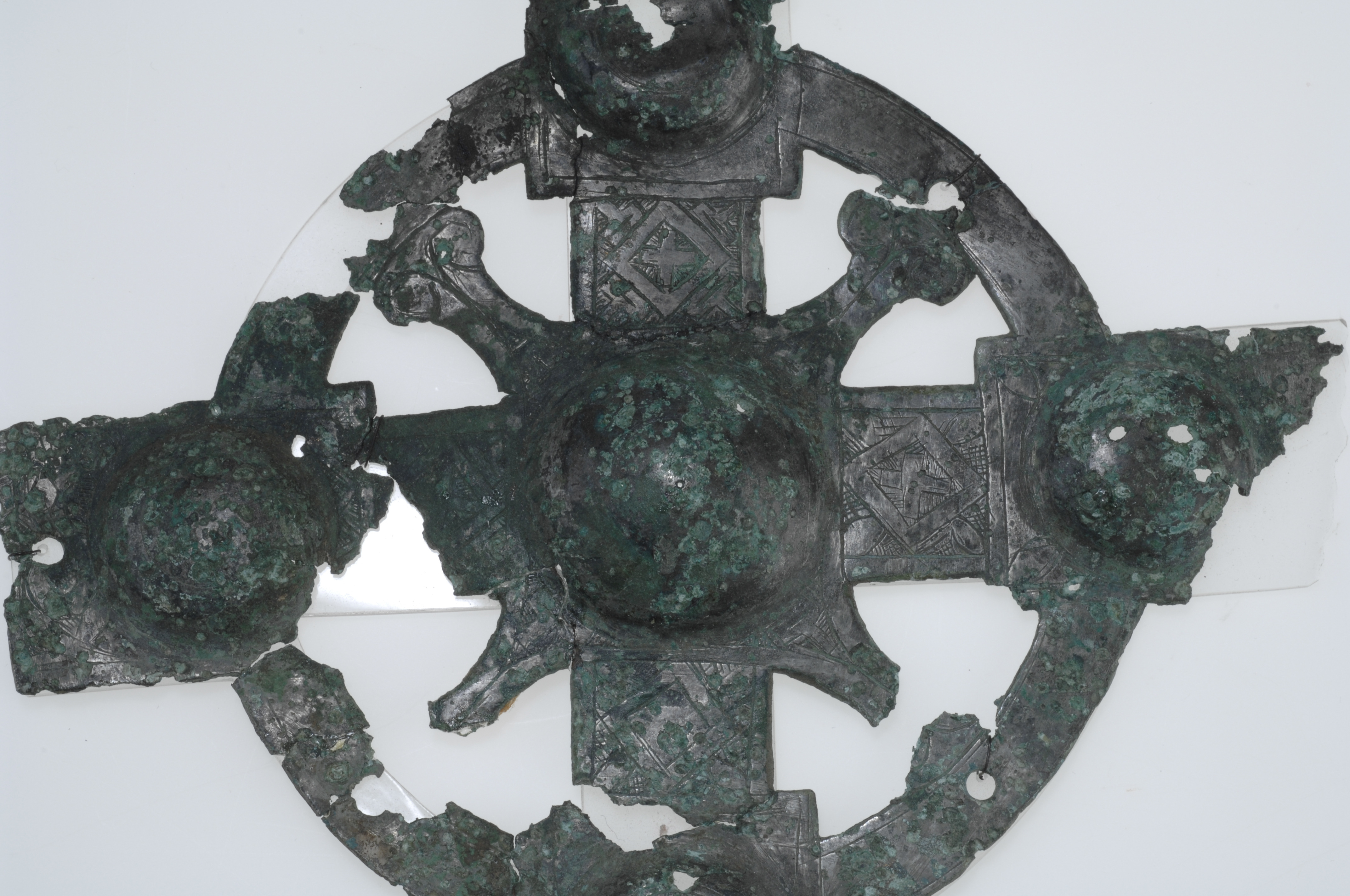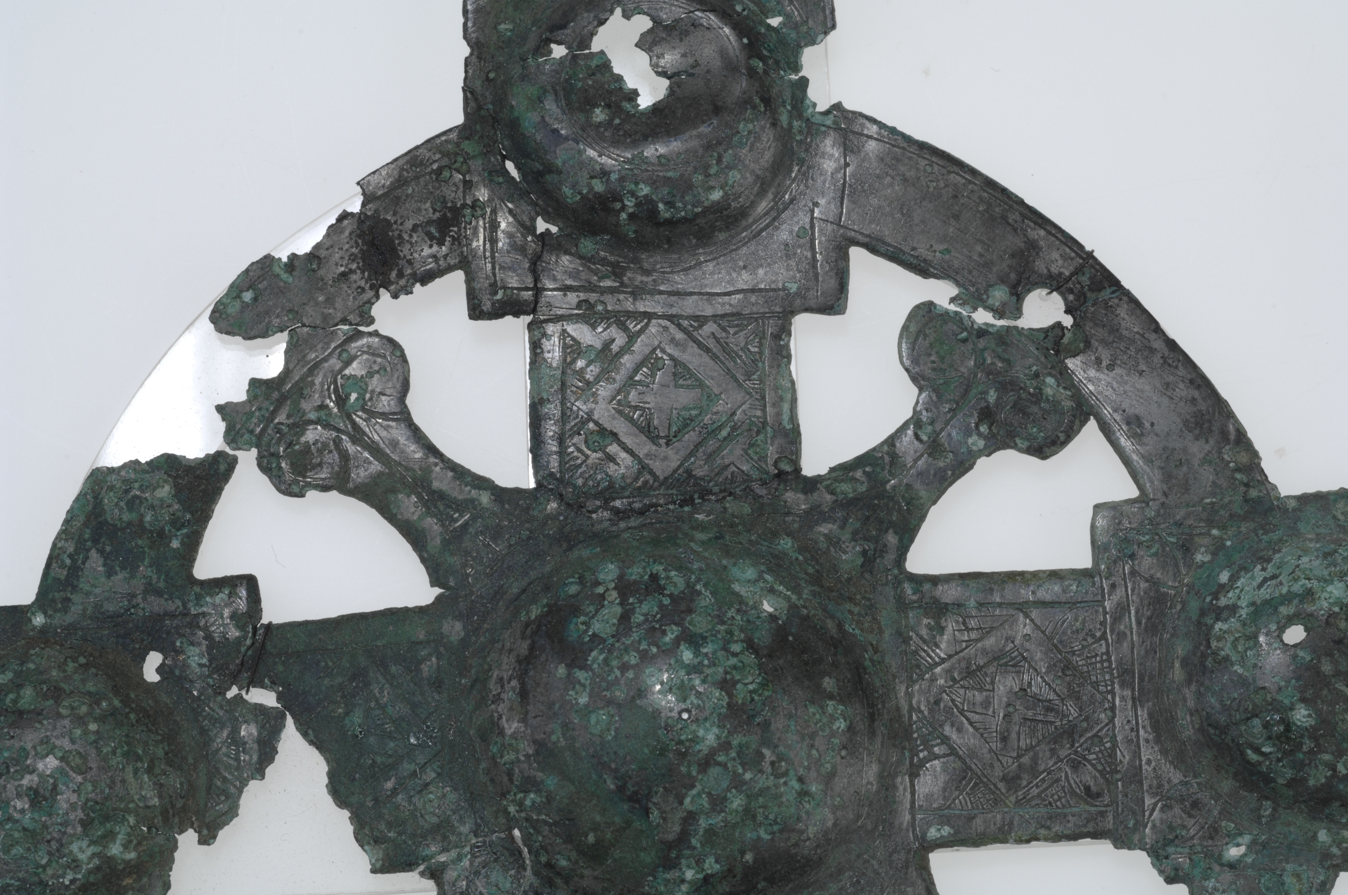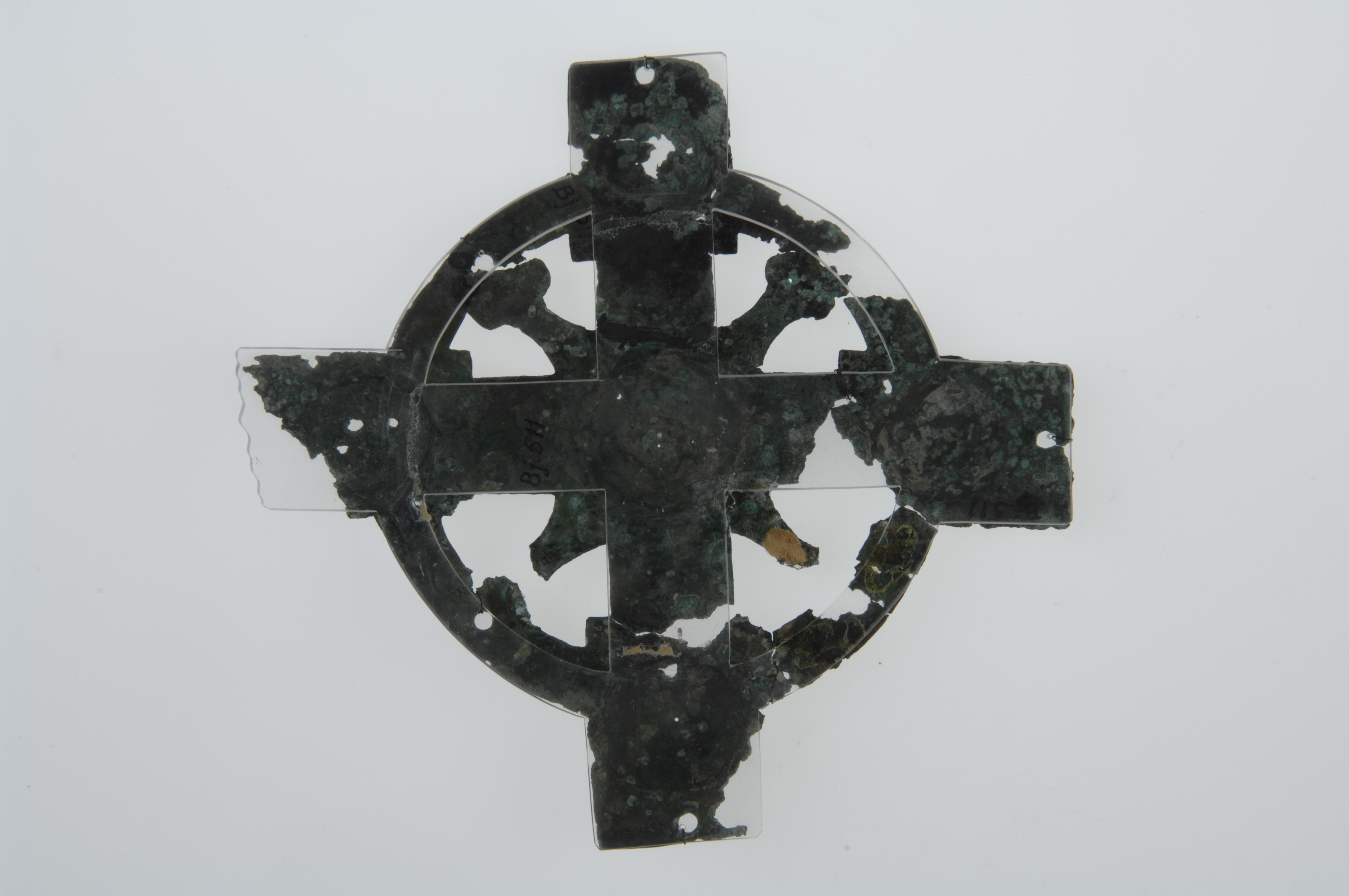 Ett iriskt dräktkors av bronsbleck med graverad dekor, belagt med tenn.