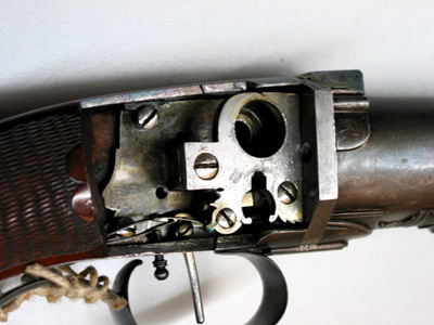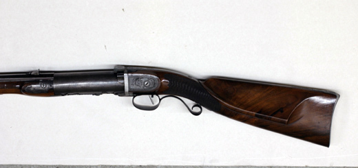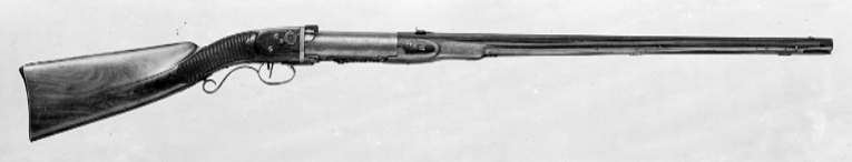 Åttsidig, brunerad, slätborrad pipa inslagen dekor av silver, vid pipbasen tvärgående linjer och däremellan kors, framför siktet samma dekor samt silversignatur: "SELLIER & COMP. A HAMBURG", samma dekor omger kornet. Inlaxade riktmedel: Klaffsikte med en klaff, platta med liljeformig, framåtriktad spets, framåt avsmalnande stolpkorn. Fästning: Två häften. Under kammaren inlaxat en stålstav med hak för slutningsregeln samt ett stift för fjädern. Pipan fäst i framstocken med ett, urspr. två pipstift av stål. Bakom pipan en stålcylinder, d: 40,4 mm, l: 129, i vilken pumpkolven löper. Kolv med läderpackning(?). Fyrsidig kolvstake med tandad överstida (kuggstång). På staken är trätt två spiralformiga bandfjädrar av stål. Staken går igenom ett rektangulärt hål i låshusets framvägg, därbakom två kulissväggar och däremellan en fjäderbelastad spärr, som trycks in av avtryckarstången och frigör pumpkolven. Den ena väggen utdragen bakåt, på v. sida graverad signatur: "Alex: Medin // in // Mscheno"(?). H. vägg av stockens trä, lås och med blånerat stålbeslag med graverad sicksackbård samt bladranka, runt hål för veven med vridbart lock, graverad, åttabladig blomma. Brun helstock av valnöt i två delar. Kolv med kindstöd och nätskurna fält på kolvhalsens sidor. Beslag: Näsband av horn , övriga beslag av stål. Bakplåt med lång flik på kolvryggen, graverde blom- och bladrankor. Sidbleck med rundad bakände, graverad sicksackkantbård samt blom- och bladranka. En + två runda rörkor med änd-ringar, spetsrörka med bred spets med graverad hund, bladformig ände..Vid framstockens bakände stålbeslag med rankdekor, på h. sida skjutregel för pipans slutning, i pipnoten vinkelfjäder för regeln samt spiralformig bandfjäder för pipan. På stockens undersida beslag över framstock och pumpcylinder, fäst med två skruvar i framstocken och en i cylindern, delen över cylindern konturerad och försedd med dekor av tvärrefflor. På bakre delen ett fast underbeslag, dekorerat på samma sätt som det främre beslaget, över cylinderänden upphöjt i rundade avsatser. I underbeslaget intappat en flamhärad varbygel med graverad dekor i oval, svan (?) med lyftade vingar. Kluven bakre stolpe och fri bakre arm med spiralformigt upprullad stolpe, bladformig ändplatta med graverad dekor. På kolvens undersida urtag för en oval platta som nu saknas. Tillbehör: Laddstock av trä, l: 481 mm, framtill avsmalnad för beslag.