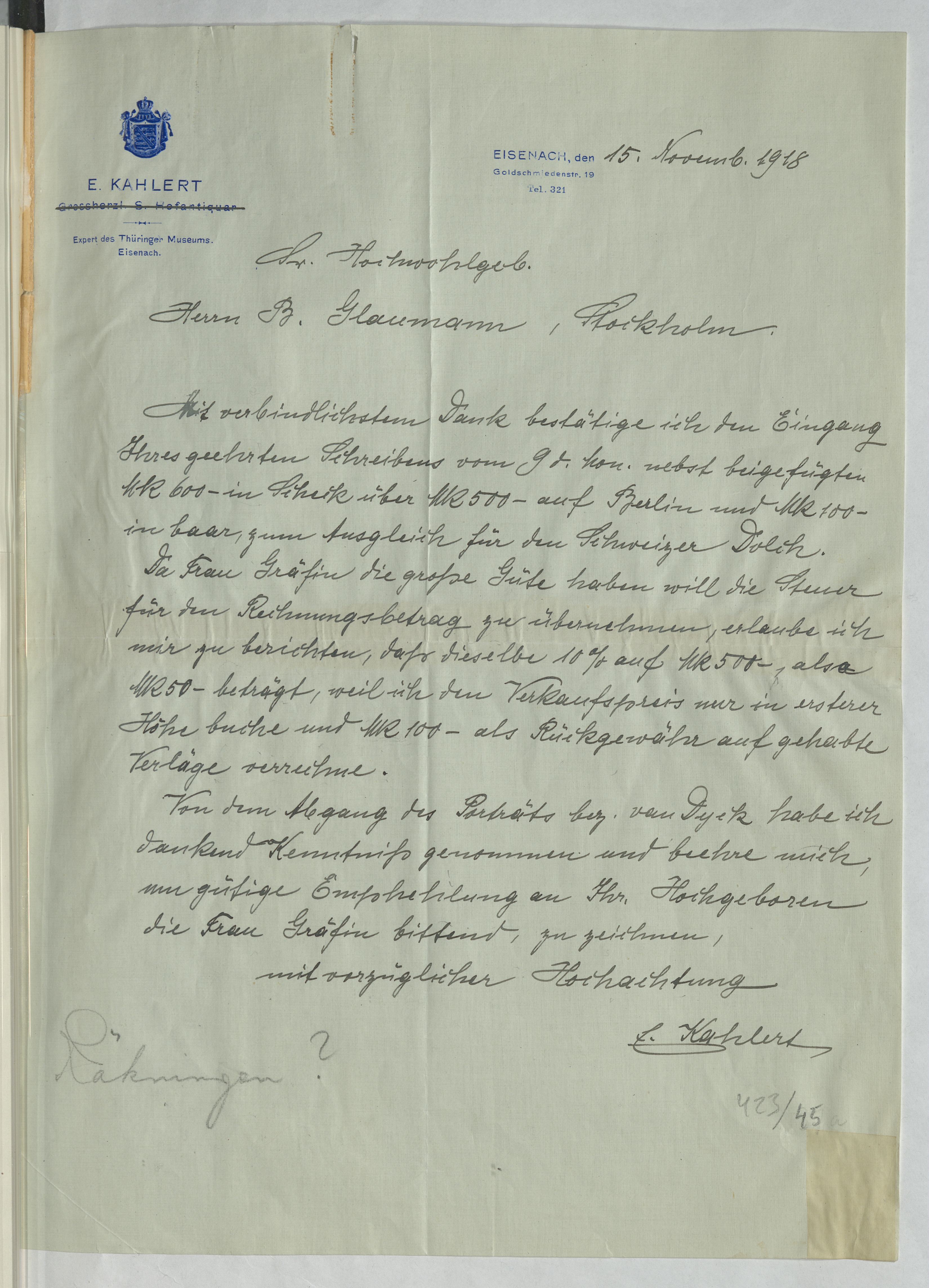 Brev från Eduard Kahlert där han tackar för betalningen för en schweizisk dolk på 600 som kom i två omgångar, en på 500 i överföring och en på 100 kontant. Han vill påminna om skatten på beloppet och så tackar han för informationen kring van Dyck-målningen.