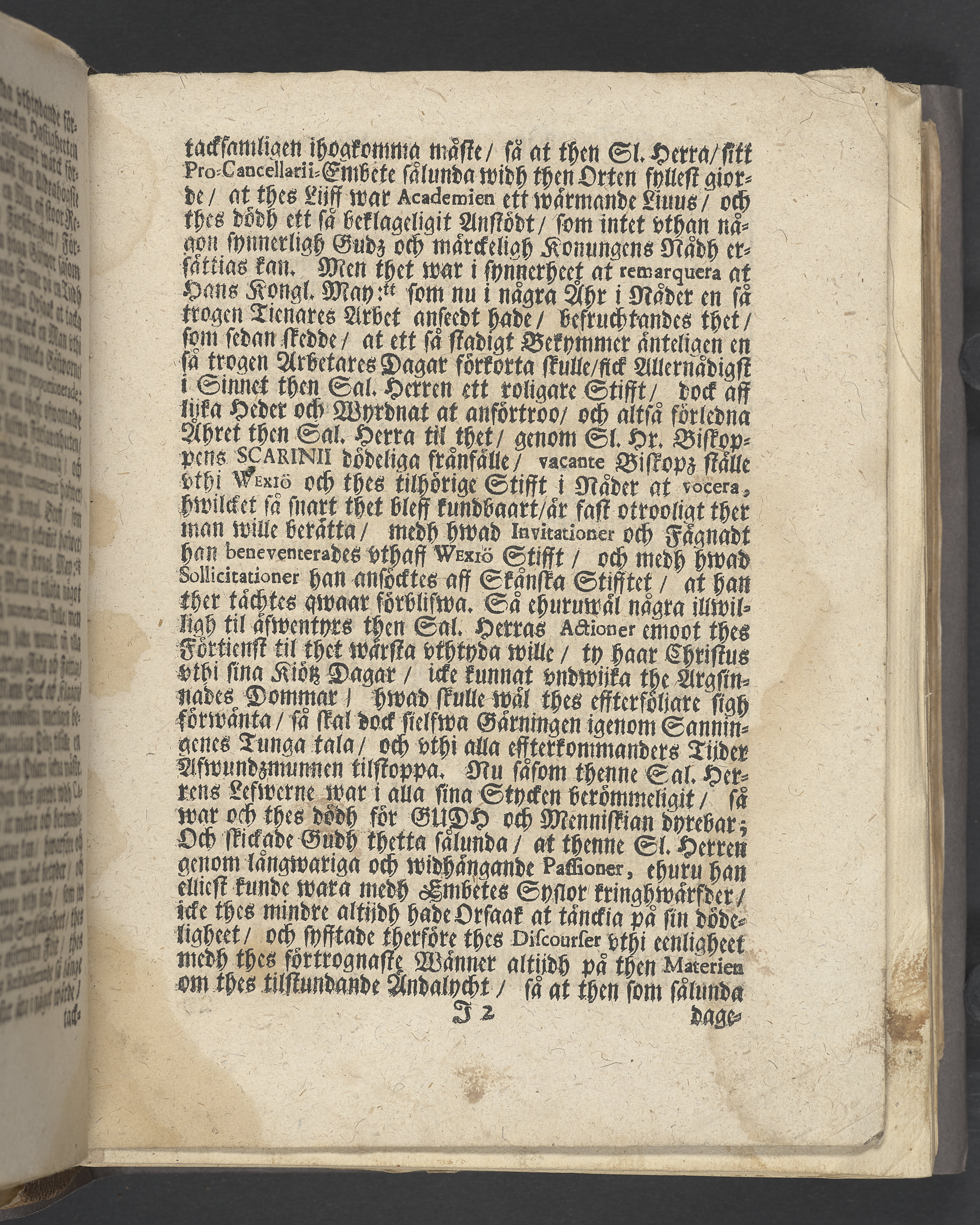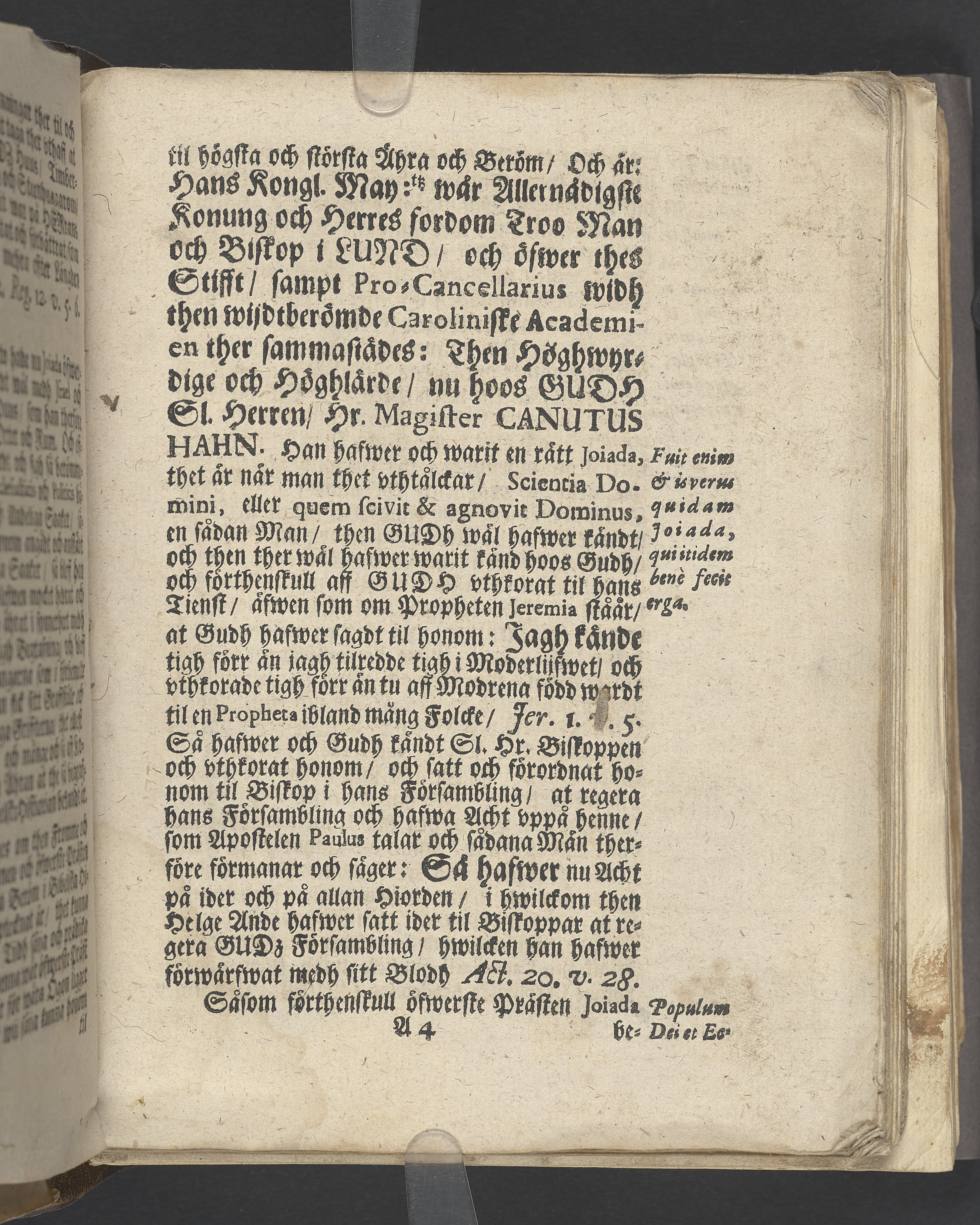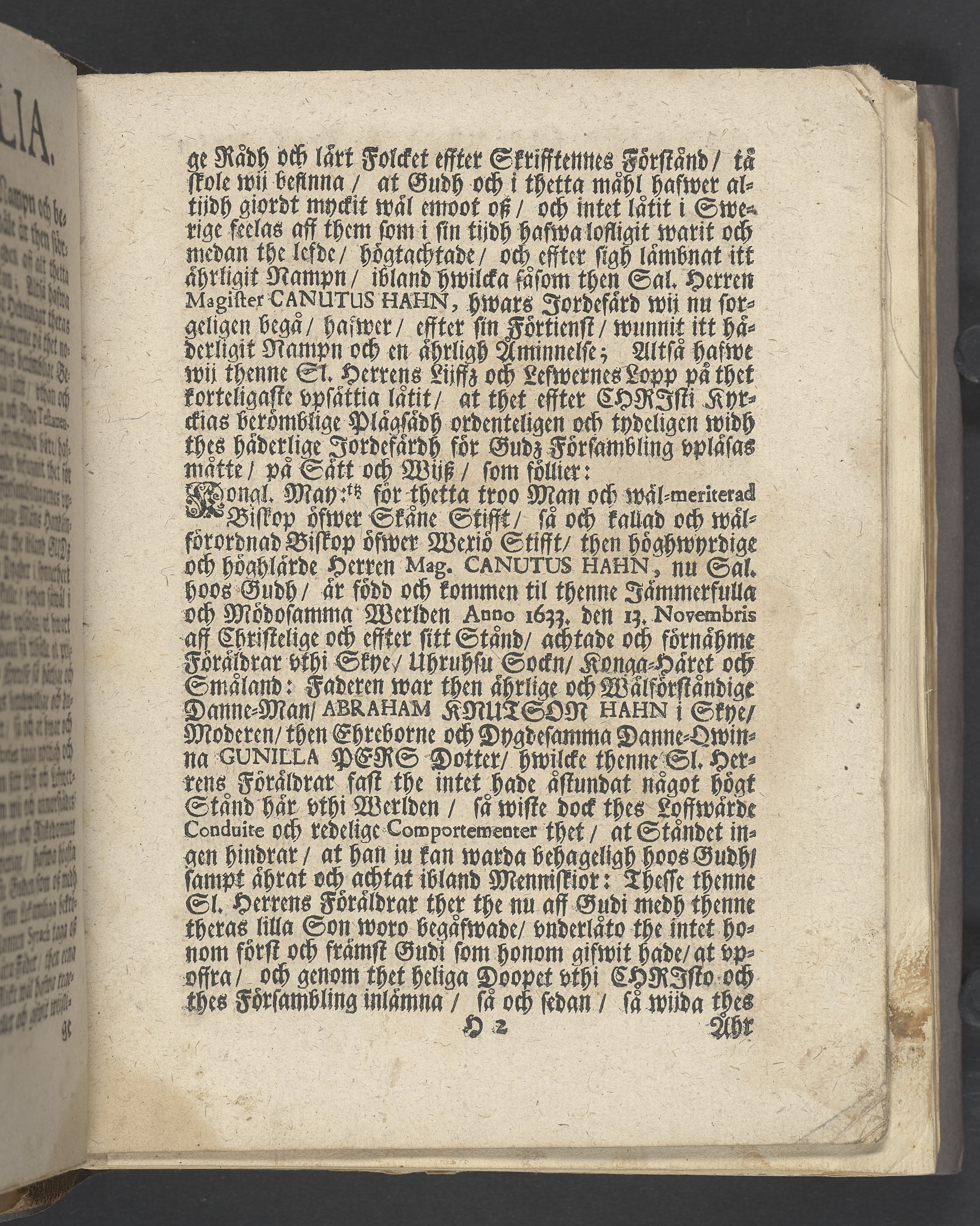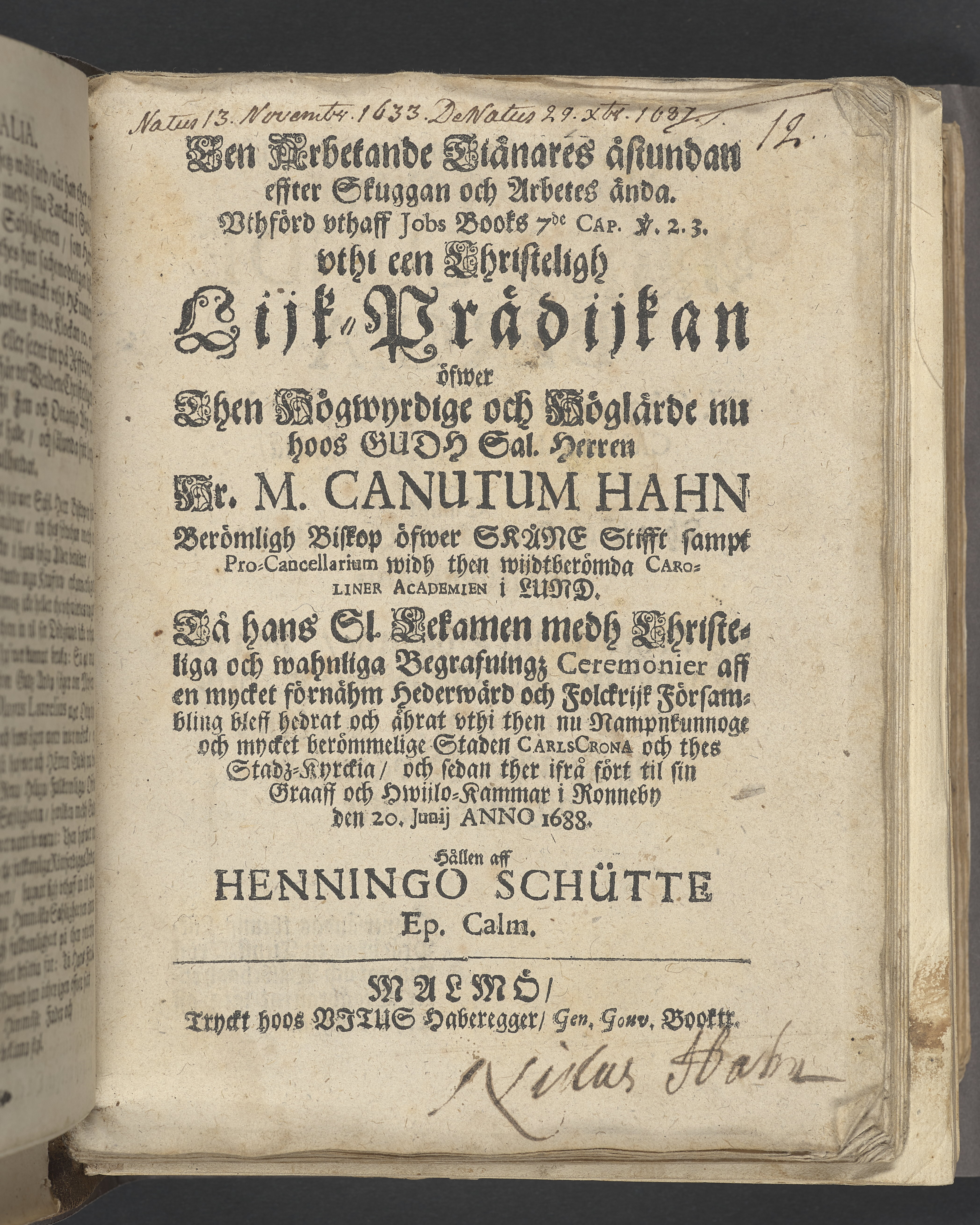 Een arbetande tiänares åstundan effter skuggan ... vthi een christeligh lijk-prädijkan öfwer ... Hr. M. Canutum Hahn berömligh biskop öfwer Skåne stifft ... tå hans sl. lekamen ... bleff hedrat och ährat vthi ... Carlscrona och thes stadz-kyrckia, och sedan ther ifrå fört til sin graaff och hwiilo-kammar i Ronneby den 20 junij anno 1688. Hållen aff Henningo Schütte ep. Calm. Malmö, tryckt hoos Vitus Haberegger, gen. gouv. booktr.