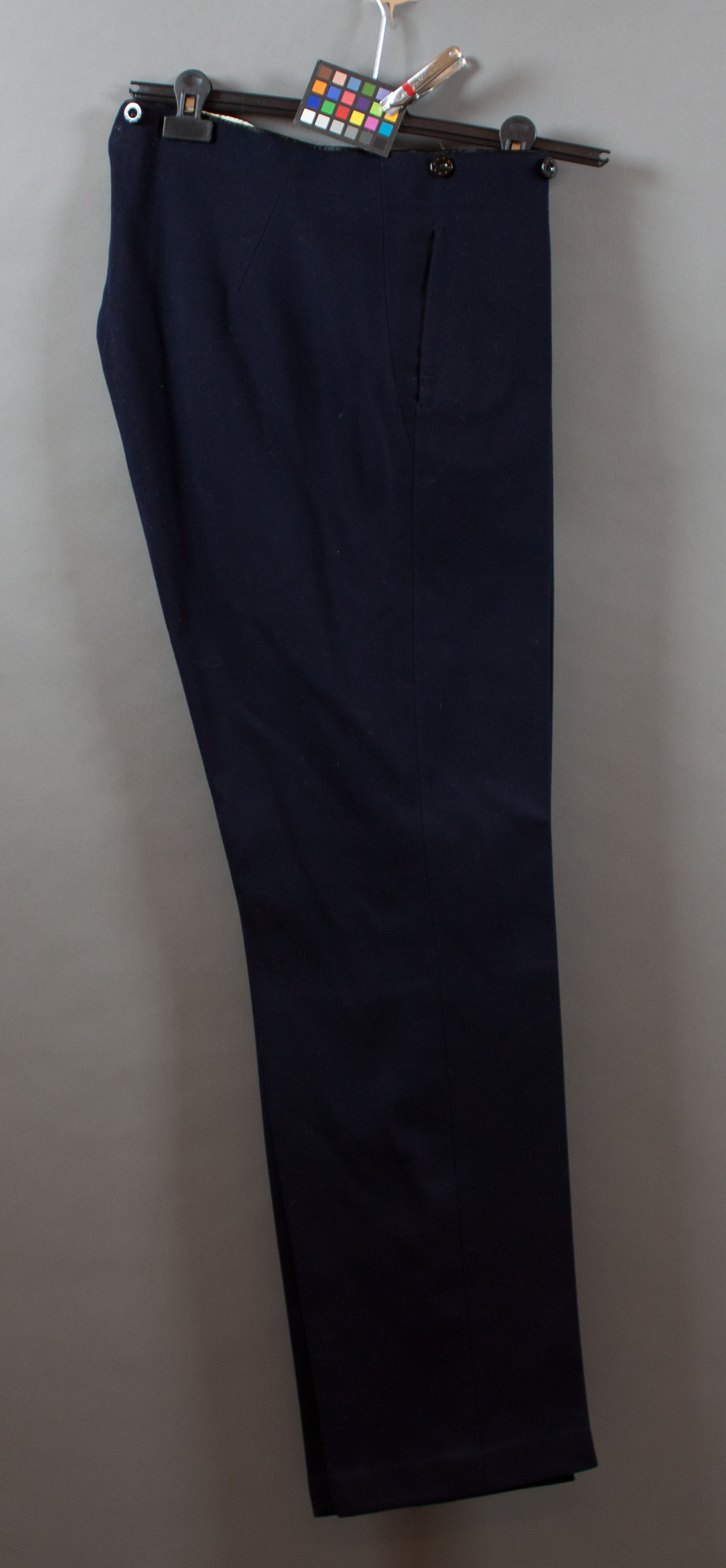 Långbyxor av mörkblått kläde. Knäppes i livet med två knappar, varav en är klädd med svart kläde. Gylfen knäppes med fyra knappar, diam: 14 mm. På linningens utsida knappar för hängslen, tre på varje sida. Baktill sprund i linningen. Sidosömsfickor. Bakom fickorna är i sidsömmen en kil av samma material insydd. Byxbenen raka och nedtill snett avskurna. Linningens insida fodrad med vitt bomullstyg med svarta sneda linjer, bredd ca 40 mm. Därnedaför en remsa av svart bomullstyg, bredd: 55-75 mm. Fickorna av vitt bomullstyg. I övrigt ofodrade.