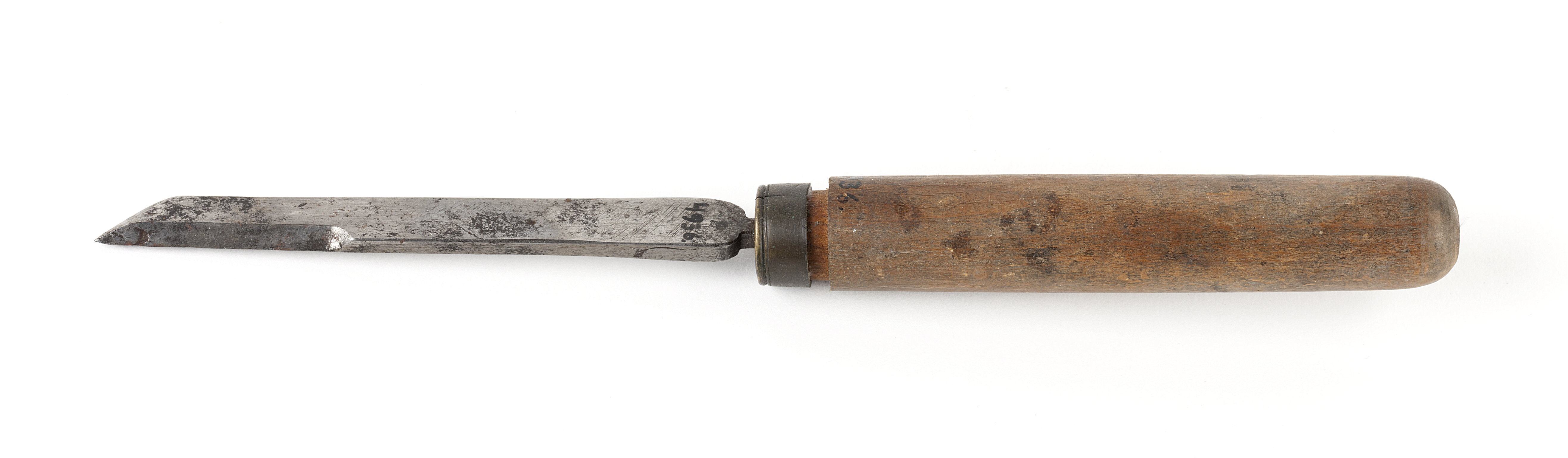 Klinga med rektangulär genomskärning, rundad bas. Sned främre egg samt en sidoegg. Cylindriskt, svarvat skaft av bok. Mässingsring.