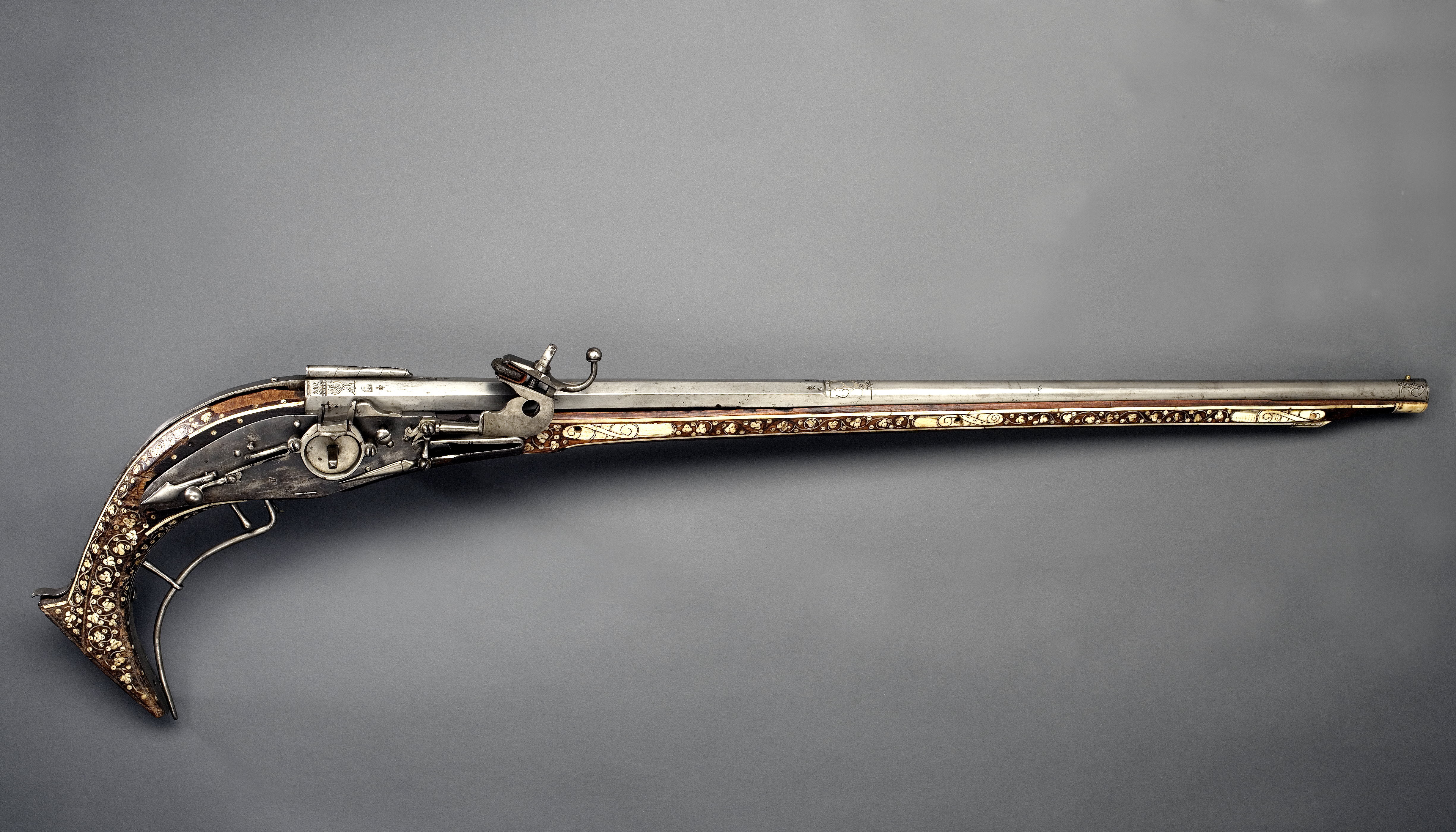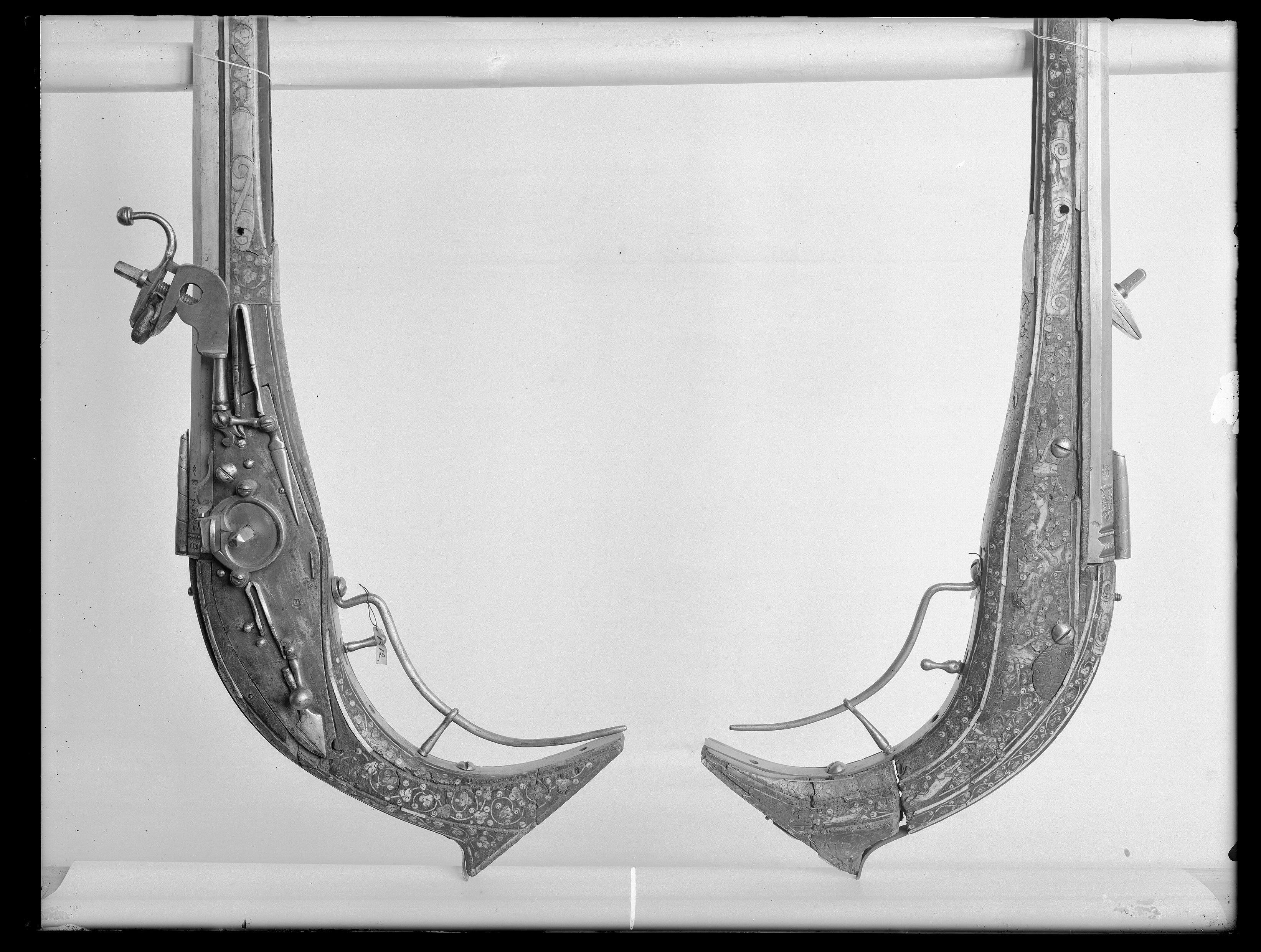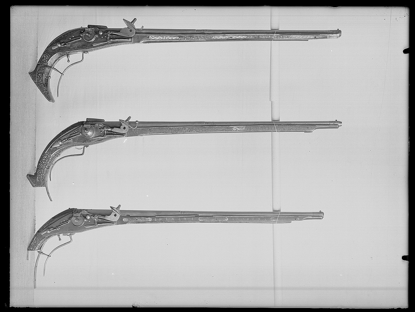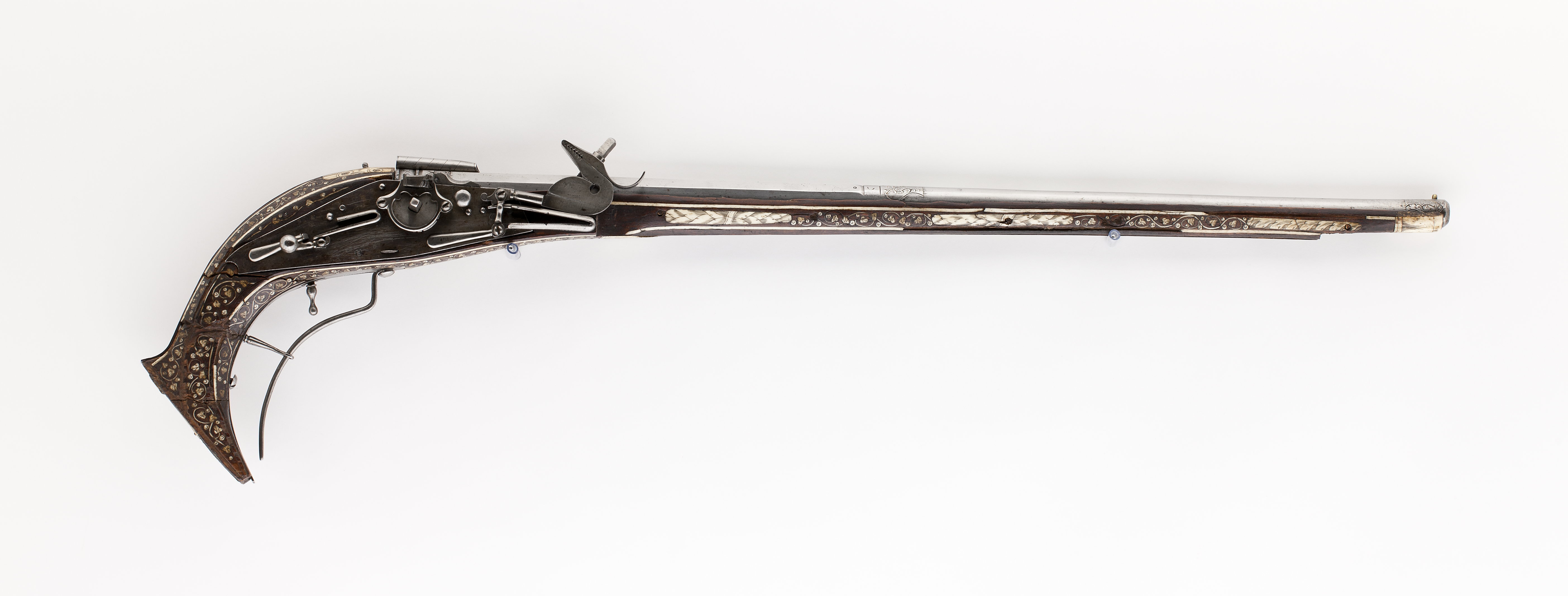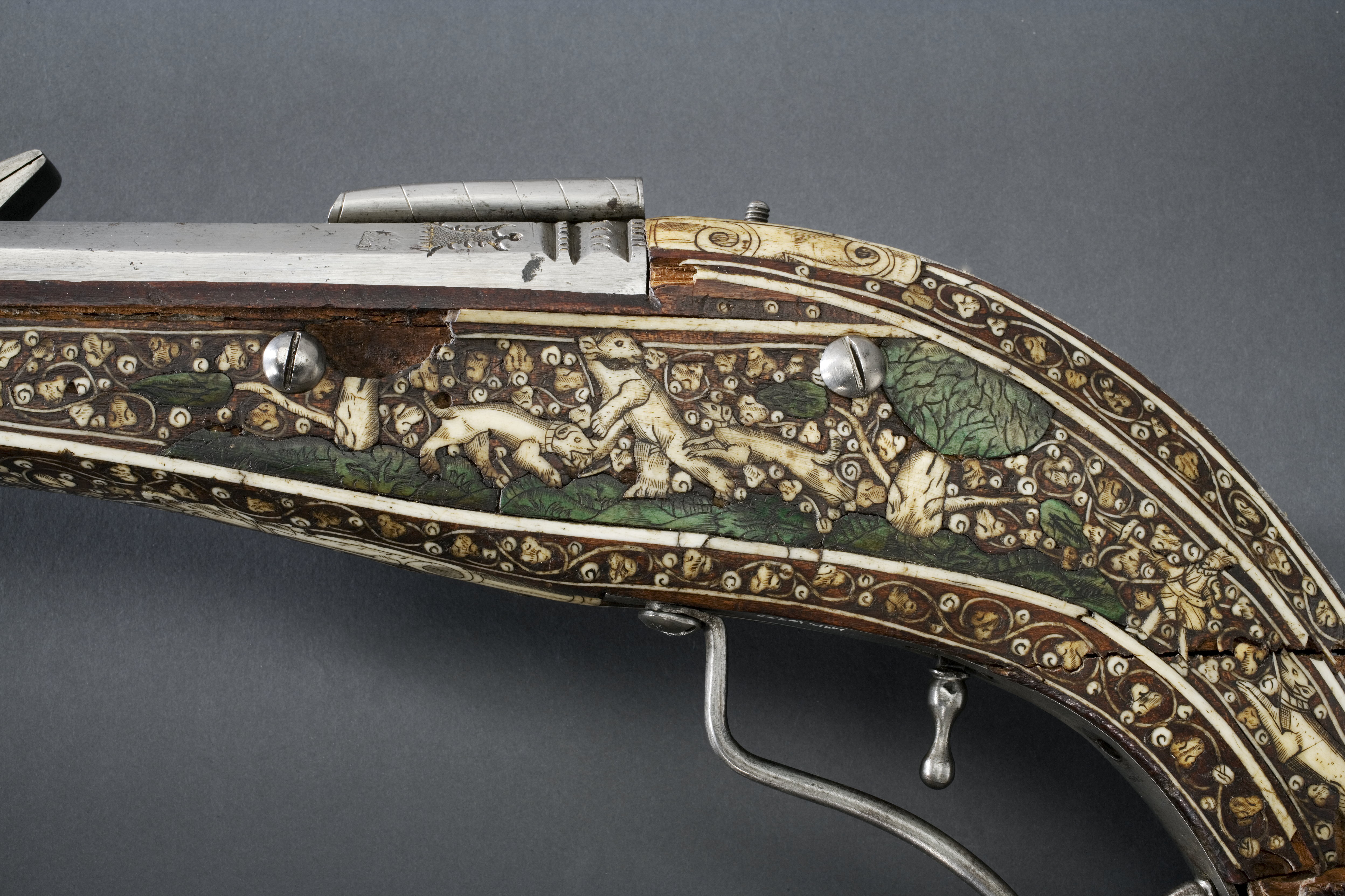Rund, slätborrad pipa av stål med åttsidig kammare, fasad kant vid mynningen. Svansskruvbladet ca 270 mm långt och nedåtsvänt utefter kolvryggen, i ytteränden uppåtböjt för hälen. På de tre övre sidorna vid pipbasen, vid övergången till rund del samt vid mynningen punsad rankdekor med rester av vit(?) massa (förgyllning?). Framför den punsade dekoren på kammaren stämplar, lika på båda sidor, pipsmedsstämpel i form av en sköld med H S och hjort (LRK vägledning 1921:163). Framför siktet två stämplar: E i rektangulärt fält (1921:313) samt sköld med krönt örn (Aachens kontrollstämpel, Stöckelnr 8780). På de tre övre sidorna vid övergången till pipans runda del ringstämplar. Riktmedel: Rörsikte, solsikte, l: 66 mm med streckdekor, fem streck. Knoppkorn av mässing. Fästning: Tre häften. Pipan fäst med krysskruv underifrån samt en, urspr. två skruvar genom kolven från svansskruvblad till avtryckarbleck, tre pipstift av trä (nya). Hjullås med blånerat låsbleck med svagt nedåtsvängd bakre del, avslutad med hake, nedanför säkringen stämpel: E. Utvändigt hjul fäst med ring och skruvar kl. 3 och 9, riungen nertill rundad. upptill med konturerad insida och fasad utsida. Rektangulär fängpanna med låg krutskärm, svagt svängd nederkant, lock med rörlig arm, streckdekor på locket, tryckknapp med välvt huvud. Hane med rundad kropp, plan hals med runt hål, lös överkäke med uppåtsvängt grepp. Högt, blånerat käkskruvhuvud med kvadratiskt tvärsnitt och svagt välvd ovansida. Hanfjäder med rundat fasade kanter, långt, spetsigt, välvt, triangulärt fjäderlöv med rundad avslutning, l: 51 mm. Balusterformig hanstudel. Låset invändigt blankt förutom fängpannelockets drivfjäder och möjligen stångens bygel och slagfjäderns stöd som är blånerade. Säkring: Bakom hjulet virvelsäkring med kulformigt grepp, på bygeln ett spetsigt, triangulärt, välvt löv. Fästning och avtryckare: Två låsskruvar. Balusterformig avtryckare. Rektangulärt avtryckarbleck av stål från mitt under låset till kolvtån, hål för avtryckare och krysskruvar. Helstock av valnöt, petrinaltyp med nedåtsvängd kolv med avbruten ände. Nästan yttäckande dekor avvitt och grönfärgat, graverat ben, kantlister samt bladrankor. På sidbleckssidan en jaktscen i form av en på bakbenen rest björn, angripen av en hund som biter honom i framtassen och en bakifrån. Björnen ser bakomt mot jägare och ytterligare en hund, jägaren är iförd kyller och vida hosor och har i h. hand ett spjut med knävel. Marken och lövverket på träd och buskar grönfärgade. Framför avtryckarblecket en benplatta med avslutning framtill i form av en elefant(?) med upprullad snabel. Långa pipstiftbrickor med rundade ändar och s-formig rullverksdekor. Näsband och spetsrörka med streck- och bladdekor. Längs hela stocken släta kantlister av vitt ben samt ett rankverk med hjärtformiga blad och däremellan runda punkter. Kolvkappan saknas, på dess plats klistrat en blå-vit etikett med bläckpåskrift 1209. Stavformig varbygel, böjd i båge, framtill fäst med främre krysskruven, mittpå hållen av en balusterformig ståndar med ring om bygeln, bygelns bakände fri, bakre ståndaren saknas.