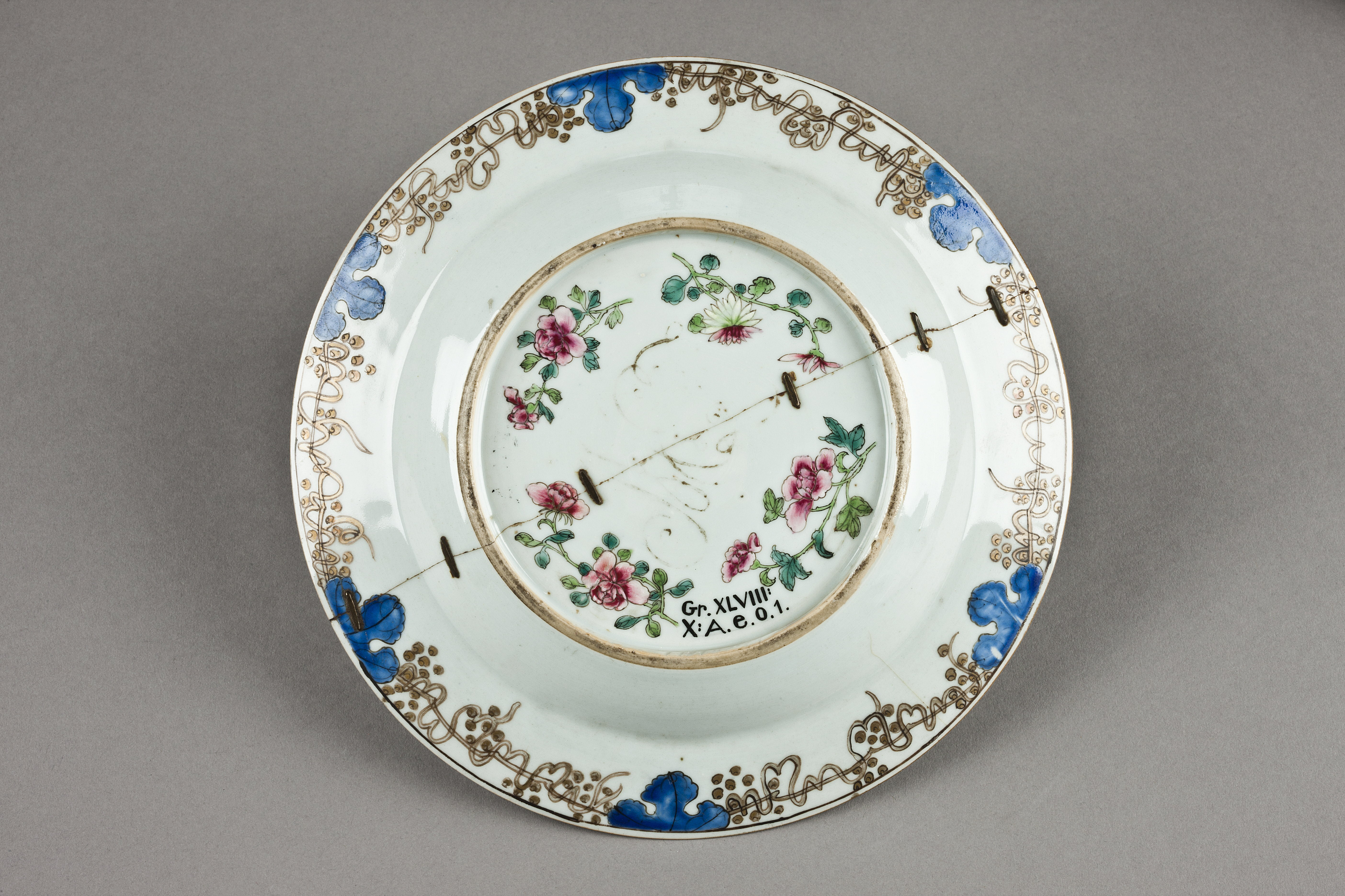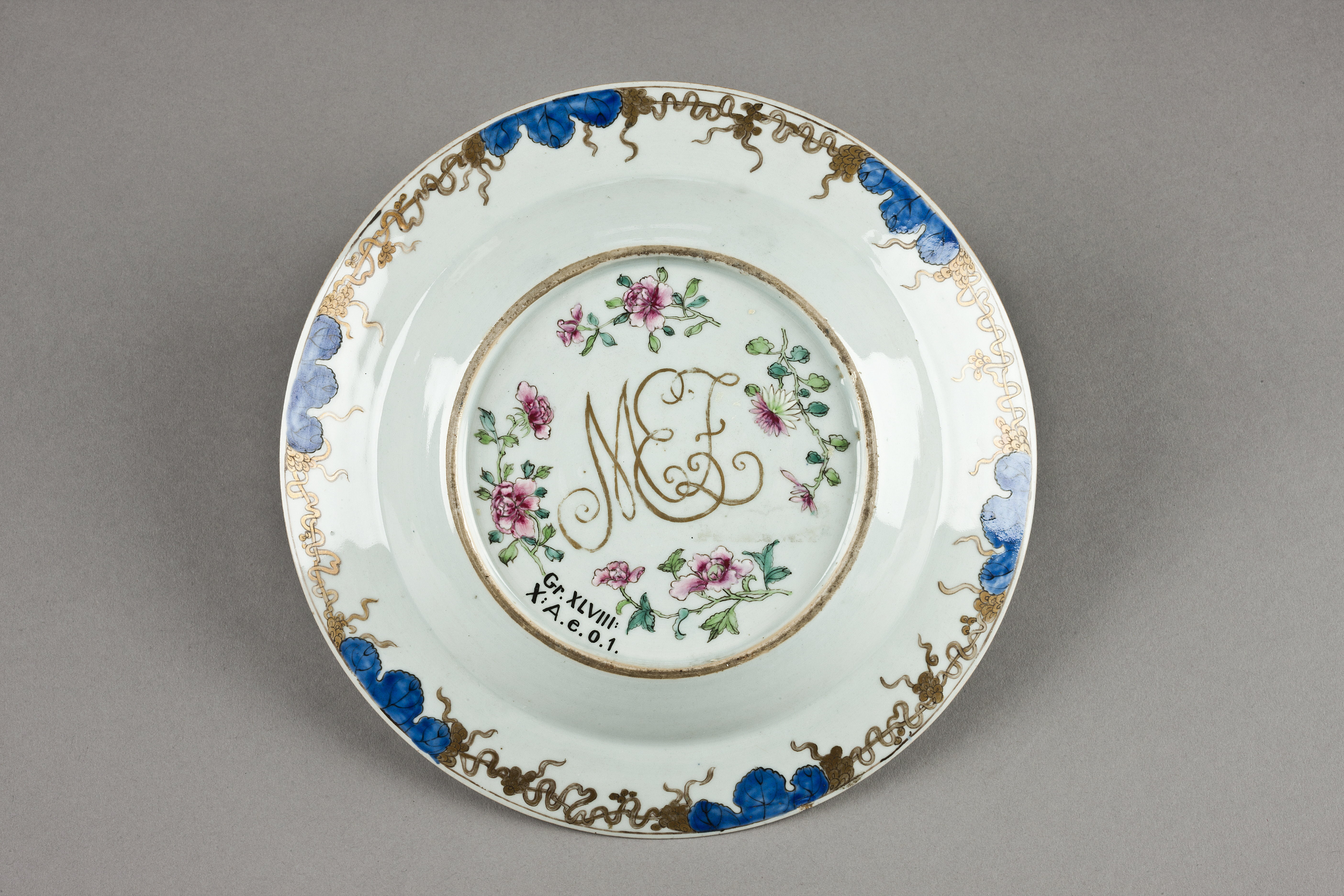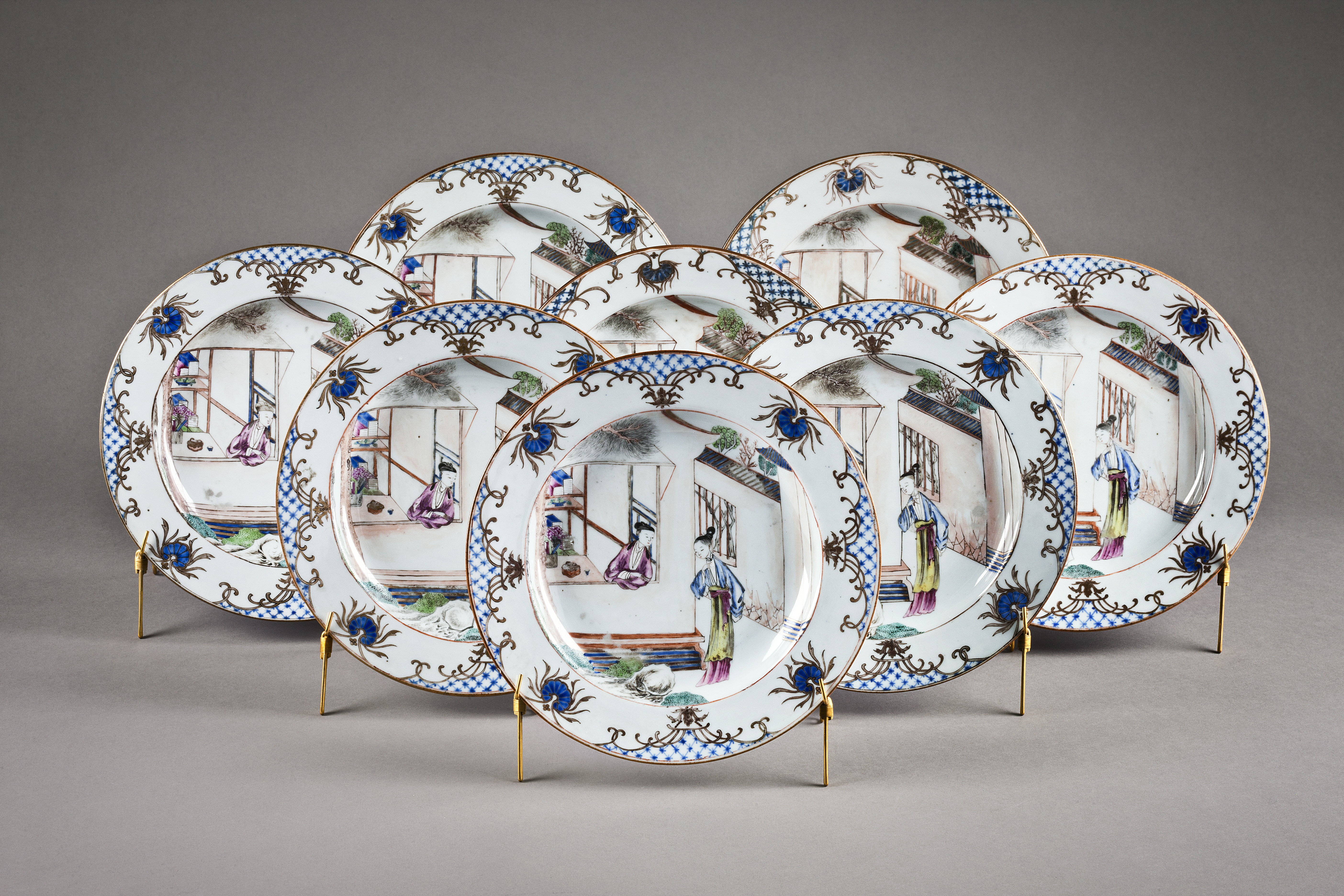 TALLRIKAR, åtta stycken. Runda, flata, med kälformig kep, snett utstående, rakt brätte samt insänkt botten. Överglasyrmålning med förgyllning. Tallrikarna ingick uppenbarligen i en servis tillverkad för Europa, för på undersidan av dem finns ett vackert monogram, »M.E.F«. Kantmönstret härrör också från ett specifikt västerländskt mönster, och har troligen skickats tillsammans med monogrammet för att kopieras. Bilden i mitten är dock av helt kinesiskt ursprung, då den föreställer en scen ur dramat »Romansen om den västra kammaren«, i vilket hjälten, den lärde Zhang, konverserar med Hong Niang. Hong Niang är tjänarinna till hjältinnan Yingying och fungerar som en mellanhand för de två unga älskande. Eight porcelain plates decorated in overglaze enamels with gilding Qing dynasty, c.1740-50. These plates clearly form part of a service made for Europe, for on their bases is a handsome monogram “M.E.F”. Their rim design also derives from a specific Western pattern, probably sent out along with the monogram to be copied. The central picture is entirely Chinese in origin, however, for it shows a scene from the drama “Romance of the Western Chamber”, in which the hero Scholar Zhang converses with Hong Niang. Hong Niang is maid to the heroine Yingying, and acts as an intermediary for the two young lovers.