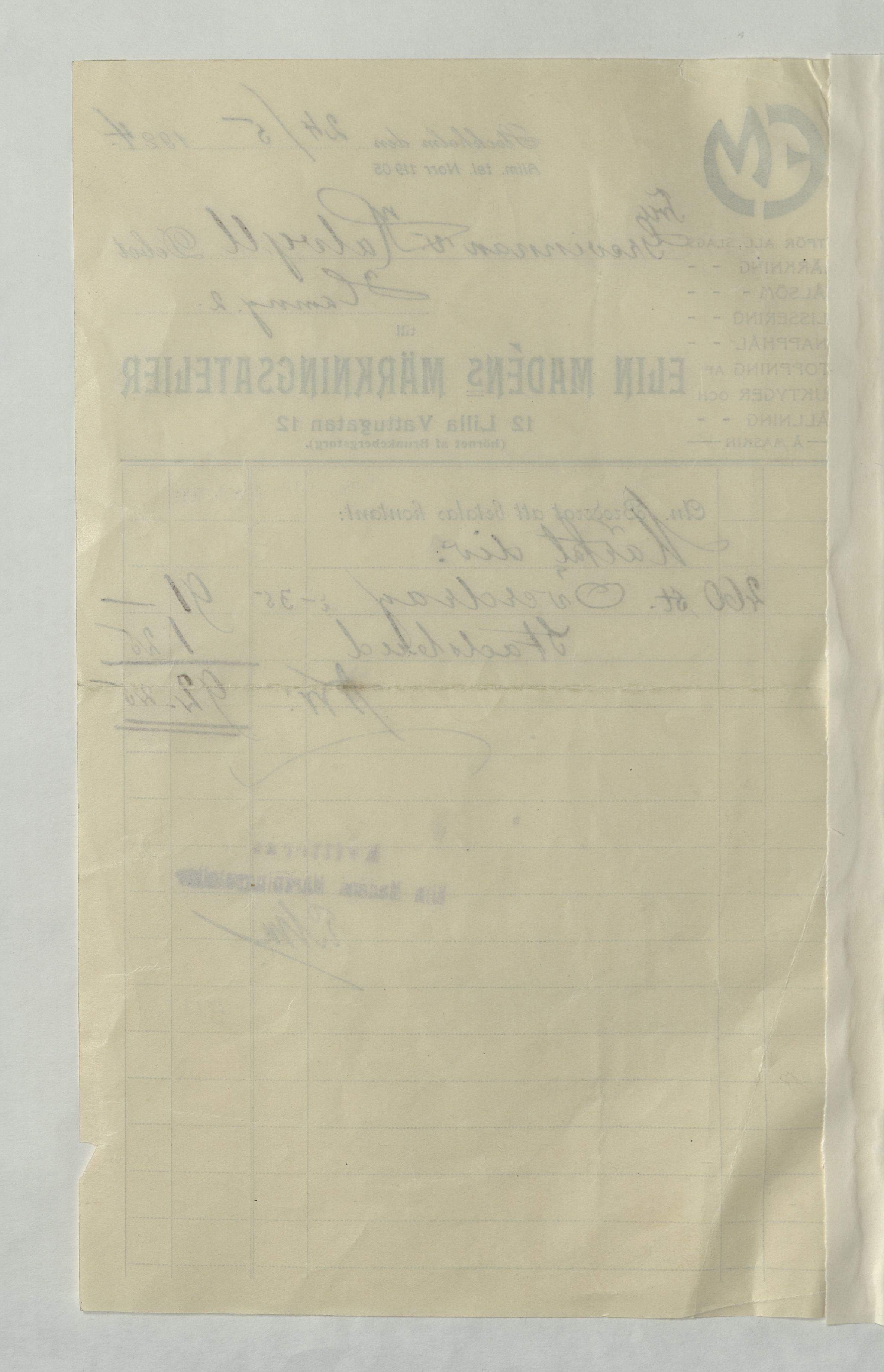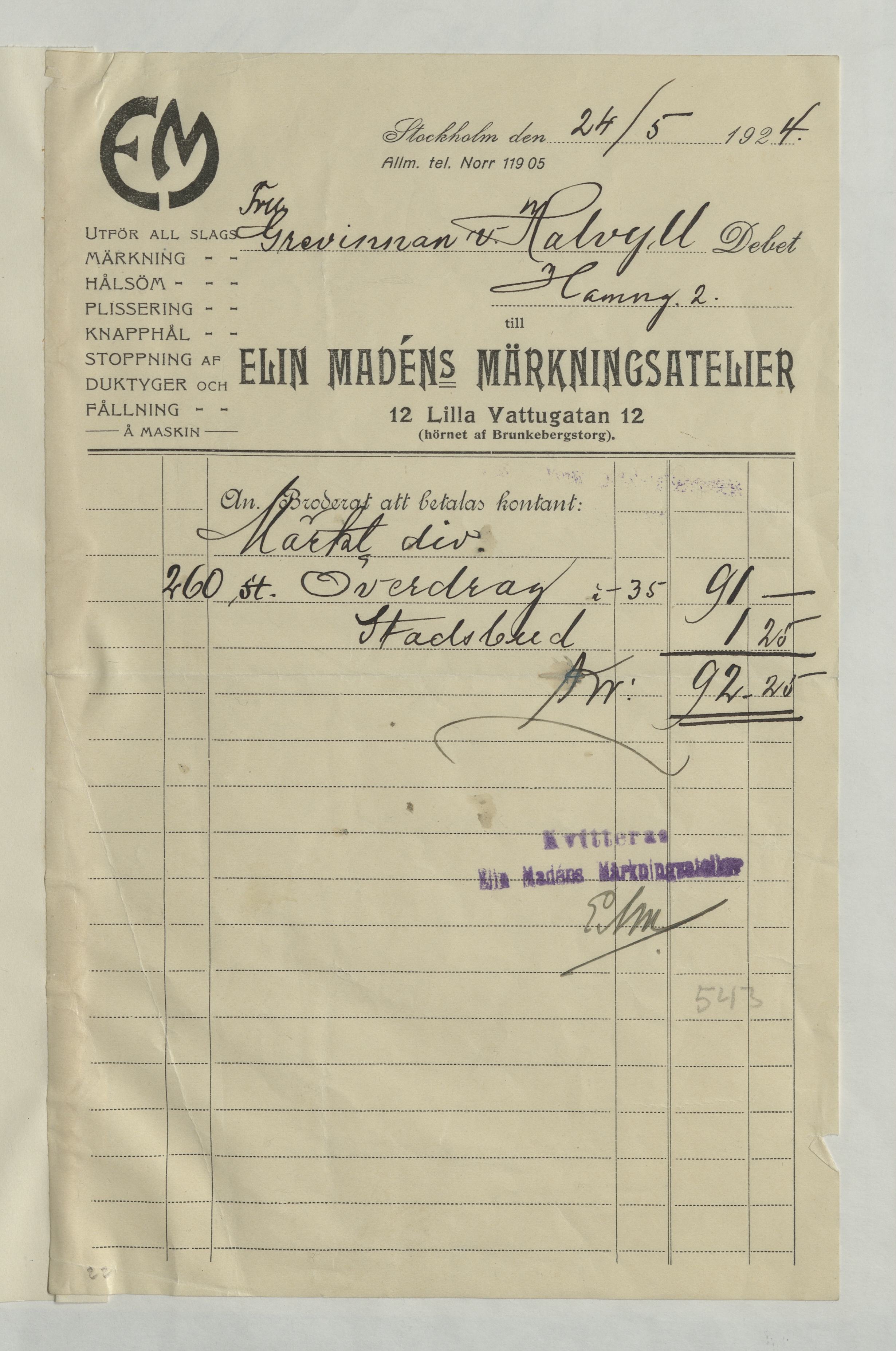 Kvitto från Elin Madéns Märkningsateljé till Fru Grevinnan von Hallwyl, Hamngatan 2. "Märkt div. Överdrag (260st)." Levererat med stadsbud. Totalsumma 92:25Kr. Stockholm 24 maj 1924.