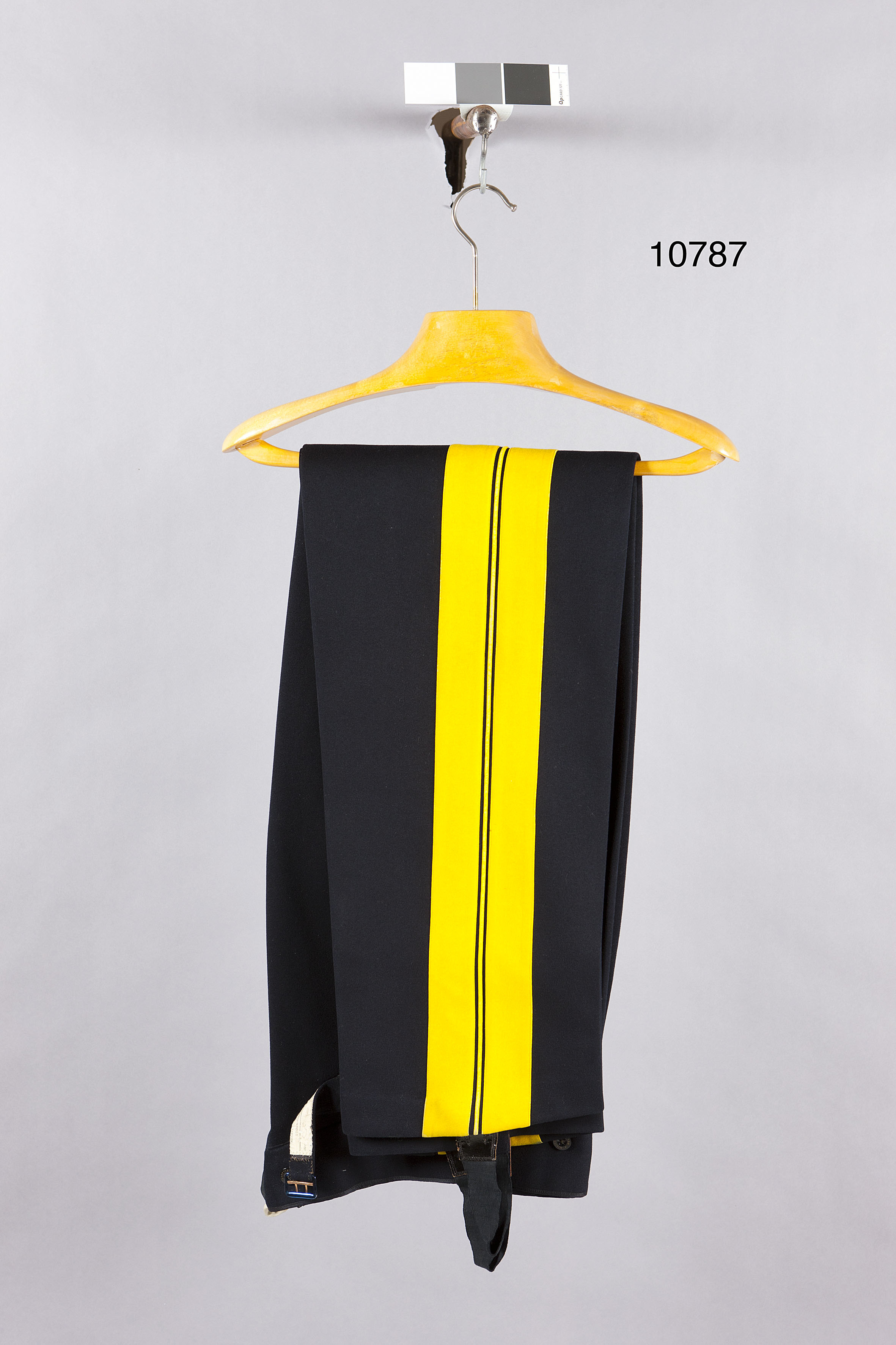 Långbyxor av mörkblått kläde, knäppta med gylf och sju knappar, d: 14 mm, med firmanamn:"MILITÄRBOLAGET". I linningen åtta likadana knappar. I sömmen mitt bak infälld kil av svart sidendär nedanför spänntampar med blånerad sölja samt text: "SOLIDE". Påinsidan av ena spänntampenfastsydd pappersetikett med text: "MILITÄR BOLAGET STOCKHOLM 19.2.98)) Herr H.K.H prins Carl". Enbakficka på h. sida knäppt med en knapp. Fickor i sidsömmen. Utmed denna två 40 mm breda galoner avgult kläde mellan dessa smal passpoal. Nedtill hällor av svart resårband fästade på byxbenensinsidor med dubbla knappar, d: 14 mm, samt bandet skott med rektangulär bit av lackskinn.