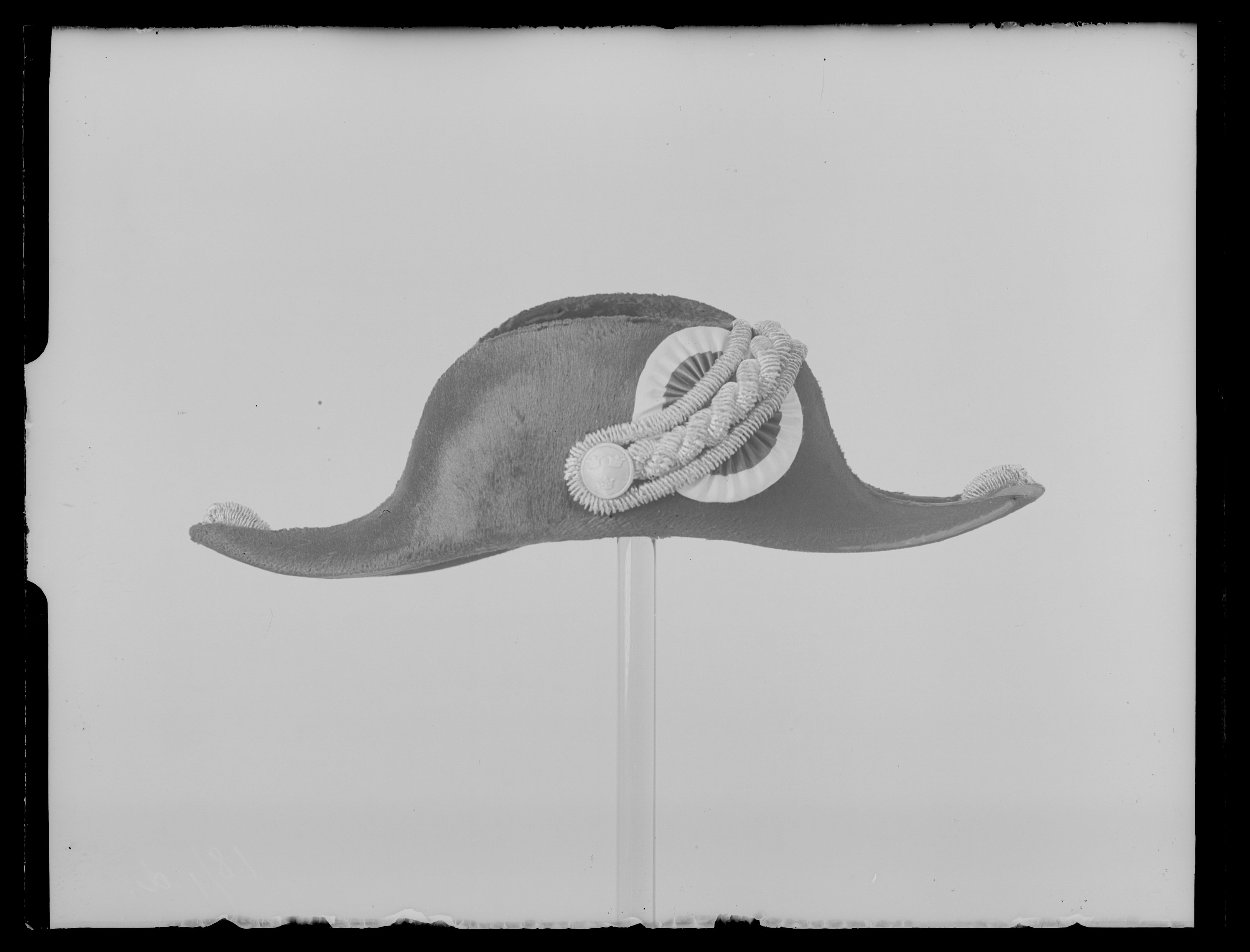 Bikorn av svart silkesfelb med blå och gul kokard samt silverbuljon och knapp med tre kronor. Hakrem av svart lackskinn. Foder av vitt siden med firmanamn i kullen: "A. ERICSSON & Co // STOCKHOLM". 50 mm bred svettrem av ljusbrunt skinn.