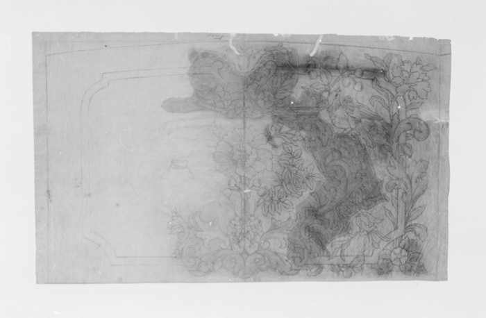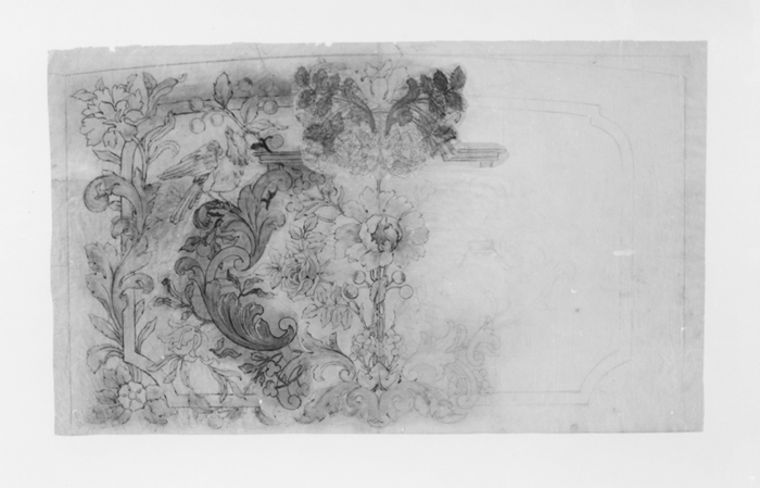 MÖNSTERFÖRLAGA, till möbelklädsel. Utförd på papper samt tecknat med blyerts och färglagt, utgörande ryggdel till soffa inv nr Gr VI:II:A.a.12. (för beskrivnining se Hallwylsak samlingen, Gr VI;text, s. 345 f.f.). Motiv med rosor, bär, fågel i grönt, rosa och gult. Påskrift: "mitt, 45 cm" Mått: H 49,5 cm B 82,3 cm Gåva 1943 av arkitekt Gustaf Clason (se protokoll 54 º 4)
