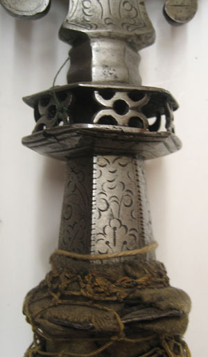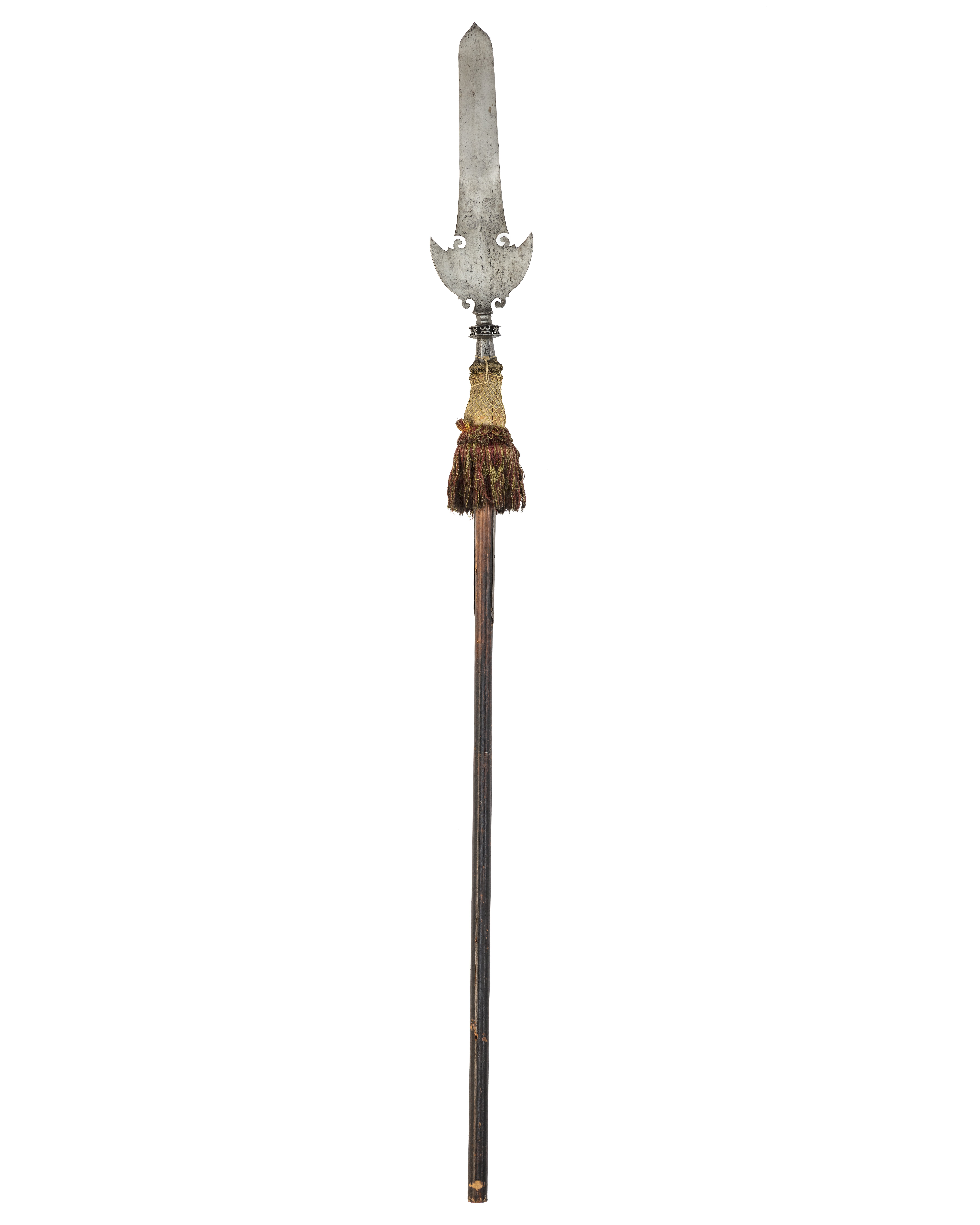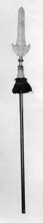 Klinga av stål med etsad dekor, på vingarna svenska riksvapnet, under lejonen årtalet 1646, årtalet tydligt på ena sidan. På klingan en över två kungliga kronor samt namnchiffer R C S. Sexsidig, balusterformig hals, l: 18 mm, med holk, l: 77 mm med krans av två sexsidiga skivor, förenade av sex genombrutna plattor. Holken sexsidig, med punsad bladdekor. Holken fäst vid skaftet med två stålskenor med konturerade ändar målade i skaftets färg. L 275 mm, den ena 15 mm kortare. Fästade med tre spikar resp tre spårskruvar. Skaft, L 1280 mm, av brunbetsat trä med cirkulärt tvärsnitt, diam 34 mm. Tvärt avslut. 275 mm från nedre ände ett genomgående hål.