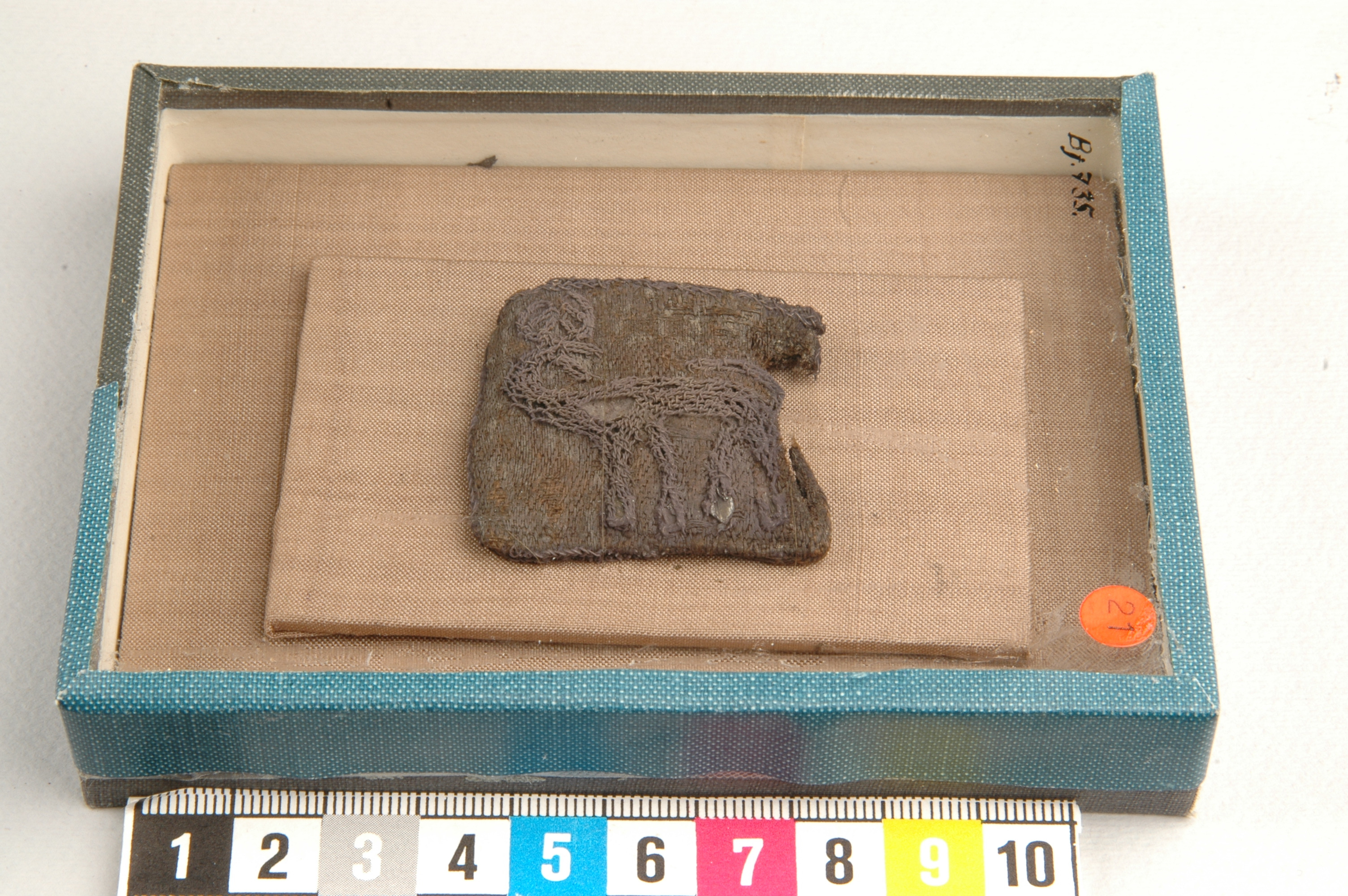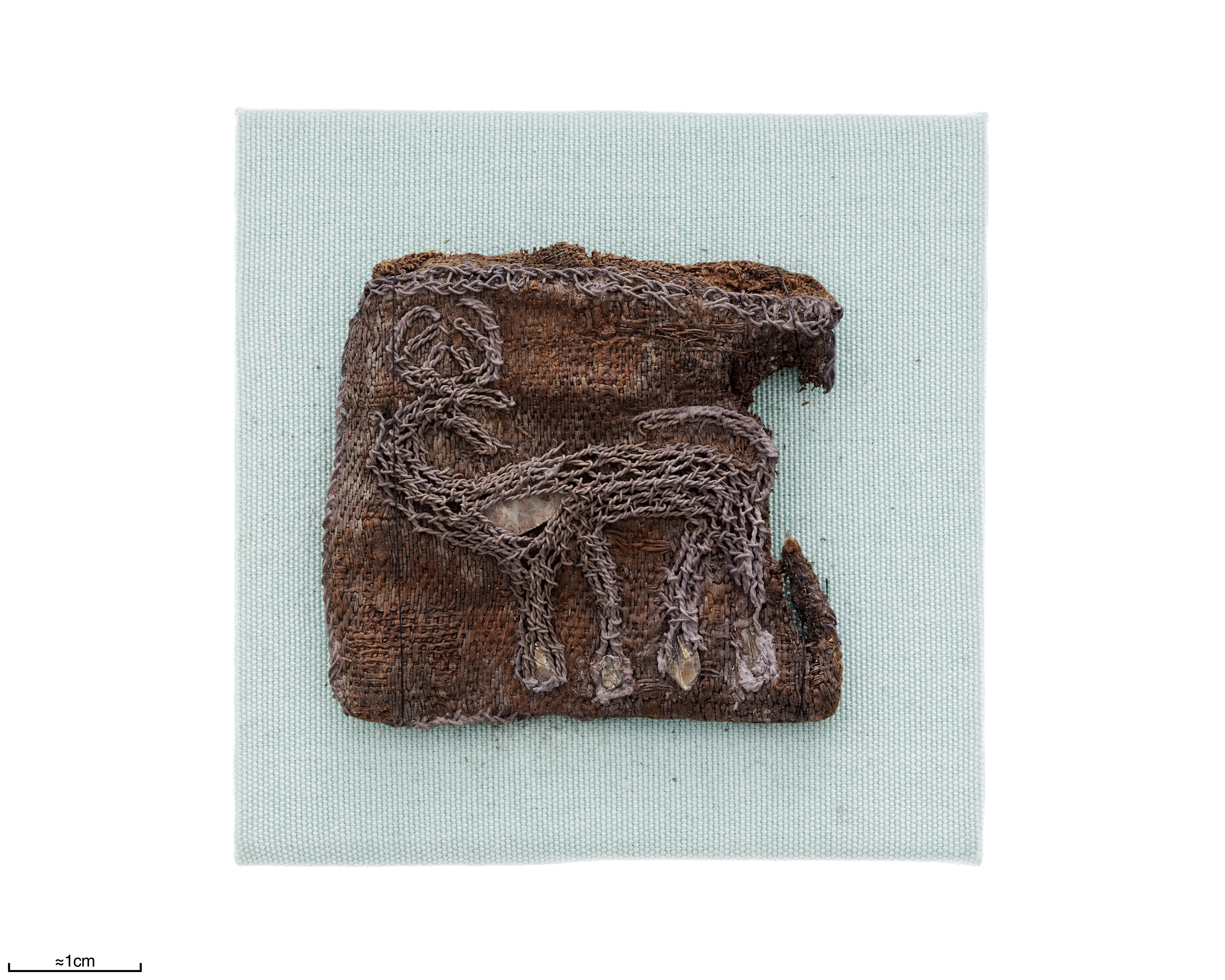 ”Silverhjorten”. Broderad ändbit [gesticktes Endstück"] av något band. Nu som en fyrkantig påse av silke vävt i kypert (S 4) med sömmar i kanterna. Båda sidorna är på samma sätt dekorerade med en bakåtblickande hjort, tillverkad av tunn silvertråd i slingstygn ["Schlingenstich"] (schema a och b) och inläggningar av glimmerbitar, ungefär som ”Guldhjorten”, St 16. Mönstret skiljer sig dock något. Huvudet är mindre, den enda hornspetsen saknas, svansen är lång och ligger över ryggen. Hela djuret är platt och tillverkat med samma teknik. Längs alla kanter på ändstycket löper en dubbel rad av öglesömmar (fig. 25 c) som också döljer sömmen. Spår av annan kantdekoration saknas. Överst sticker siden ut cirka 2 till 3 mm över sömmen, där den möjligen har fortsatt. Föremålet är defekt på ena kanten.