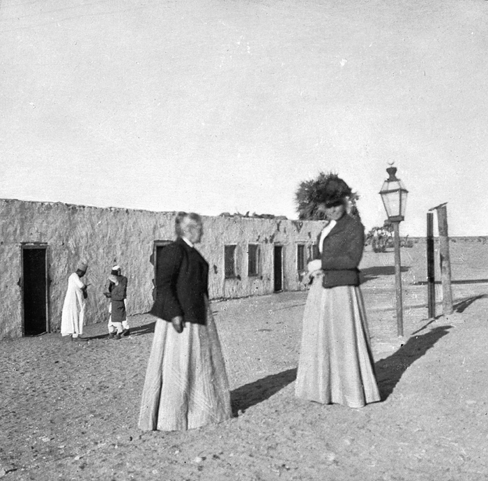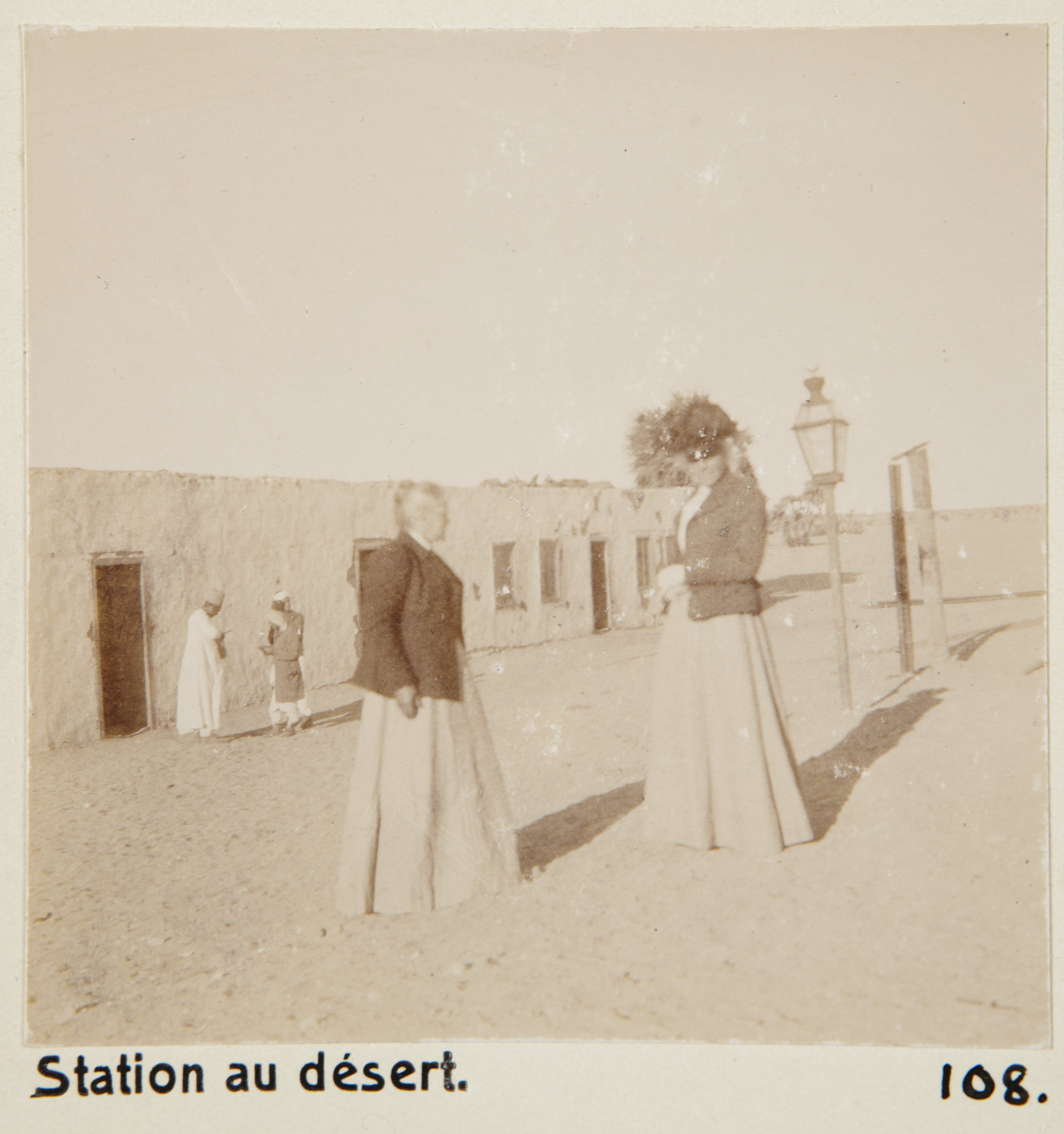 Tågstation i öknen. Sudan. Text på fotografiet: Station au désert Fotografierna LXVI:M.01.- 201. kommer från resan till Egypten och Sudan som Wilhelmina och Walther von Hallwyl gjorde vintern 1900-1901. De lämnade Sverige den 5 november 1900 och fortsatte från Egypten till Palestina den 28 mars 1901. Med på resan var döttrarna Ellen med maken Henric de Maré och Irma med maken Wilhelm von Geijer. Wilhelminas sällskapsdam, fröken Ida Uhse reste också med. Under en del av resan anslöt sig ledamoten av Internationella domstolen i Kairo, assessorn Otto Conrad Waldemar Cedercrantz med makan Anna Elisabeth. Vid resan uppför Nilen hade Walther von Hallwyl hyrt ångfartyget Columbia med besättning. Båtresan startade i Kairo 27 december 1900, gick ända till Wadi Halfa varifrån man reste vidare med tåg till Khartum och tillbaka till Wadi Halfa. Båten vände åter i riktning mot Kairo, men det verkar som att sällskapet tog tåg sista biten, från Luxor. Henric och Ellen de Maré samt fru Cedercrantz lämnade båten redan då de passerade Luxor första gången. Resten av sällskapet återvände till Kairo den 1 mars. Fotografierna LXVI:M.01.-120. togs av resenärerna själva, de största av Ellen de Maré, de mellersta av Wilhelmina von Hallwyl och de minsta av Wilhelm von Geijer. Resten köptes av professionella fotografer i Kairo, de flesta från Studio Photogr. Artistique G. Lekegian & Cie. Alla uppgifter kommer från Ida Uhses reseanteckningar.