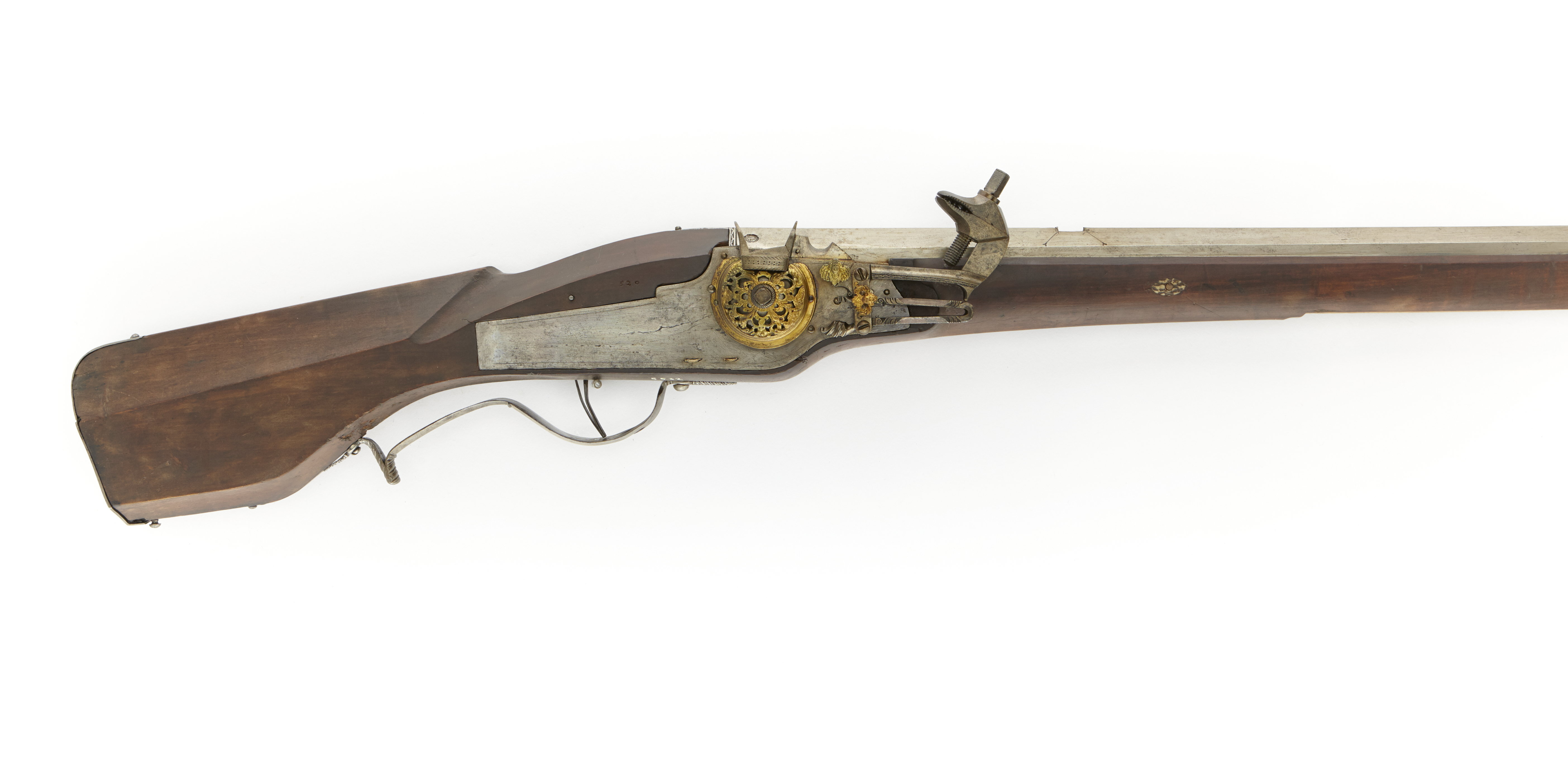 Sexkantig svinryggspipa. Slätborrd. På kammaren två gånger Elias Pedersens mästarstämpel slagen i silver: "EP över ankare (Stöckel nr 2442). Sikte saknas. Från siktets vardera hörn utgår ett inslaget streck, avslutat i pil. Knoppkorn av mässing. Siktränna från korsskruv till korn. Tre piphäften. Hjullås. Blånerat låsbleck av stål - bakåt avsmalnande genom två fall. Låsblecket baktill rakt avskuret. Kullrig hjulkapsel av förgylld och genombruten mässing. Änglabyst av mässing på tryckknapp och hanstudel. Låg, rundad krutskärm. Hane med lös underkäke. Hel stock av ljust trä. Muskötliknande kolvtyp, kantig med rundad anslagssida. Bakplår av stål, med undre delen gångjärnsförsedd - fungerar som lock åt kolvlådan vilken har två fack som är läderfodrade. De båda låsskruvarna och de tre pipstiften har brickor av hjorthorn. Näsband och rörka av hjorthorn. Varbygel av stål, böjd som karbinvarbygel. Tillbehör: Laddstock med balusterformig doppsko av stål, med holk och skaftskenor. Märkt: 520 ovanför låsblecket, stanstyp 5376. 1710 års inventarium p. 22, rum II (felaktigt numrerad 220) "6-220-1 D:o (Svinrygg) med blanck pijpa Hiullås och förgylt puckla - . . .-"