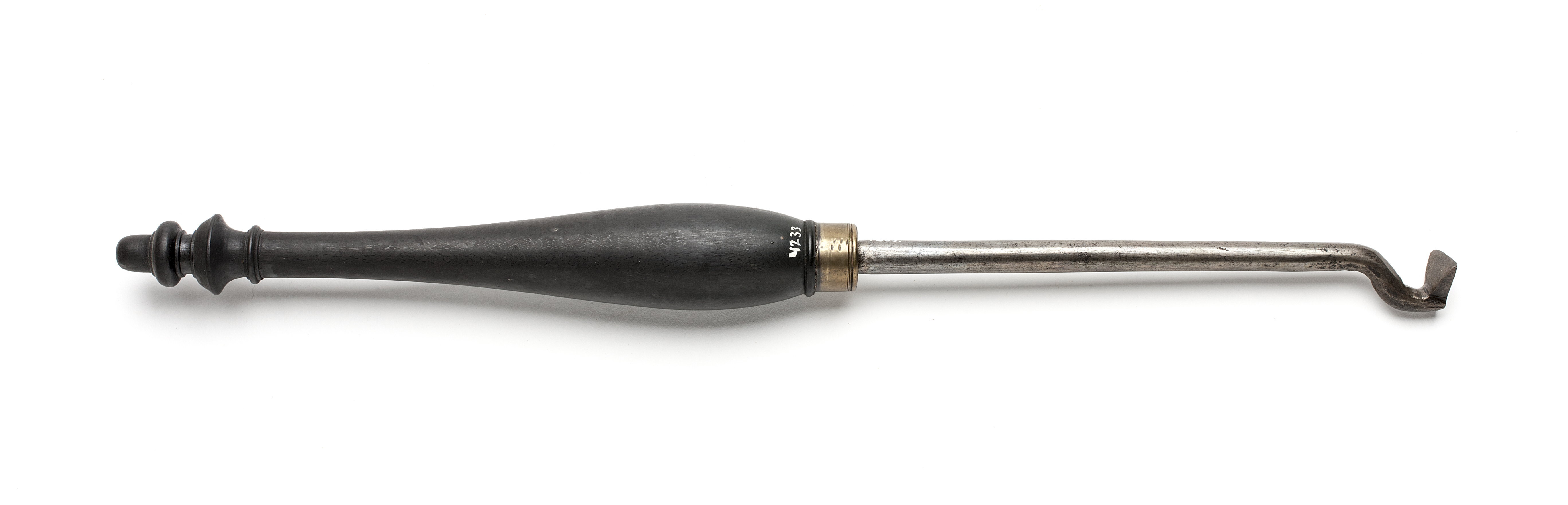Rund klinga. Vinkelställt triangulärt stål med främre egg. Svarvat skaft av ebenholts med profilerad ände, mässingsring. Funktion: invändig slätsvarvning. Stämplat på klingan: fisk.