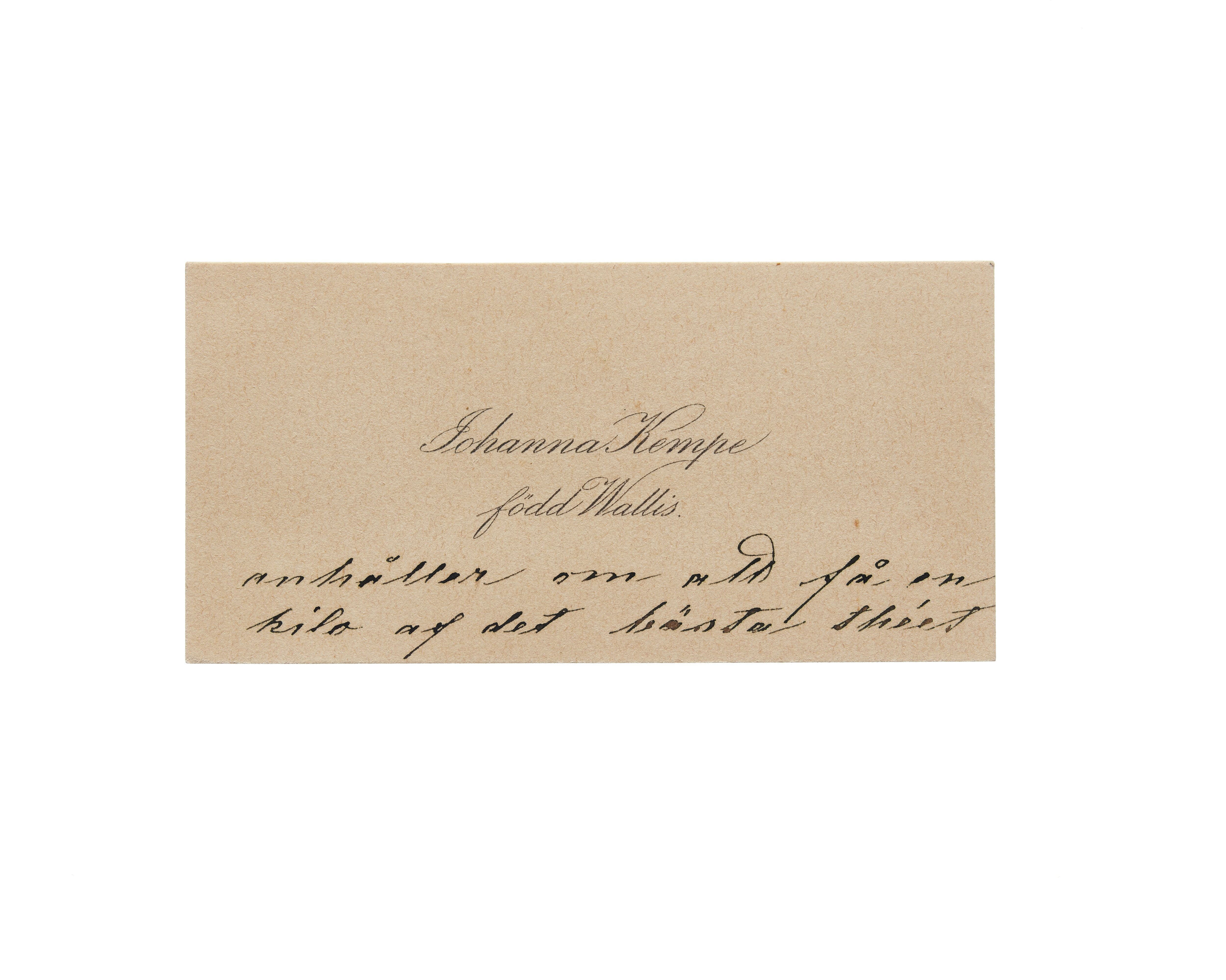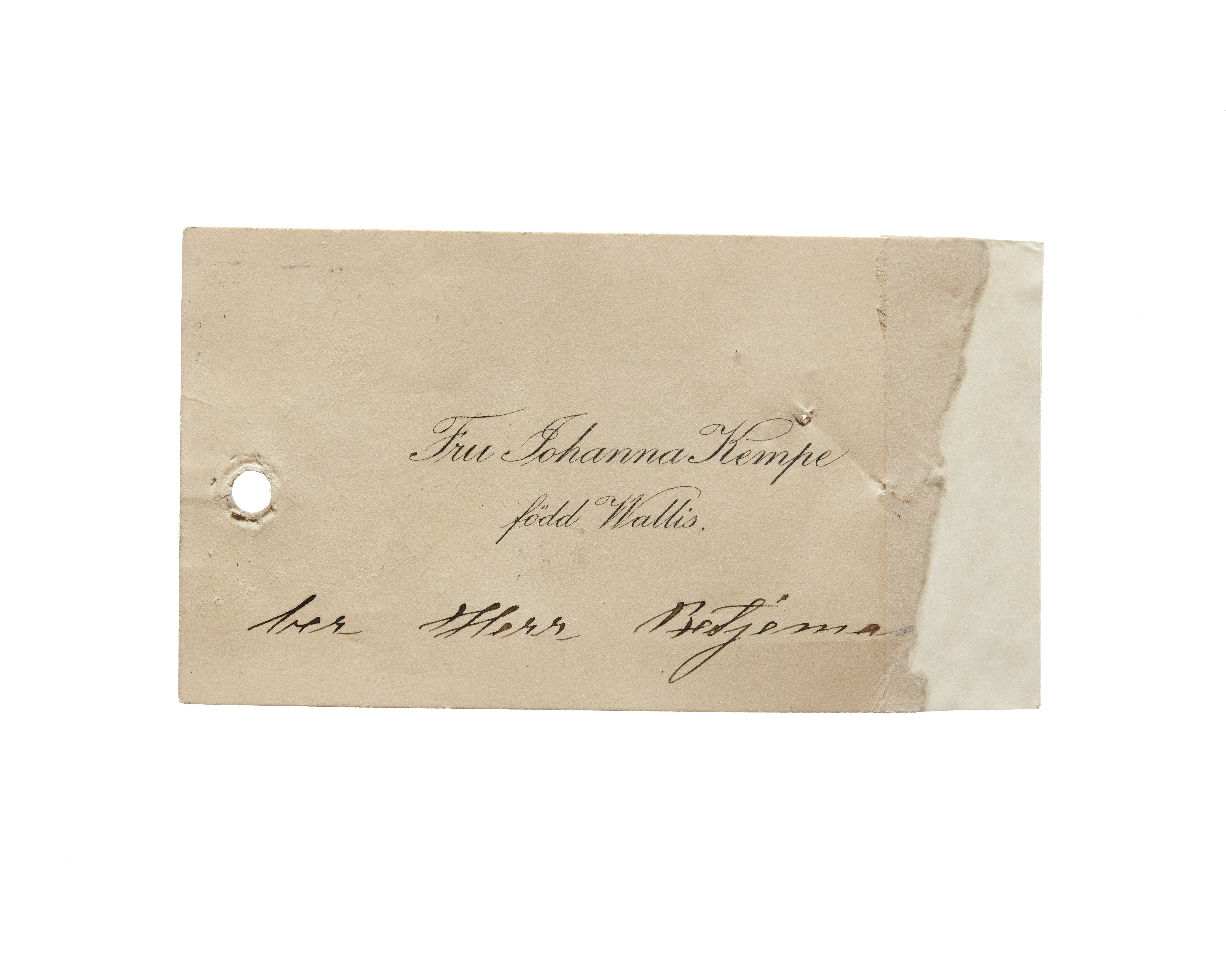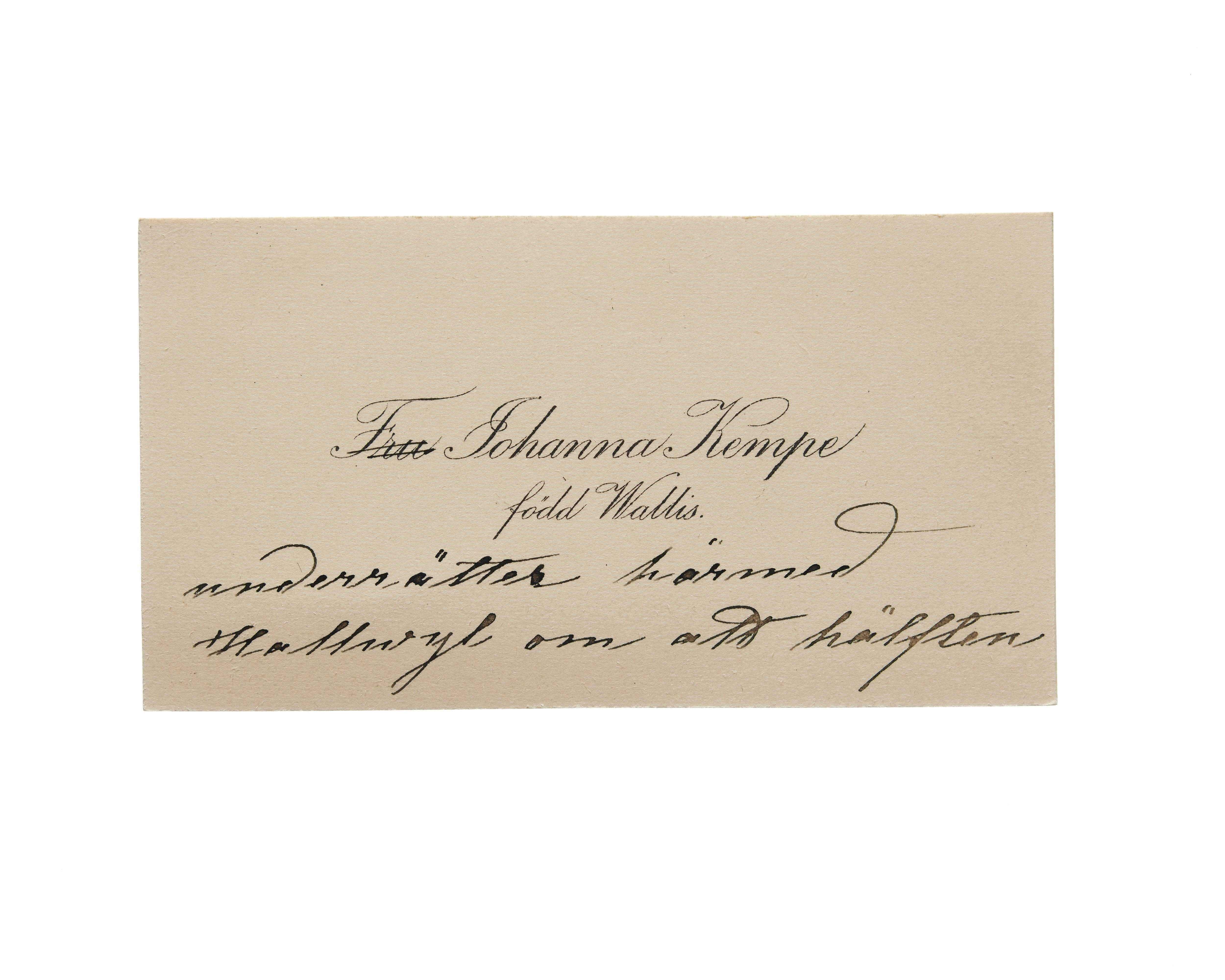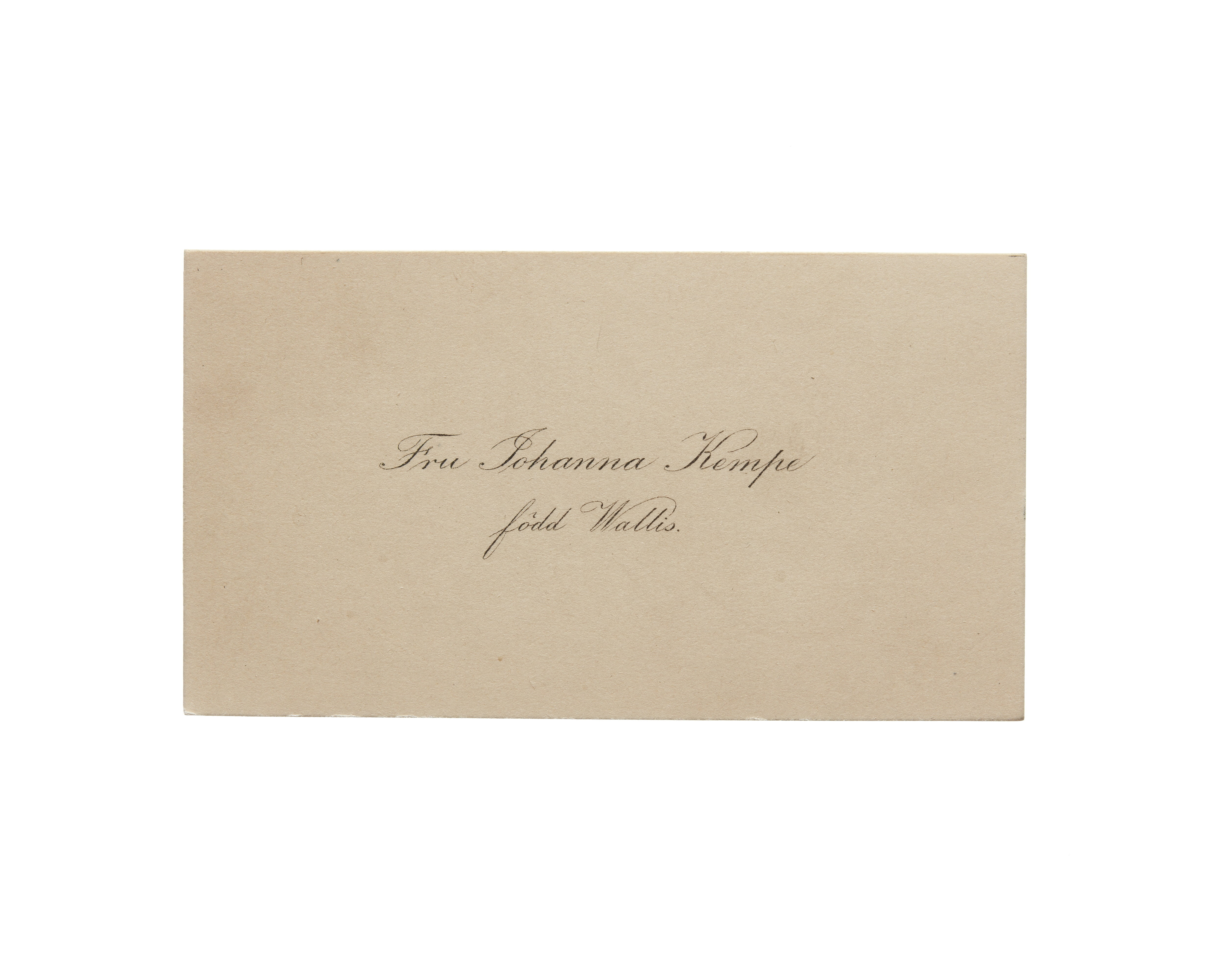 Sju visitkort från Johanna Kempe, f. Wallis. Första kortet är utan datum. Andra kortet är utan datum. Handskrift "...". Tredje kortet är utan datum. Handskrift "...". Fjärde kortet är utan datum. Handskrift "...". Femte kortet är utan datum. Handskrift "...". Sjätte kortet är utan datum. Handskrift "...". Sjunde kortet är två kort som tejpade ihop, utan datum. Handskrift "..."..