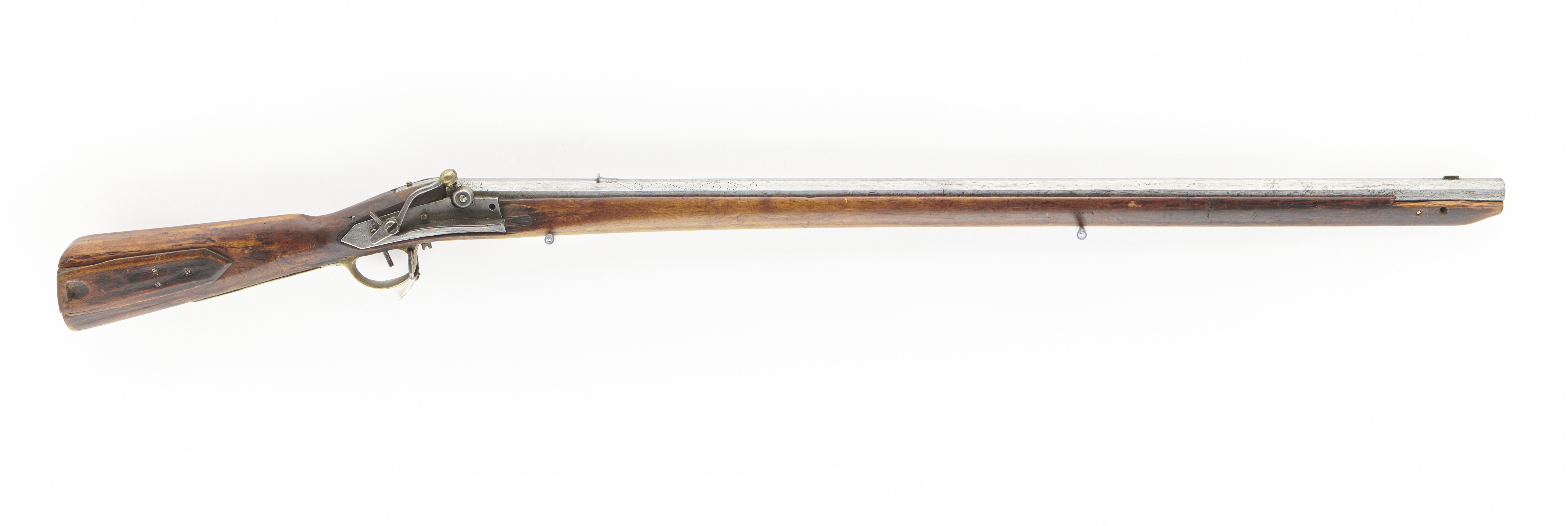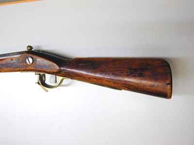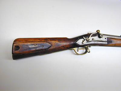 Åttsidig pipa av stål, framåt svagt avsmalnande. Strax framför kammaren på de tre övre faserna inpunsade rankor. Snäckan (kaggen) med avrundad kant samt avbruten plunderskruv. Riktmedel: Infilad siktskåra från svansskruvbladets mitt till 90 mm in på kammaren. Inlaxat ståndsikte av stål. Långt, trapetsformigt korn av mässing. Fästning: Ett häfte. Pipan fäst med krysskruv underifrån samt ett pipstift i form av en spik. Slagsnapplås av nordsvensk typ, ändrat från snapplås till slaglås. Låsblecket bakåt avsmalnande med svängd nederkant, baktill avslutat i en spets. Framtill är blecket snett avskuret. Hane med svagt välvd hals och kulformigt slaghuvud av mässing utan skåra, fyra runtom löpande cirkellinjer. Utanpåliggande rak studel fäst med skruv med stort, cylindriskt huvud. Slagfjädern mycket bred. Stång- och stångfjäderpå låsbleckets insida. Fästning: En kraftig låsskruv med stort, platt huvud. Avtryckaren fyrsidig. Helstock av björk(?) av nordsvensk tillverkning. Kolv med droppformigt tvärsnitt, rundad undersida, plan kolvrygg med antydan till näsa. På kolvens h. sida en kolvlåda med lock fasthållet av en bladfjäder fäst med tre skruvar. Helt sluten laddstocksränna. Stocken saknar beslag, förutom den kraftiga varbygeln av mässing, i framstolpen fäst rembygel av stål.