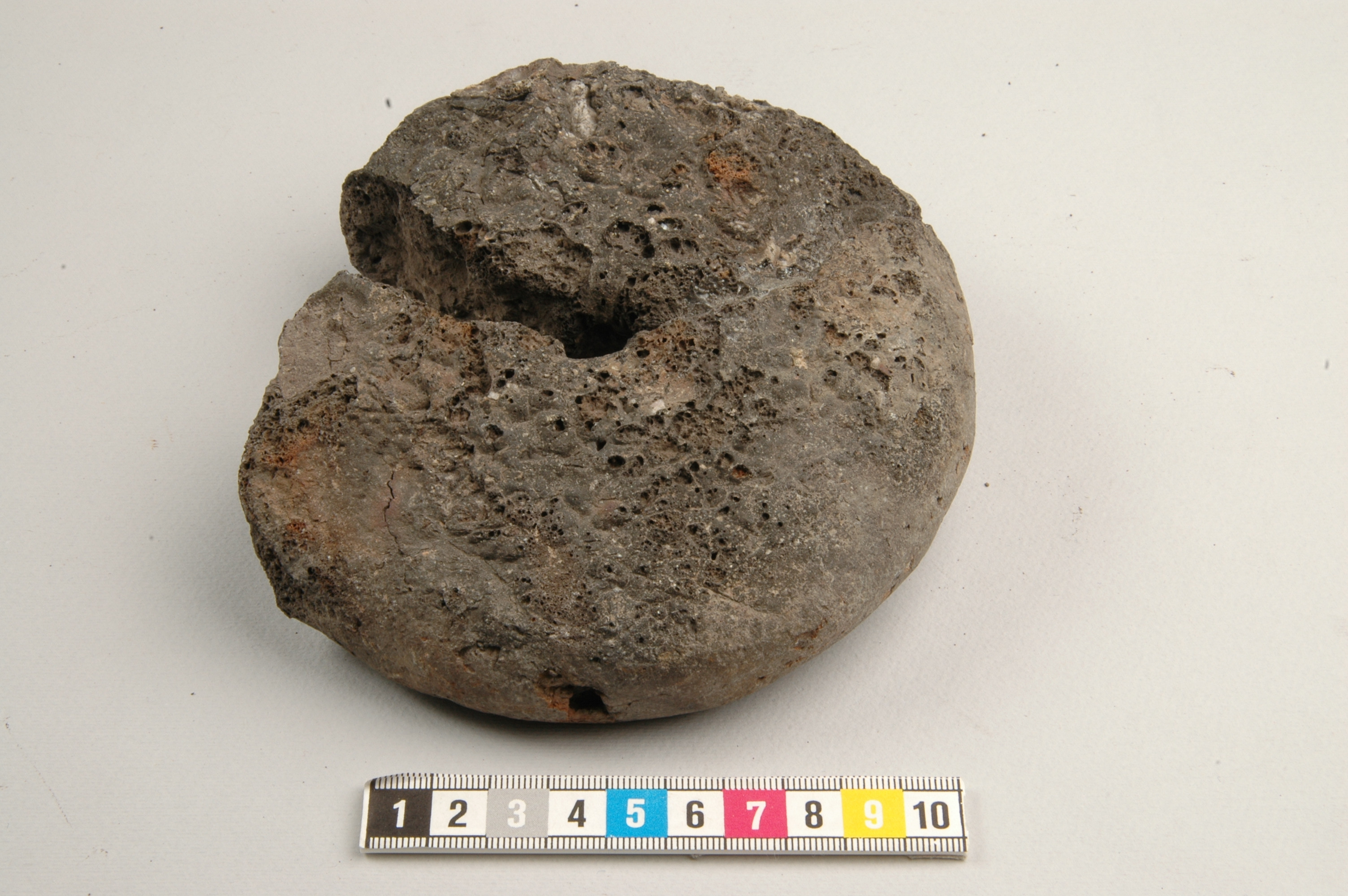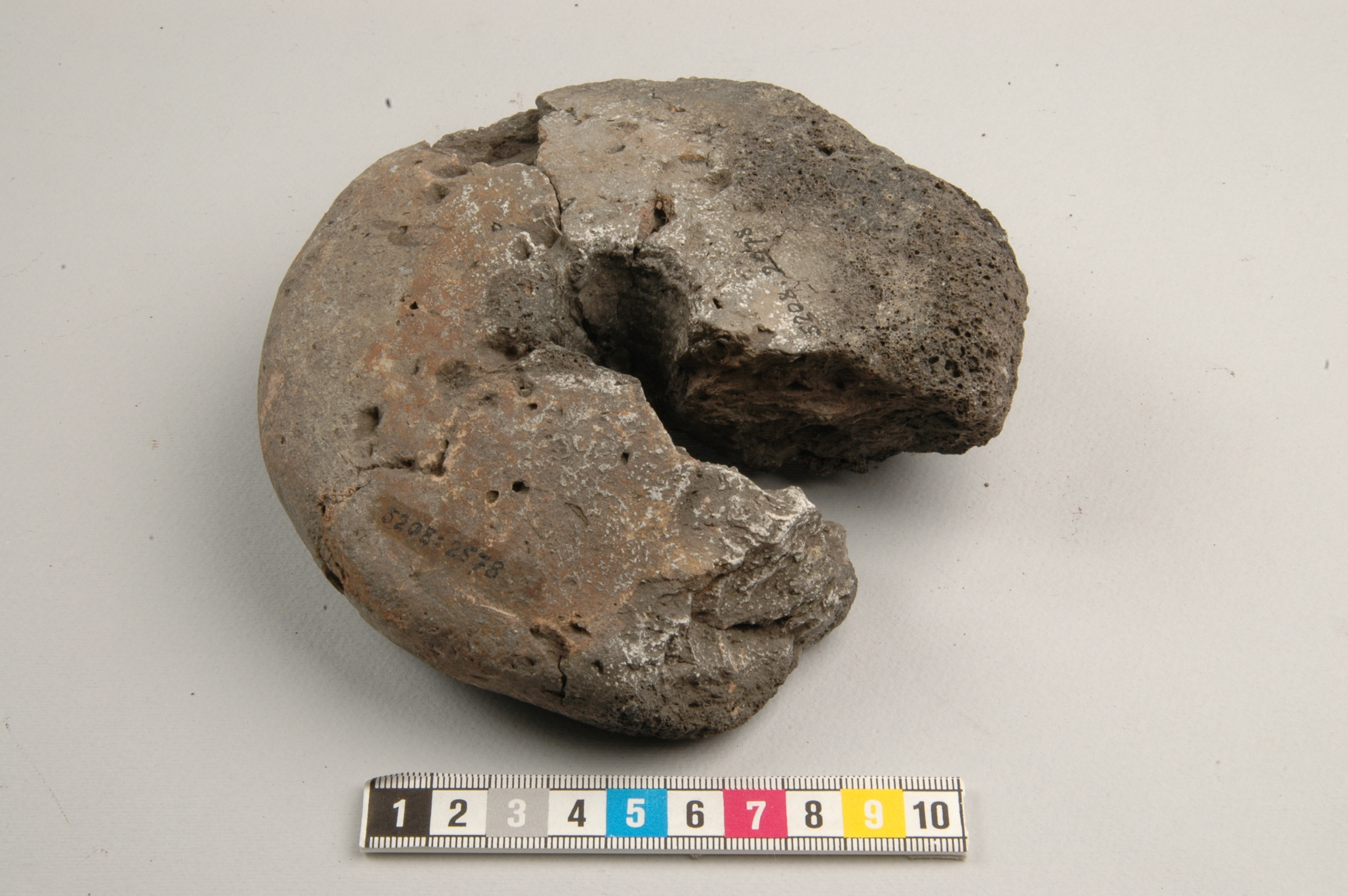 Koniskt inblåsningshål, ca 20 resp 11 mm i diam. Förslaggad på insidan.