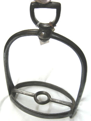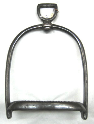 Smidd i stål med mörk, blankpolerad yta. Välvd bygel. Skänklarna med cirkulärt tvärsnitt, nedåt ökande i bredd och allt mer plattade. Upptill i sidled rörligt remfäste av sköldformig ögla, vars hals löper genom ringformig öppning i bygeln. Nertill ovalt trampstöd bestående av två platta tenar ställda på högkant med övre sidan tandad. Mellan dem en stång med rombiskt tvärsnitt, i mitten utsmidd till cirkulär ring, diam 32 mm. Tillhörande rem av brunt läder. L 1400 mm, b 27 mm. I änden rektangulär sölja av blankt stål med rulle.