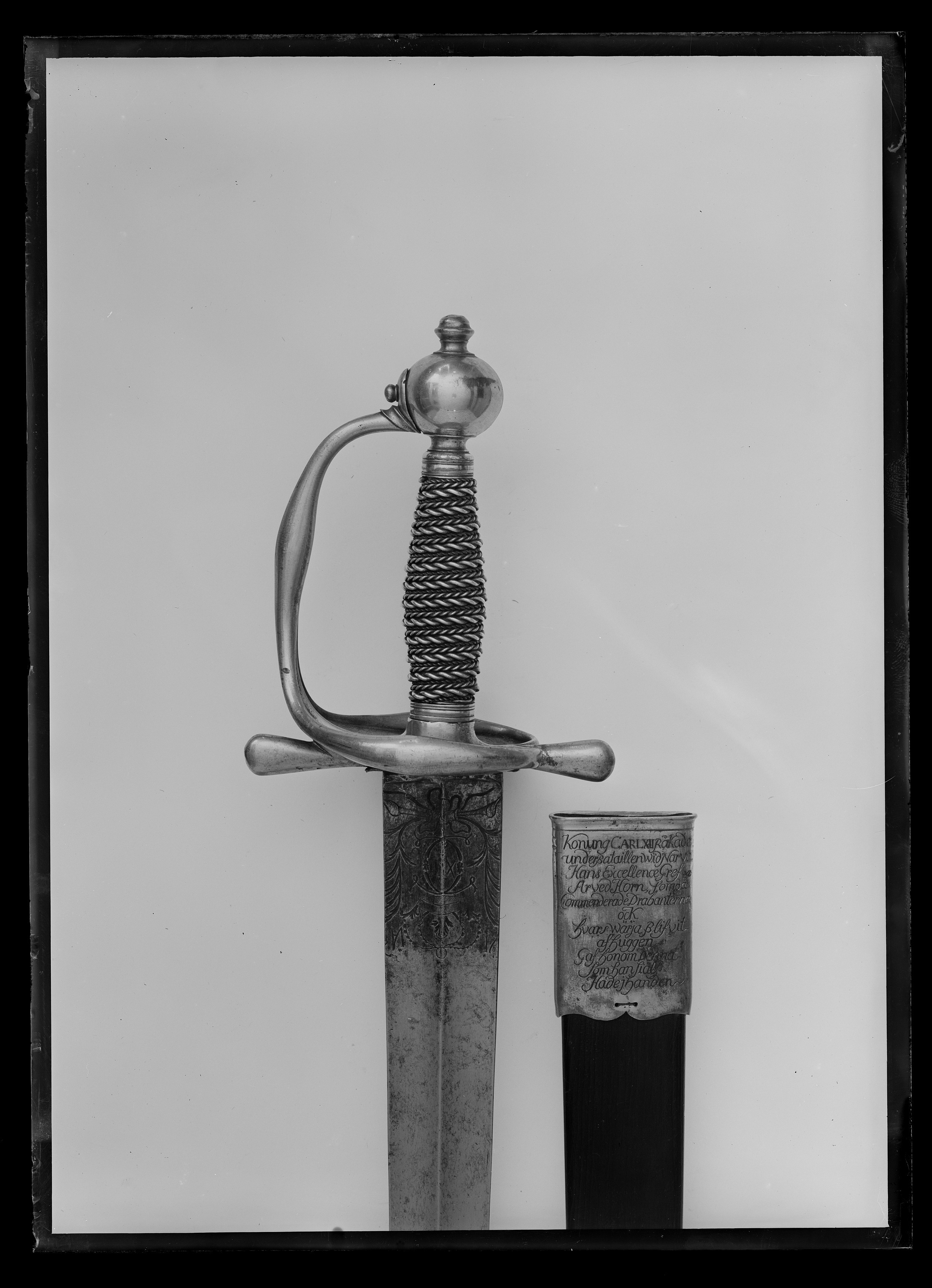 Kavalleriofficersvärja med ej ursprungligen samhörande klinga och fäste. Fäste Sverige ca 1750, anslutande till det karolinska drabantfästet, härvid närmast anslutande till fästet till ryttarvärja m: 1739 ehuru med tumbygel. Klinga Sverige ca 1706-1707. Fäste av slät, förgylld mässing. Kavellindning av tvinnad, tjock silvertråd, omväxlande med tvinnad, tunnare dylik. Klinga rak, förhållandevis bred, slipad med jämnbreda, mötande skär. Båda sidor av klingbasen förgylld och med etsad, graverad och punsad ornering i form av Karl XII:s krönta namnchiffer (spegelmonogram C, omslutande ordningssiffran XII), omgivet av två lyrformigt svängda palmkvistar, nedtill sammanbundna med en bandrosett. På båda sidor av kronan i ligatur: "VI // VA" (T - må han leva". Ovanför monogrammet spår av etsad ornering (bandornament?). Enlig inskription på munblecket till baljan skall värjan ha överlämnats till Arvid Horn av Karl XII när Horns värja blivit avbruten under slaget vid Narva. Baljan införlivades aldrig med samlingarna och bör ännu finnas i familjen Horns ägo.