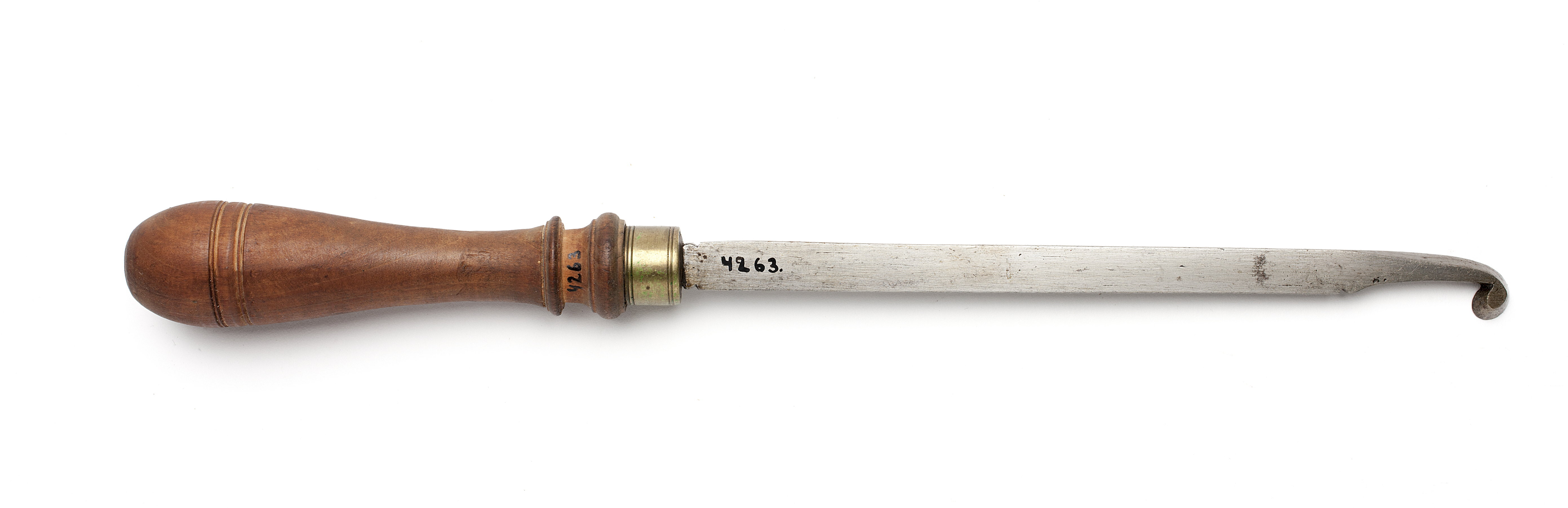 Klinga med rektangulär genomskärning och profilerad hals. Stämplat på klingan: hjärta under kors. Änden avsmalnande och svängd. Trekvartscirkelformad egg. Svarvat skaft av päronträ med två vulster nedtill ("rydboholmstyp"). Mässingsring.