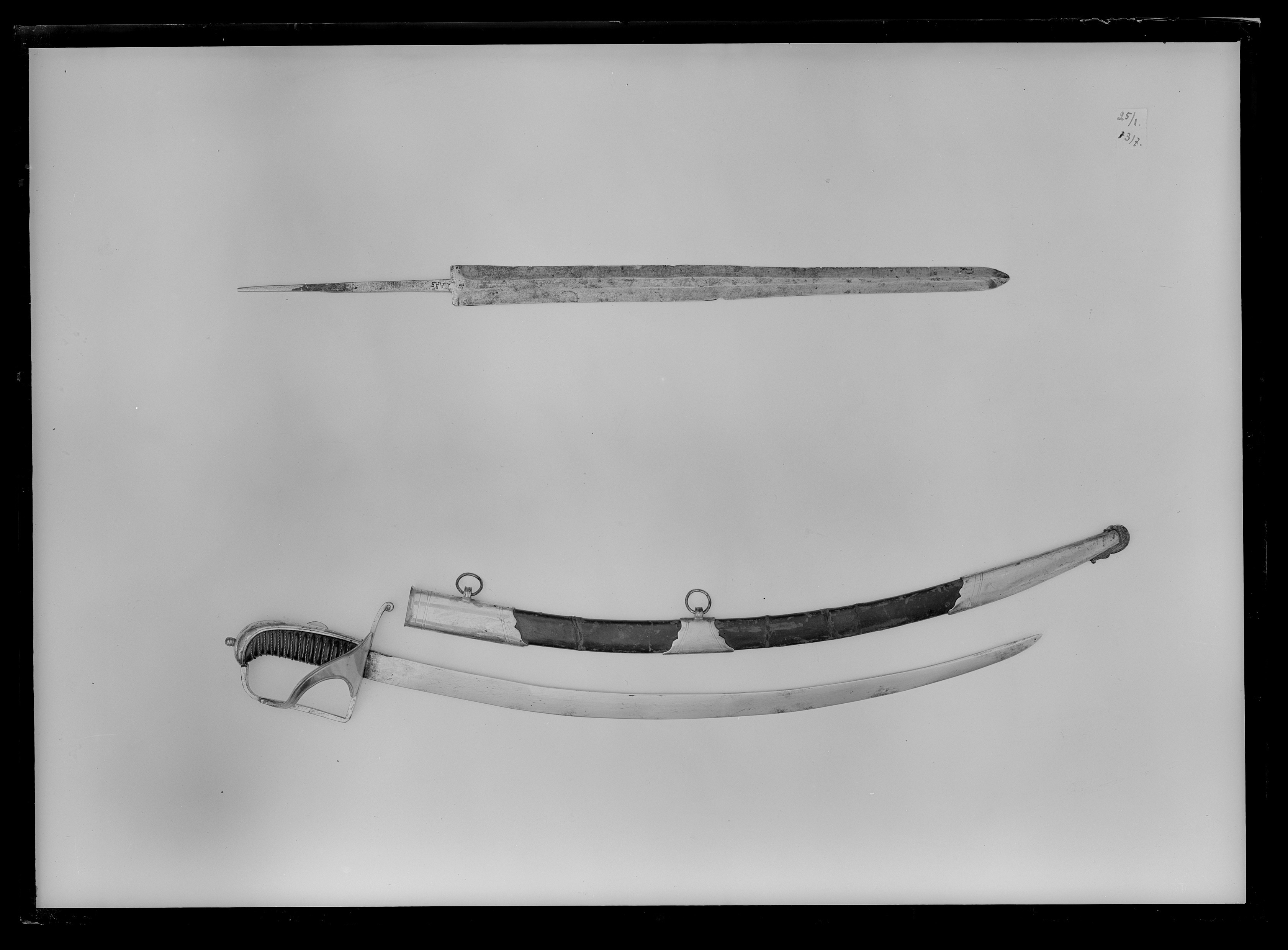 Fäste av förgylld mässing. På yttersidan triangulär parerplåt som övergår i handbygeln. Främre parerstången går i rät vinkel samman med handbygeln. Kavel klädd med läder, 15 tvärgående räfflor, vari sitter mässingstråd, tvinnad av två parter. Klinga böjd, eneggad.