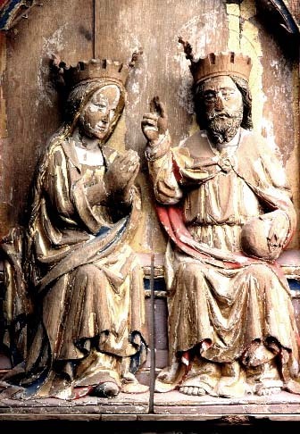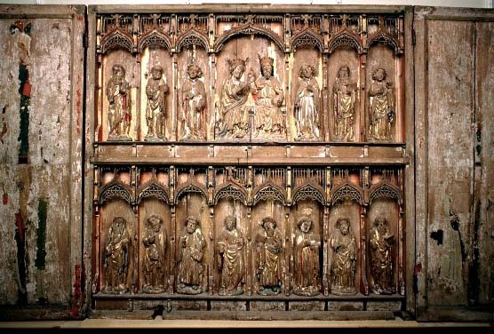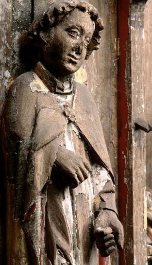 Kondition: händer, attribut och andra detaljer i betydande omfattning förlorade men för övrigt i god kondition. Färg: skulpturens polykromi mycket fragmentarisk och flyglarnas målningar nästan helt utplånade.