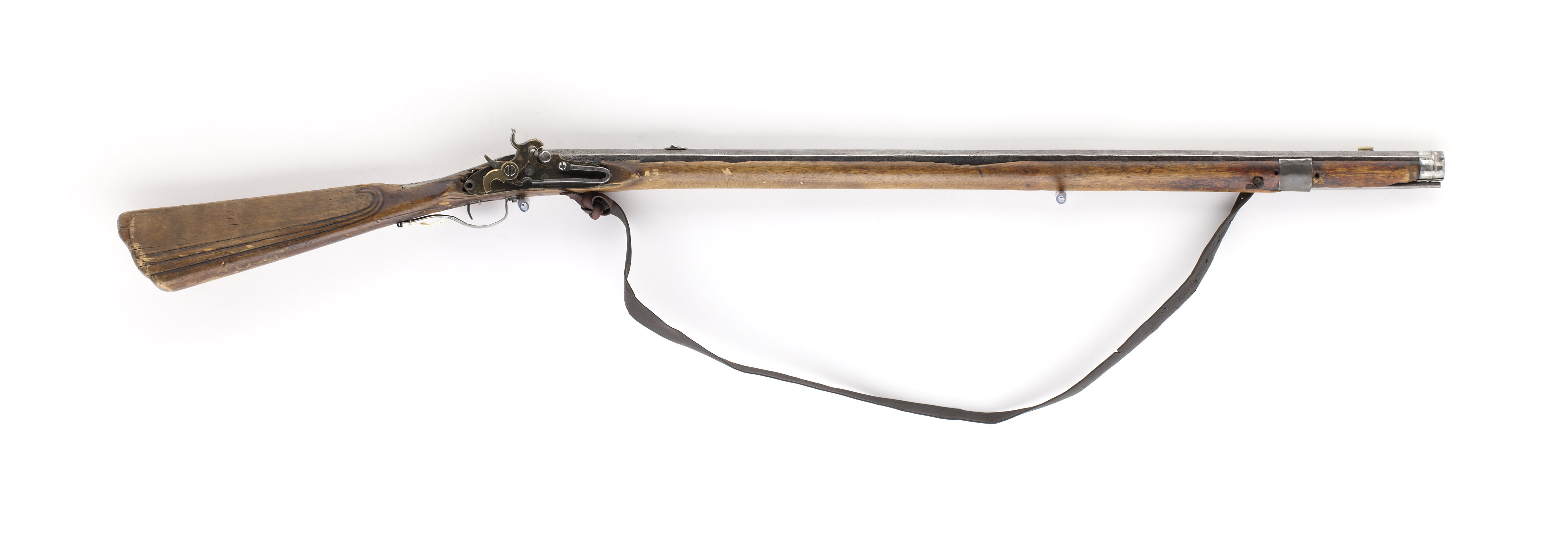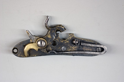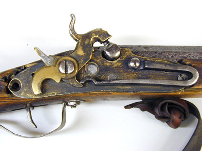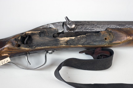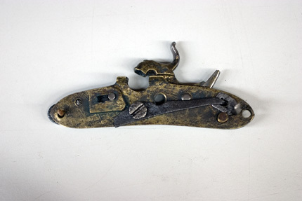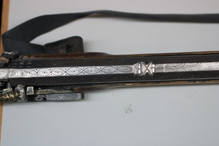 Slagsnapplåslodbössa, utfjäderslås, tåspännare, Lappland, 1800-talets mitt, pipa möjligen av N Lindberg i Drängsmark. Stock tillverkad av en stockmakare från Skellefte-trakten.