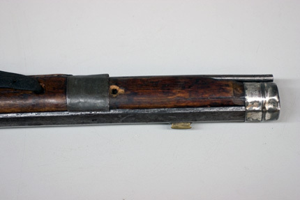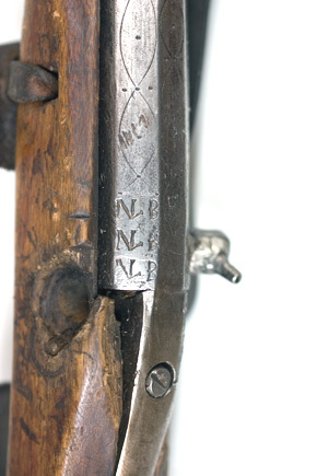 Åttsidig, sexräfflad pipa av stål, på kammarens ovansida och vid mynningen punsad dekor i form av korsande linjer som bildar spetsovala fält, vid skärningspunkterna tre punkter och mitt i fältet en punkt. Kammarens dekor övergår framtill i grenverk med punktavslutningar, mynningens avslutas med tre punkter. Långt, baktill skålat svansskruvblad. På kammarens v. sidofas tre gånger stämplat: N L B (NL ligatur, NV?). Cylindrisk tändhattssnäcka. Riktmedel: Inlaxat ståndsikte på rektangulär platta, X på foten. Långt stolpkorn av mässing. Fästning: Ett häfte. Pipan fäst med träskruv genom svansskruvbladets ytterände, krysskruv med mutter på stockens undersida samt ett pipband av stål runt mynningen, ursprungligen också med ett pipstift. Slagsnapplås med låsbleck av mässing. Hane av mässing med lång hål med stålförstärkning på ovansidan, kortare tå. Kropp med fyrsidigt tvärsnitt, huvud med profilerad översida, s-formigt, svängt grepp, ytterdelen av stål. Utvändig slagfjäder (ursprunglig?). Konturerad hanstudel. Invändiga låsdelar av stål. Fästning: Låset fäst med en kraftig skruv med femsidigt huvud från anslagssidan samt en mindre skruv genom låsbleckets framände i slagfjäderns bukt. Ursprungligen ytterligare en skruv genom låsbleckets bakände. Svagt böjd avtryckare. Hål i stocken utan skoning, framför avtryckaren inslaget en stoppbygel. Helstock av trä med lång, smal kolv med droppformig tvärsnitt, inskurna linjer på båda sidor, på anslaget en, på låssidan tre parallella linjer. Framstock med åsad undersida, sluten laddstocksränna, vid framänden ett stålband, b: 29 mm runt framstocken. Hål för bärrem (nr 16031) genom framstocken bakom bandet samt från anslagssidan till undersidan vid låsets framände. Bandformig, bakåt avsmalnande varbygel av stål, bakänden nedåt-uppåtsvängd till spets, inslagen i kolven. Tillbehör: Laddstock av stål, l: 807 mm, i ena änden vriden till en krats.