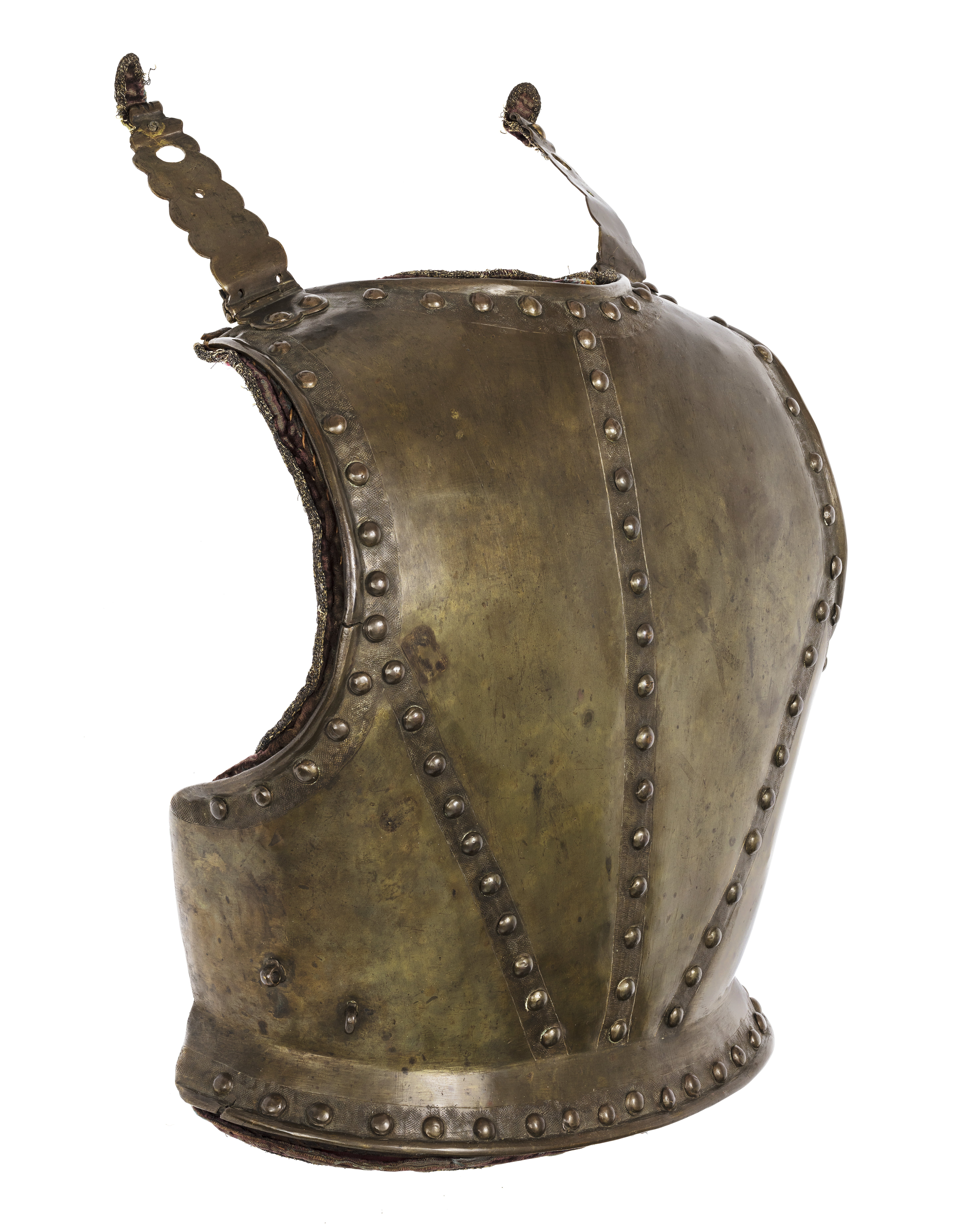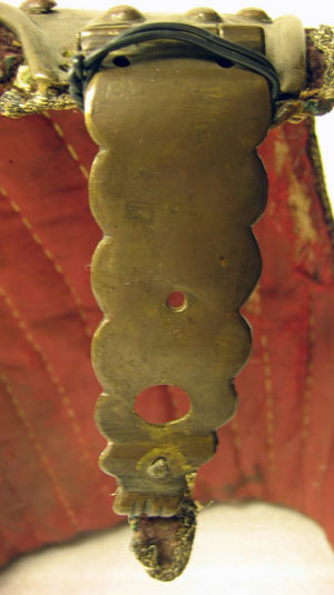 Driven mässingsplåt i ett stycke.Välvd, nertill avsmalnande över midjan med framåtsvängda sidor. Rundade urtagningar för nacke, b 140 mm, och armar, b 165 mm. Nertill krage, b 35 mm, vinklad snett utåt med rundad kant. Under armhålen, 50 mm från yttre kant, på vänster sida två och på höger sida en genomborrad konturerad ögla, l 8 mm. Över varje axel ett gångjärnsförsett spänne, l 115 mm, fästat med två nitar. Spännet utåt avsmalnande med konturerade, vågformiga, sidor, i främe kant med skurna linjer och i mitten två cirkulära hål, ett större och ett mindre. I änden ett lila sammetsband med kanband av metallomsunnen tråd. På insidan längs kanterna ett band av ljust läder. Heltäckande foder av rött siden med vertikalt ställda sömmr av ljusgul silkestråd. Kantband av lila sammet med bård av metallomsunnen tråd, fästat med vertikala sömmar av ljusgul silkestråd. Dekor: Runt nacke, armhål och längs kragens yttre del samt nedåt löpande från nacke och armhålor en bård av fint graverat rutmönster. I bården nitar i rad med kullriga släta skallar.