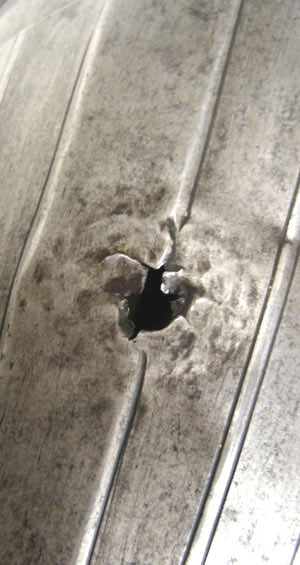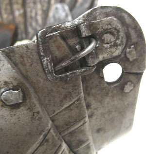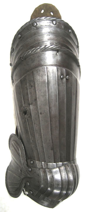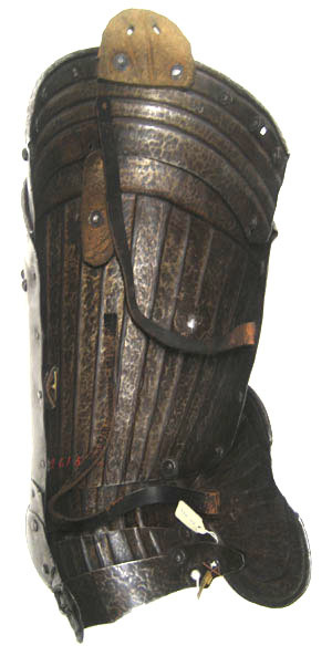 Driven räfflad stålplåt, sammanlagt sex delar. Lårpansar i två delar, en övre kortare en undre längre, fäst i varandra med nitar i sidorna och läderrem på insidan. Övre kanterna rundsmidda och repstavsfilade. Övre skenan med horisontella räfflor, den nedre med 30 mm bred slät bård och vertikal räffling, släta sidor. Upptill 68 mm bred sämskat läderbit med två hål. Knäbuckla med tre skenor, en upptill två nertill, fästade med nitar i sidorna. Vertikal räffling med släta kanter. 163 mm bred mussla, omvikt repstavsfilad kant, 14 mm slät bård, räfflor och insvängd kant. Nedersta skenan slät med hål i kanterna. På insidan 15 mm breda svärtade läderband mot utsidan och spänne med rektangulär ram av mässing mot insidan, på bucklan är spännet av stål och verkar ursprungligt. Anmärkning: Skada och två sprickor, L 20-10 mm, i översta lårskenan. Spricka i nedersta knäskenan. Ett spänne, remmarna och flera nitar utbytta. Märkt med rött 2615 k. Etiketter 2615 k, Lrk 24724. Enligt tradition Magnus Ladulås rustning. Tidigare upptagen under Magnus Ladulås rustning och under 1800-talet utställd i Riddarholmskyrkan i den sk kungalängden med rustningar som påstods ha tillhört regenter från Birger Jarl till Gustav II Adolf.