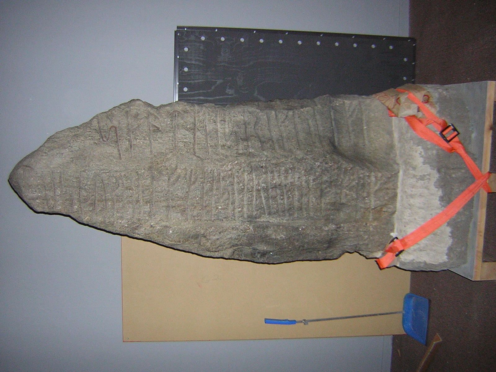 Runsten med texten "Efter Härjulv (är stenen rest). Halv Hjorulvsson ristade dessa runor". Äldre runor. Texten på stenen lyder: "Efter Härjulv (är stenen rest). Halv Hjorulvsson ristade dessa runor".