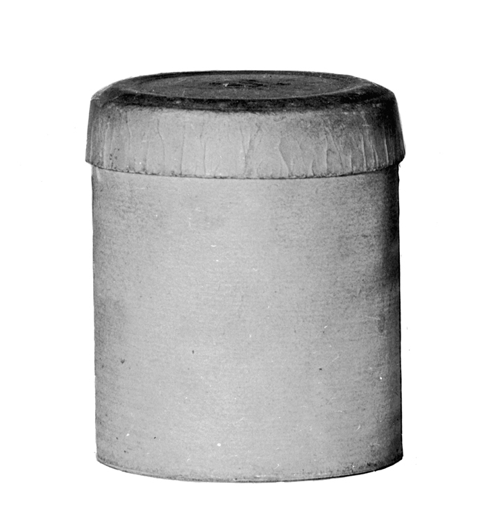 PEPPARBURK Av brungrå papp. Cylindrisk, med trycklock och djupt insänkt botten. Lock plant, med utanpågående sarg, på översidan kring kanten en stav. I burken hela kryddpepparkorn. Lock plant, med utanpågående sarg. Höjd: 8,3 cm.; diameter: 7 cm.